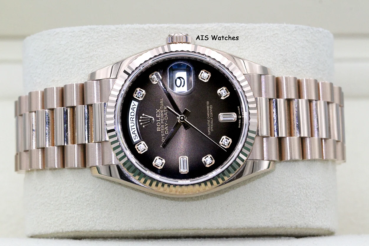 Up for sale is a Rolex 128235 DayDate 36MM DD36 EverRose Gold Brown Ombré-Diamond Dial Box & Paper Box & Papers. The timepiece is in excellent condition.