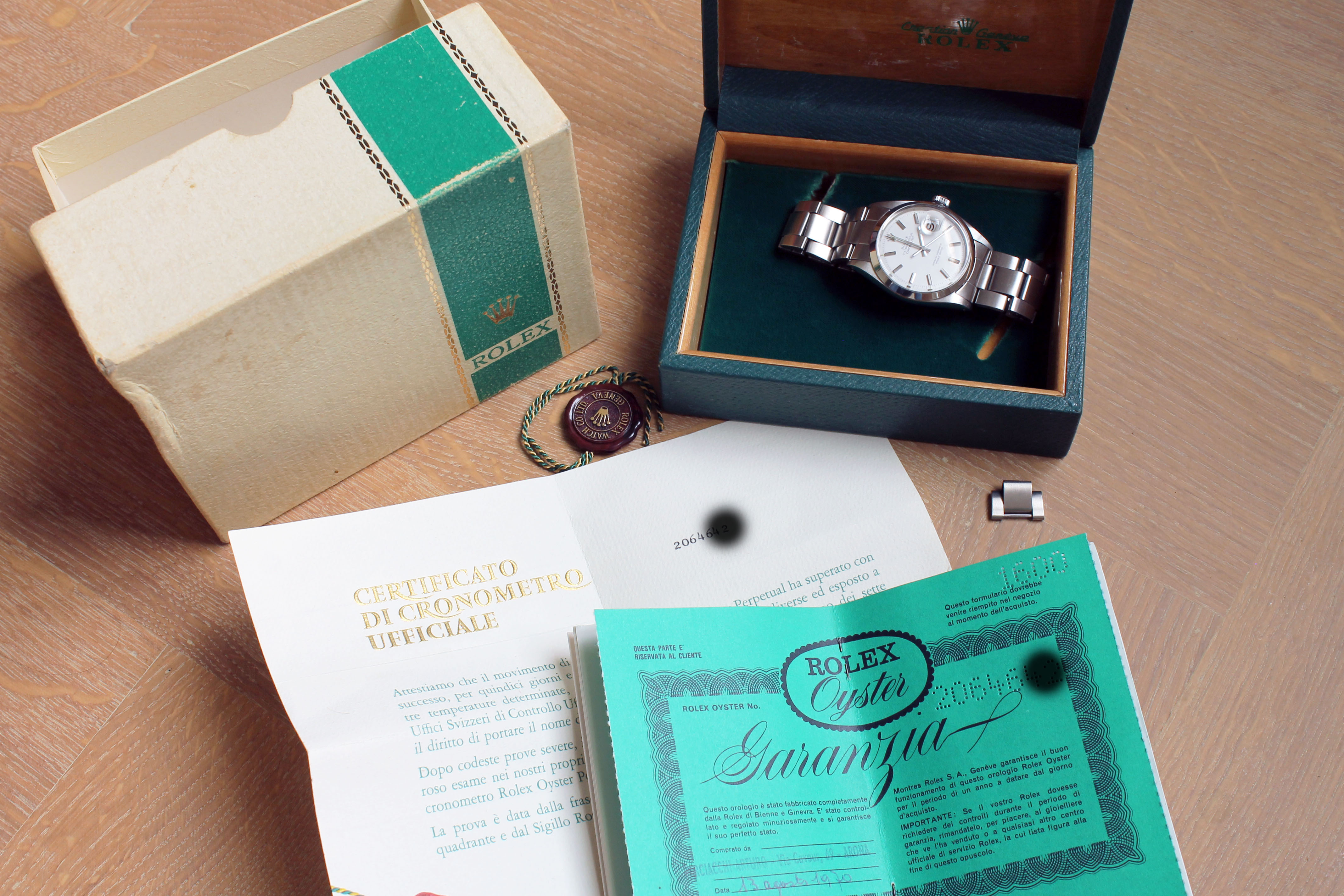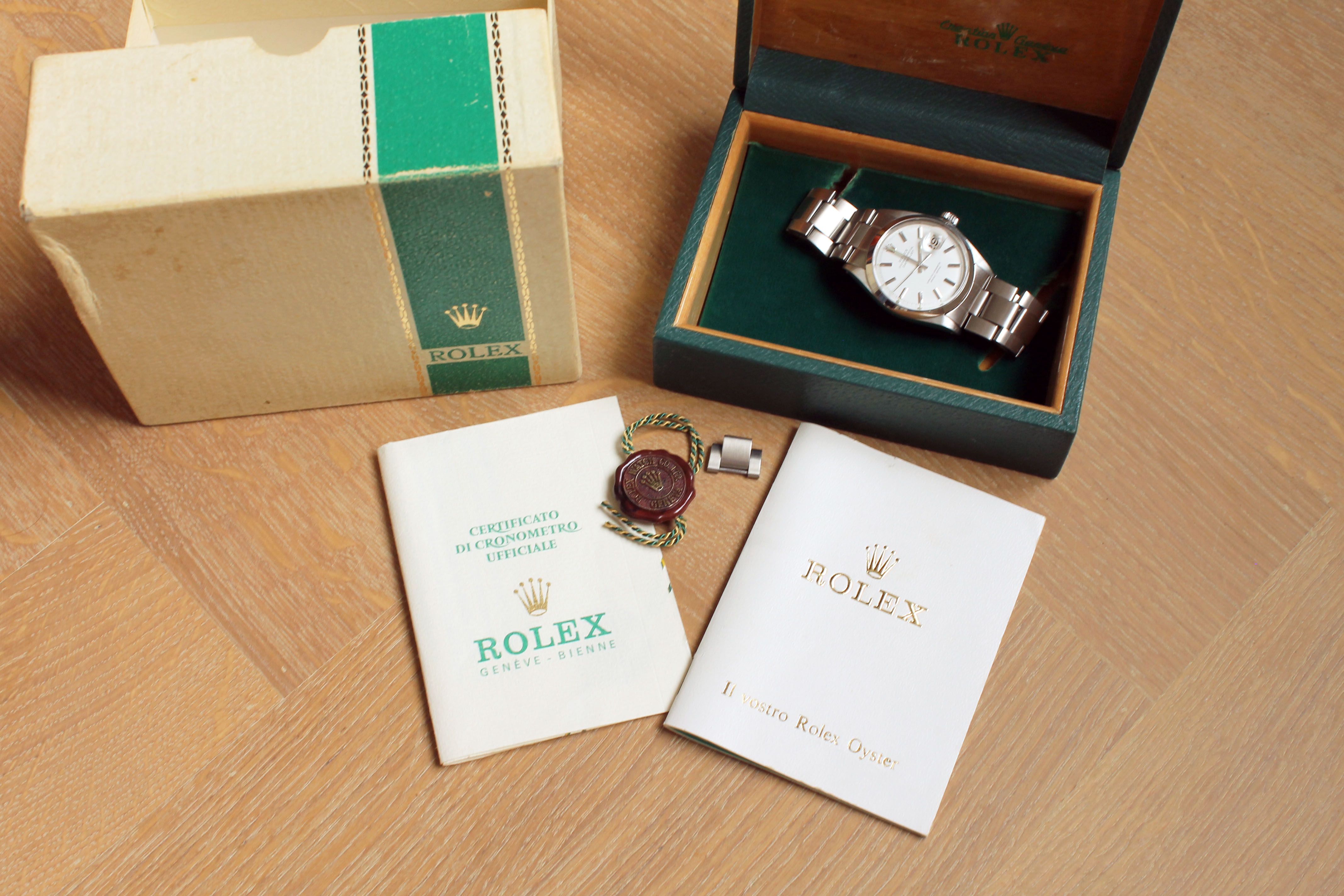 Box and papers: Watch, folded oyster, innerbox, outerbox, guarantee, chronometer certificate, booklet, tag