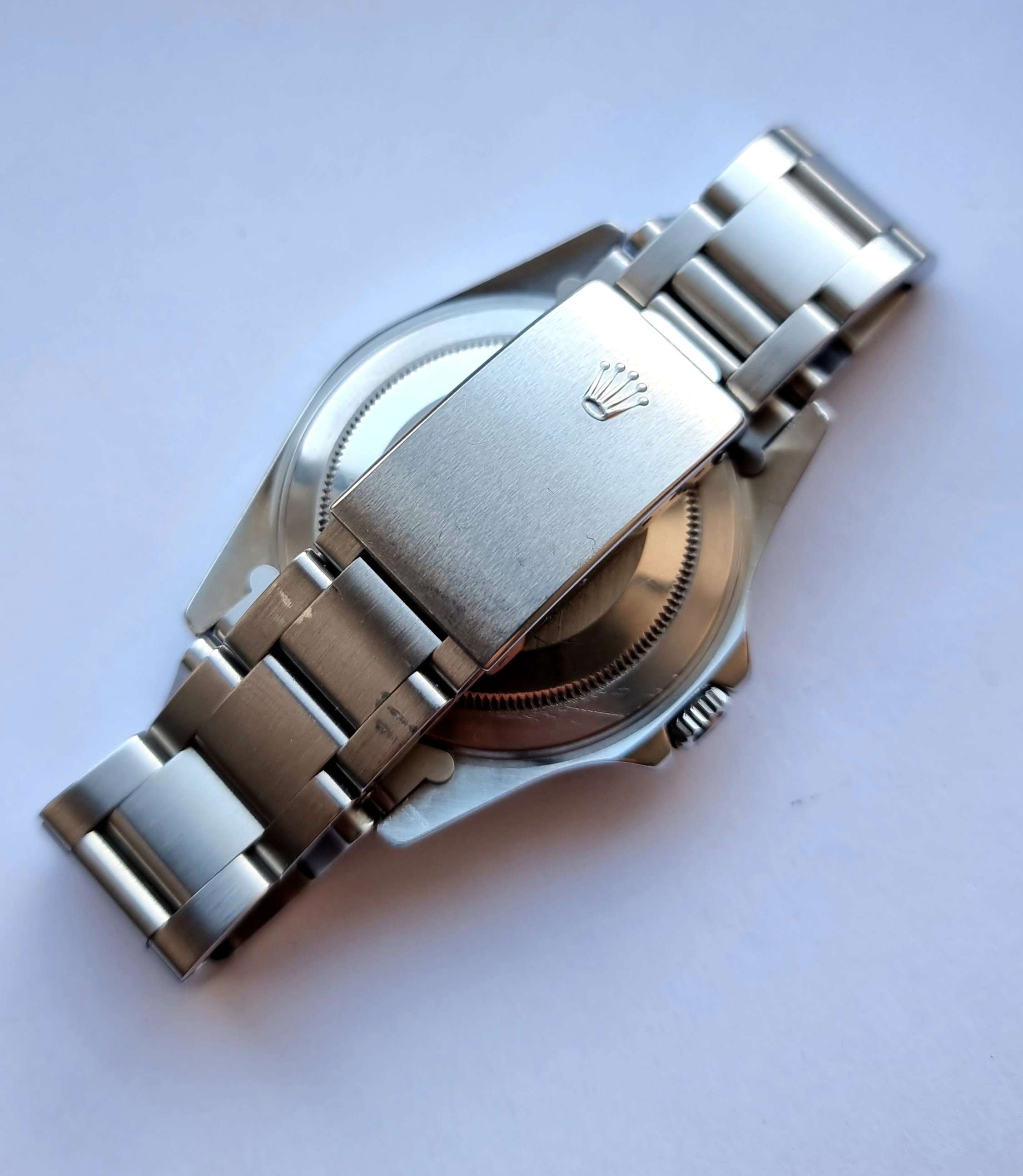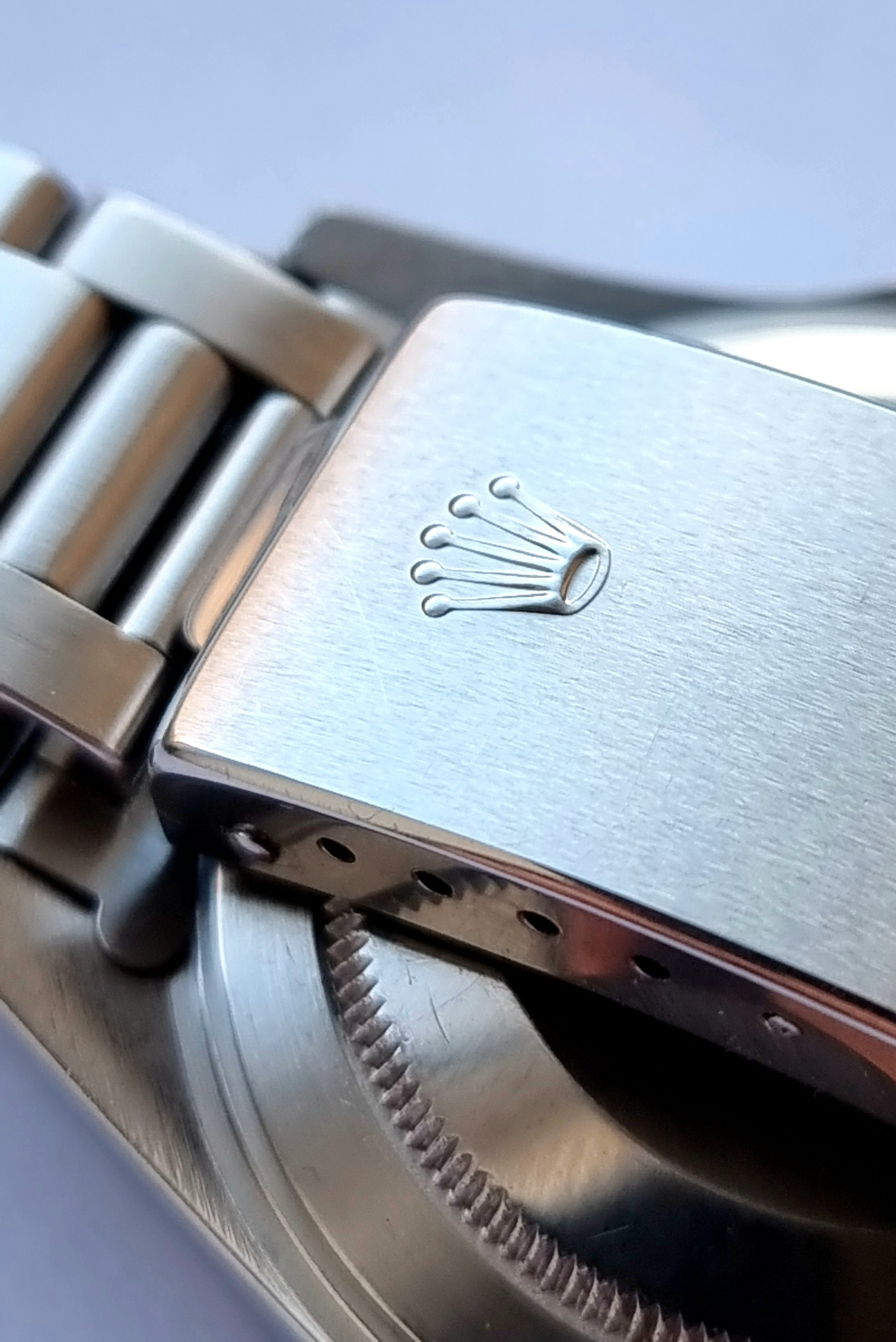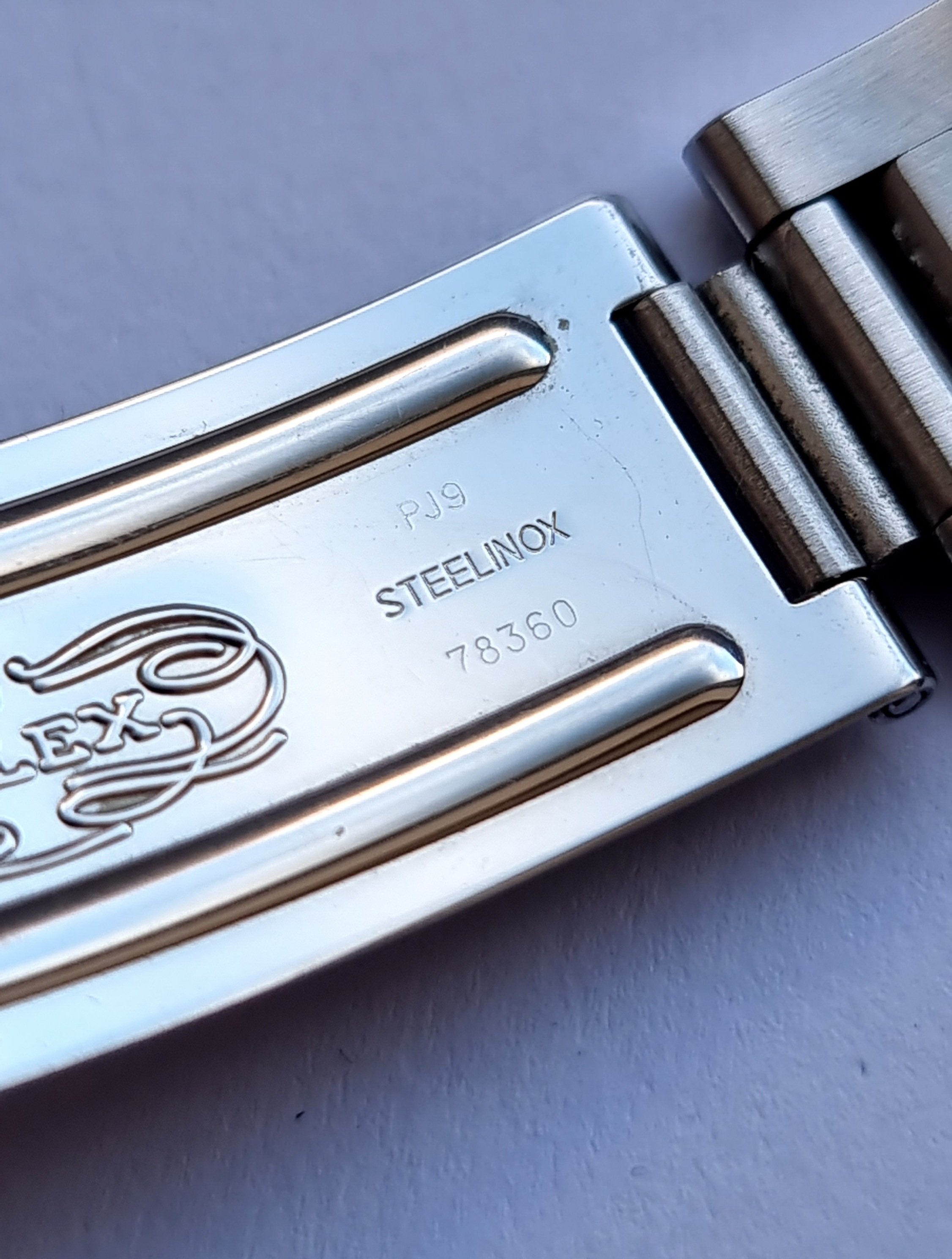 Serial stamp between the lugs is X889220 which dates this as an early 16570 from 1991. The 78360/501B is correct, and the clasp is stamped PJ9, also 1991. The clasp has a few light wear marks, but the coronet is still very proud, and again appears untouched. There are some very light wear marks, but there are no major dents/dings, and the watch is +30 years of age.