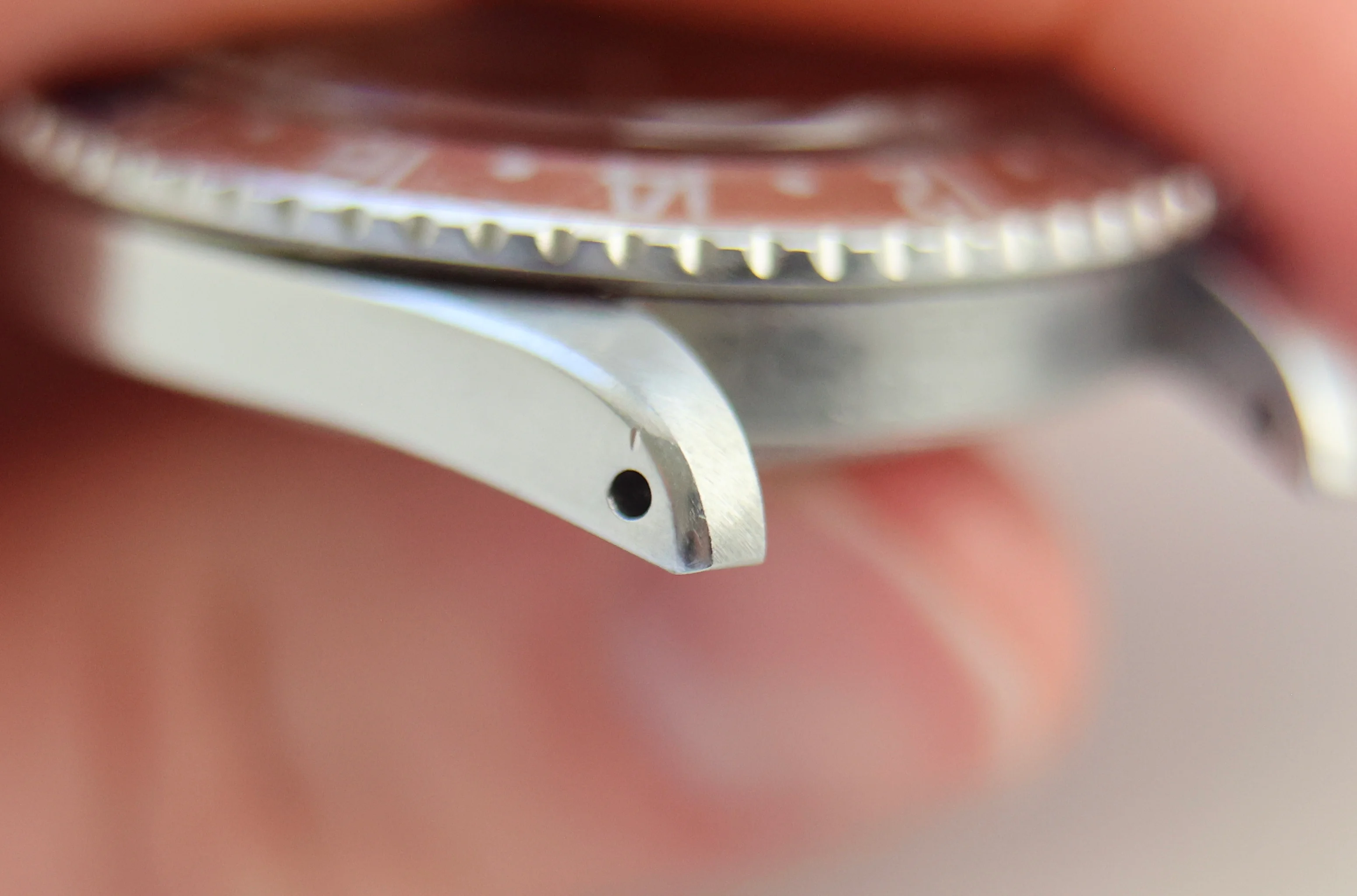Strong, thick case with thick lugs and clearly defined chamfers. Tempus lightly refinished the top surfaces of the lugs to enhance the original bevels. The watch has also been fitted with a new acrylic crystal during service.Bezel Insert