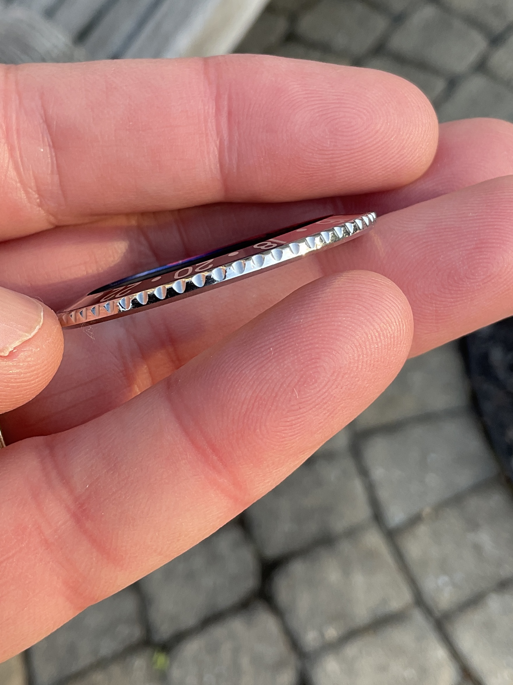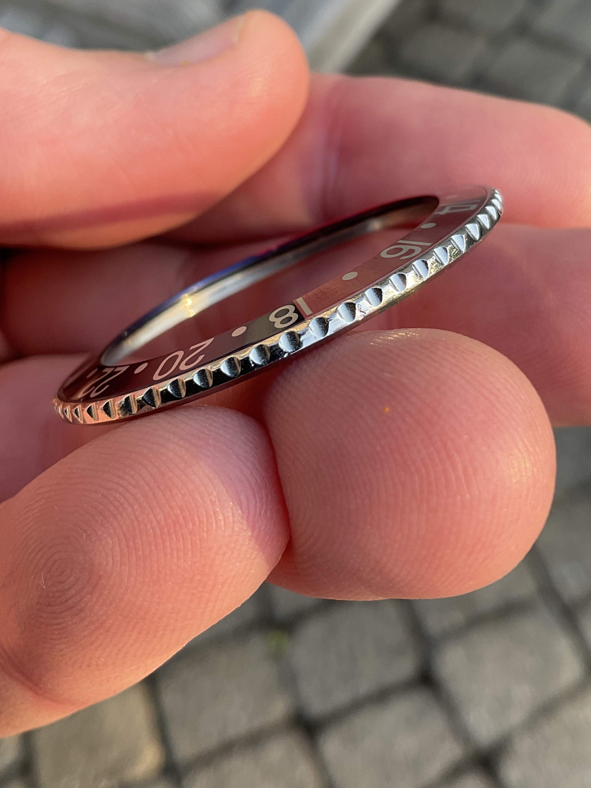 The insert is very securely mounted - tight, no wiggle at all to suggest lots of popping it into and out of bezels over the years - into an original (NOT a reproduction) Rolex bezel in very nice condition, with only light signs of wear around the edges of its crisp and properly shaped notches.