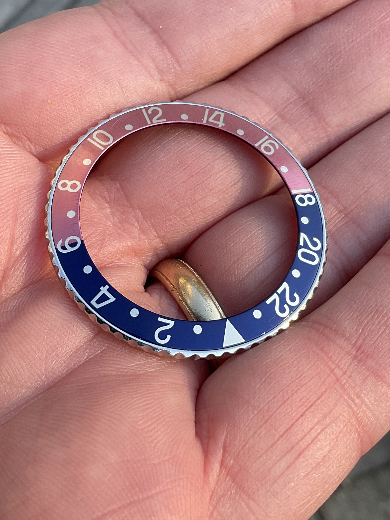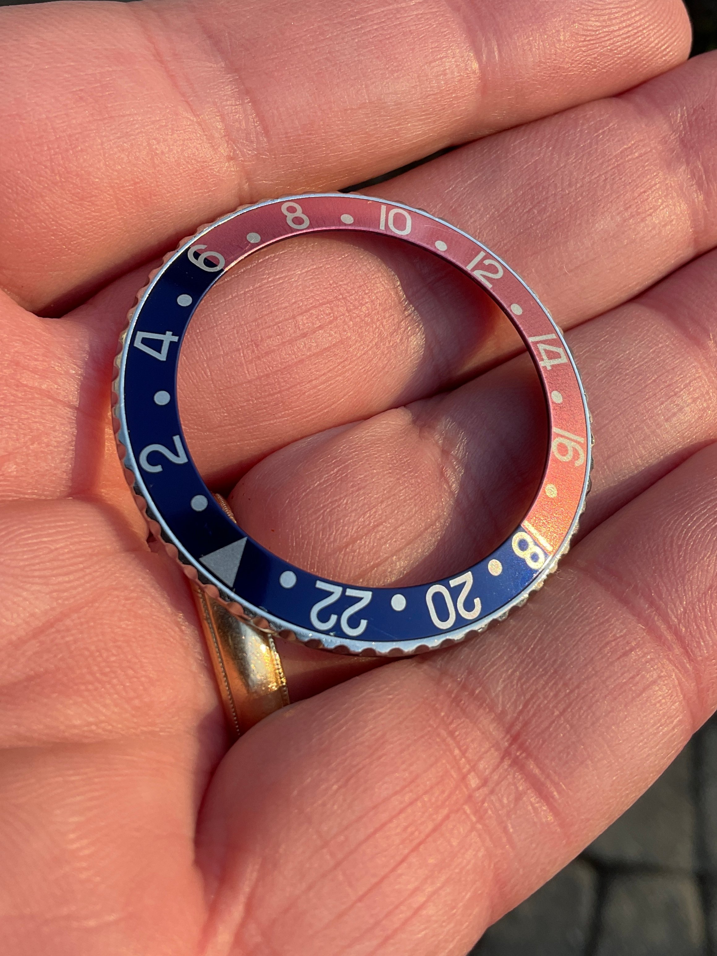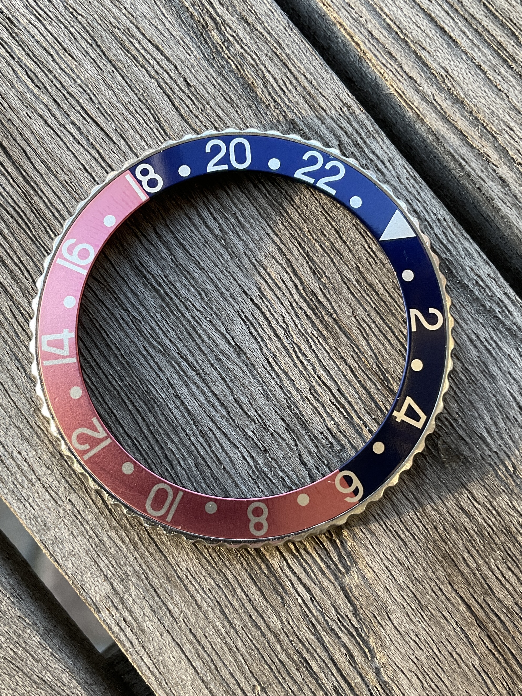 ·For sale is this lovely and original “Pepsi” insert for your Rolex 1675 or 16750, including the original Rolex bezel in which it’s mounted. The insert is in terrific condition, with only some very small/minor signs of wear as one would expect. The blue is crisp and bright. The red has taken on a lovely pinkish fade. The back is blue.