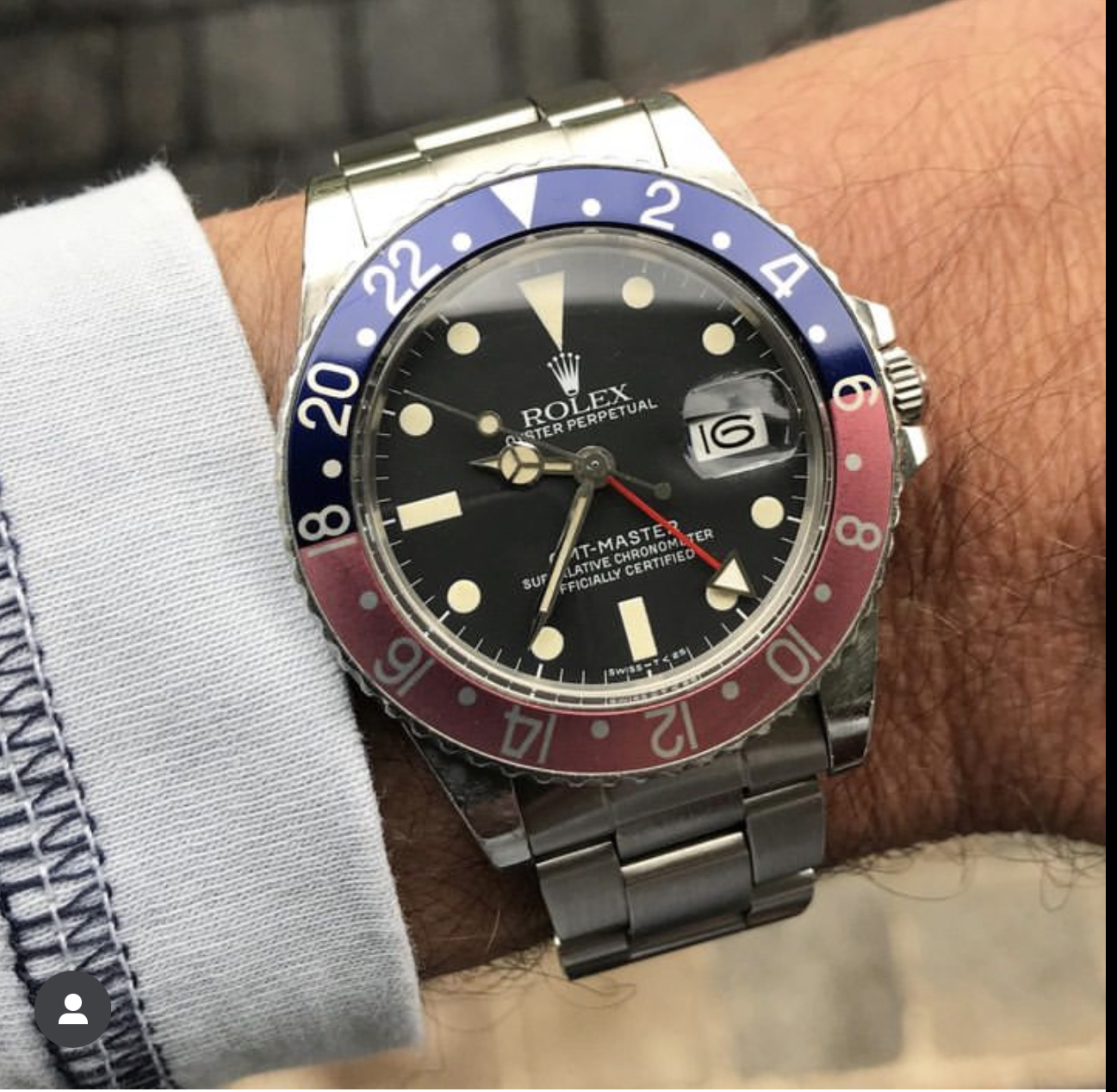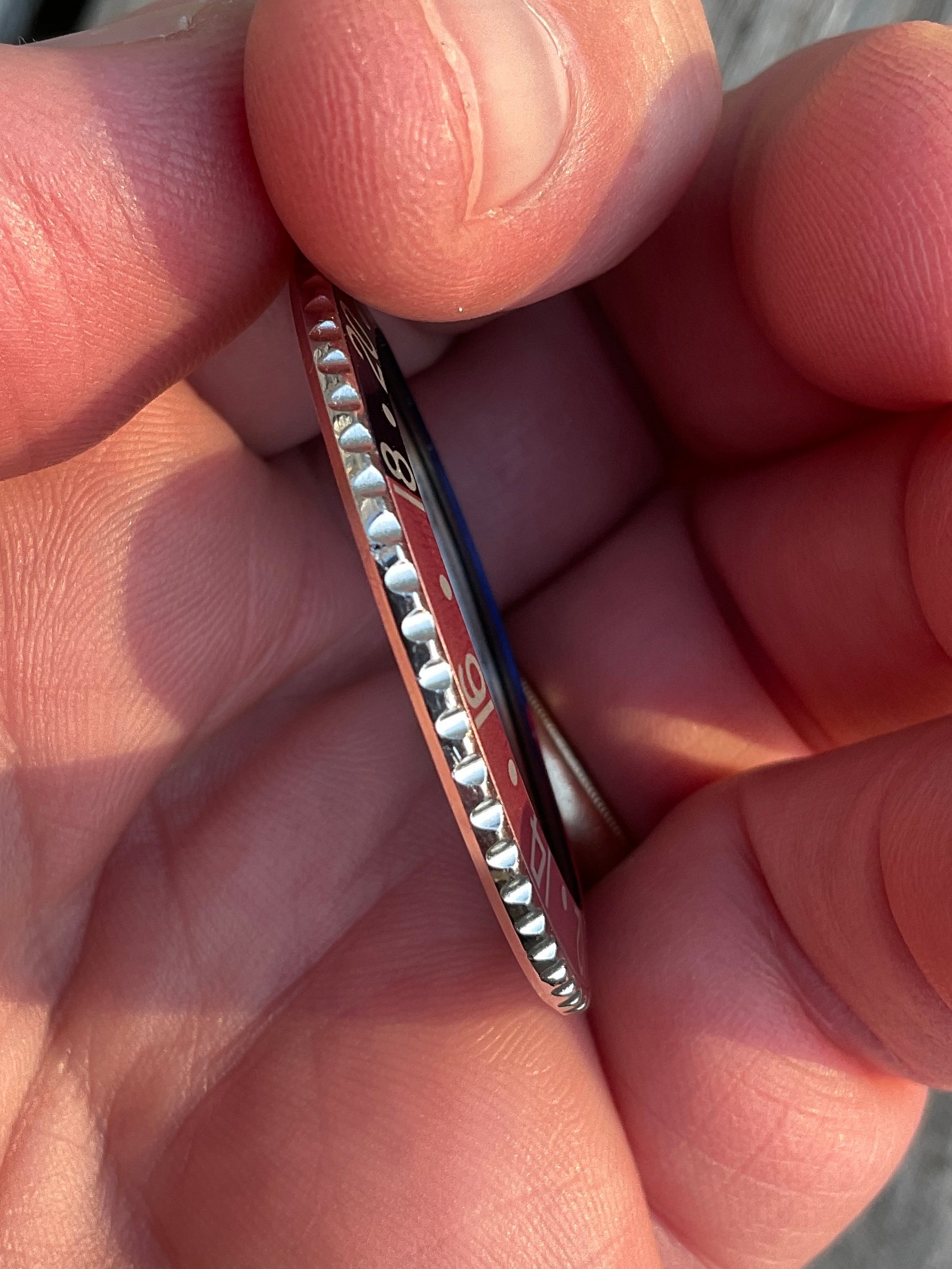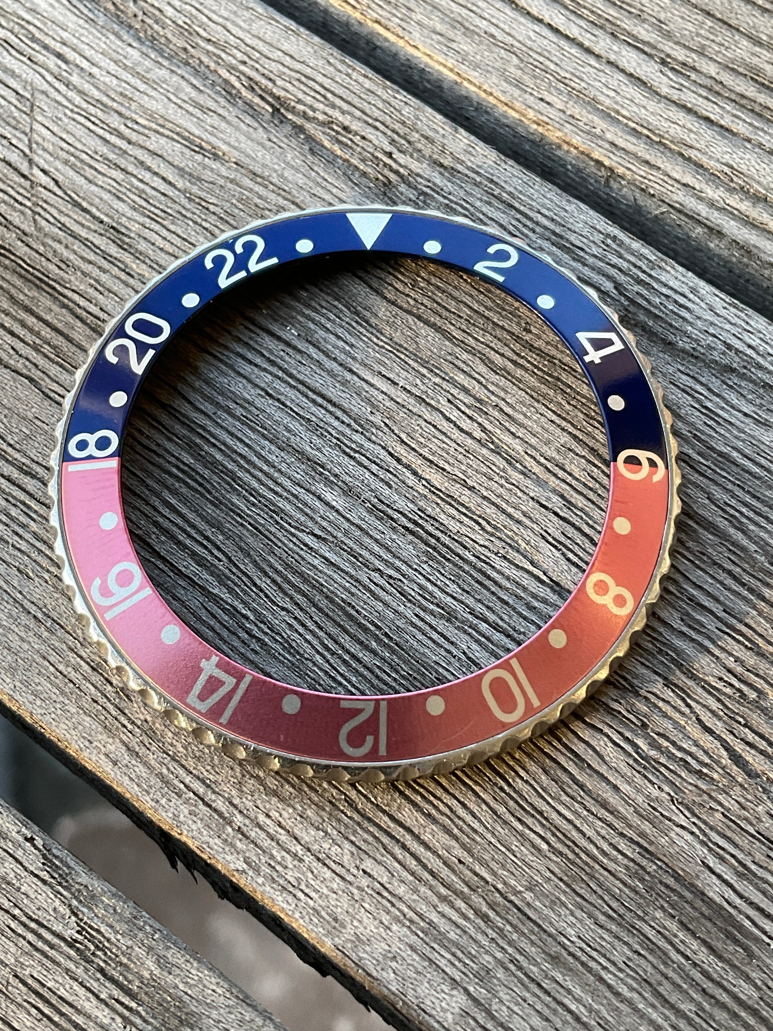 ·For sale is this lovely and original “Pepsi” insert for your Rolex 1675 or 16750, including the original Rolex bezel in which it’s mounted. The insert is in terrific condition, with only some very small/minor signs of wear as one would expect. The blue is crisp and bright. The red has taken on a lovely pinkish fade. The back is blue.