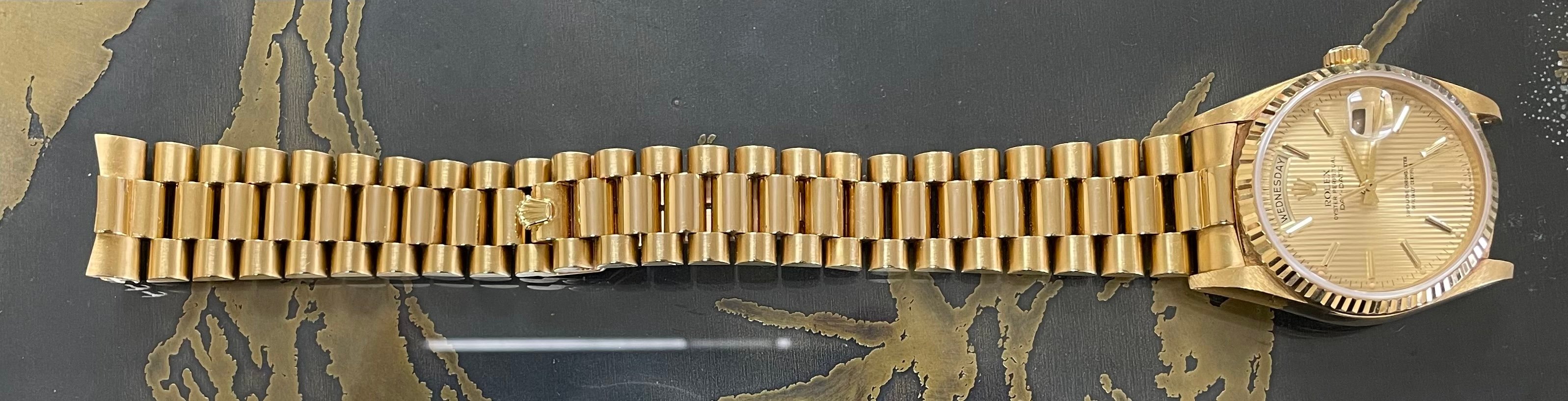 ·Hello up for sale is a ca. 1984 Rolex President Day Date (8 mil serial). Case lines and brushing remain factory sharp. Light signs of wear from very little use. 8385 Bracelet is full length and still extremely tight, not refinished. Bezel is 100% crisp. No chips or scuffs in sapphire crystal.