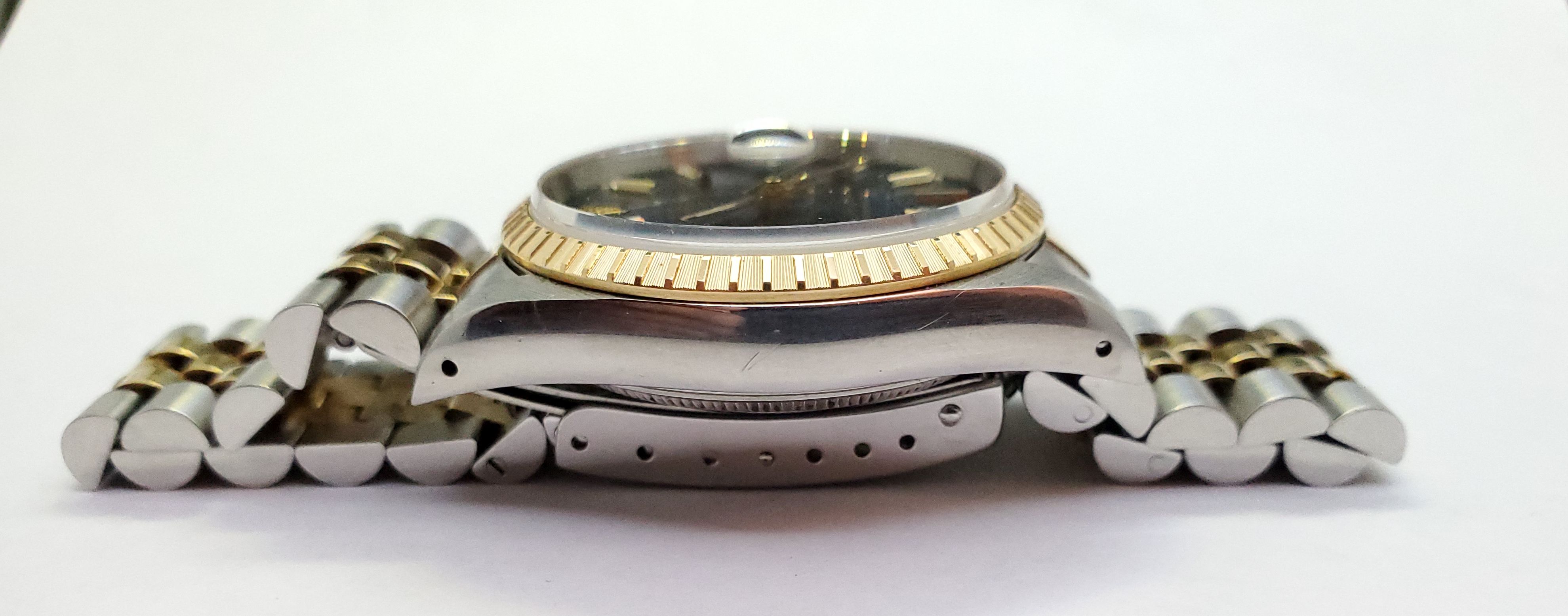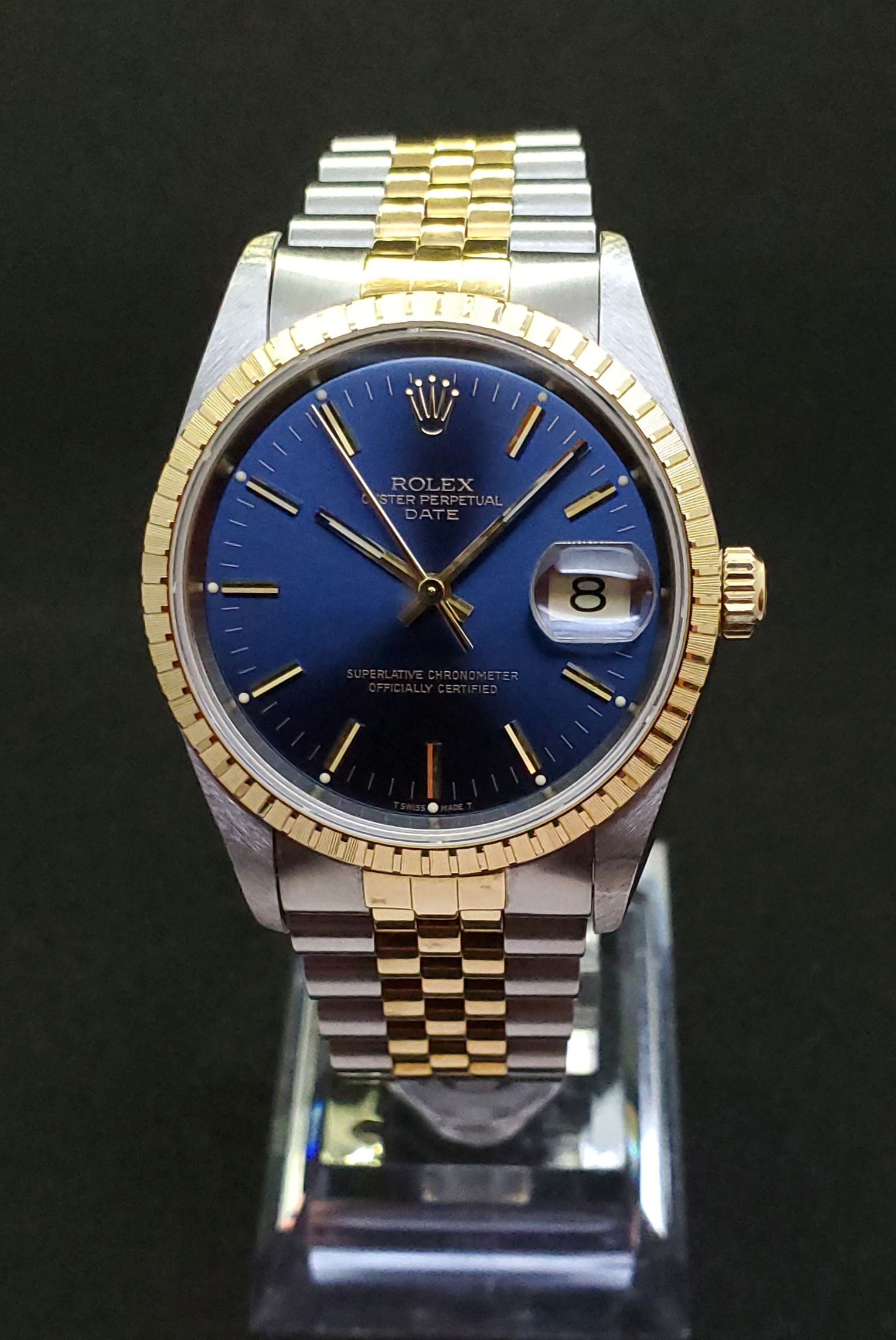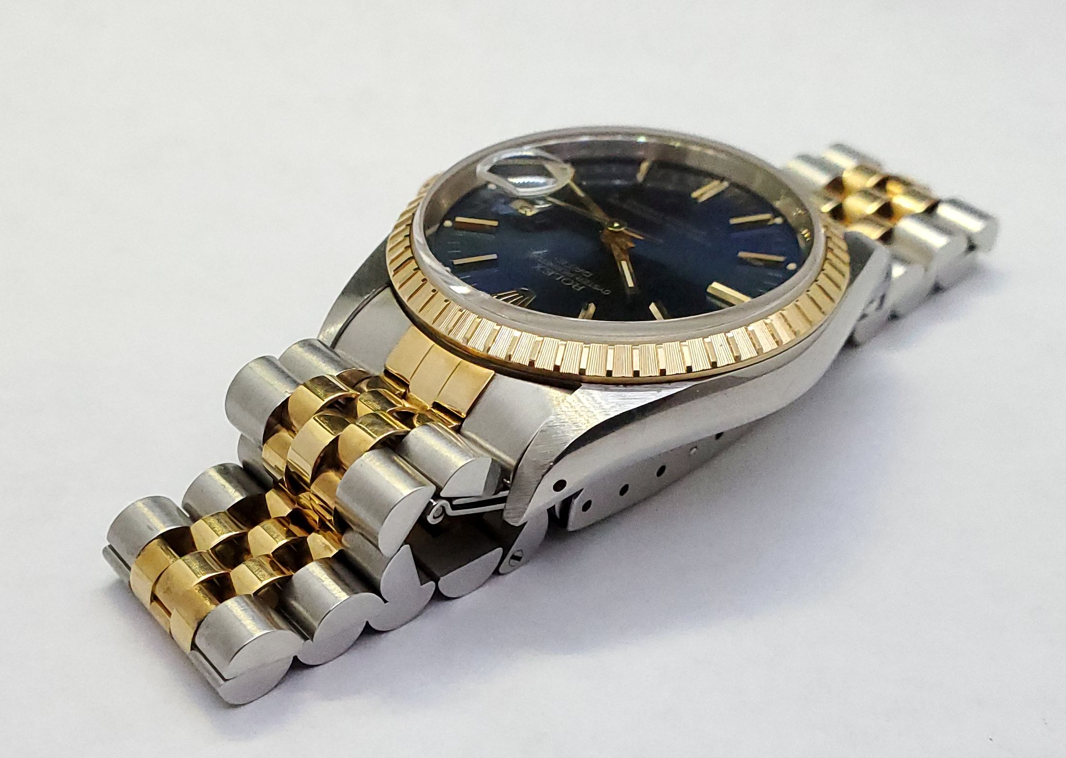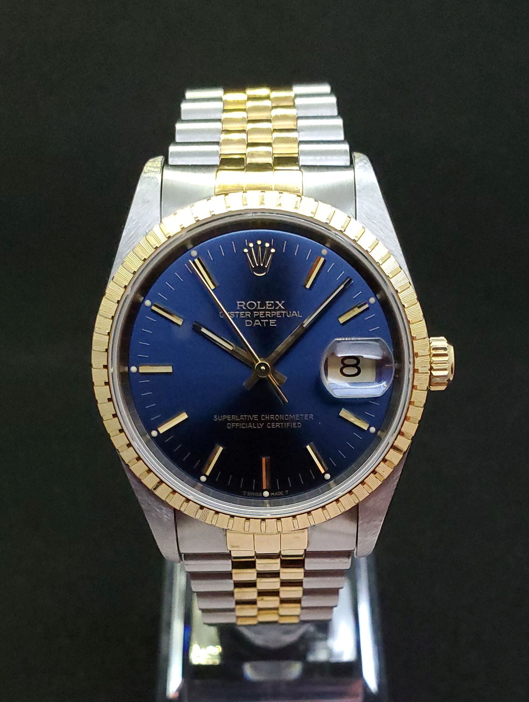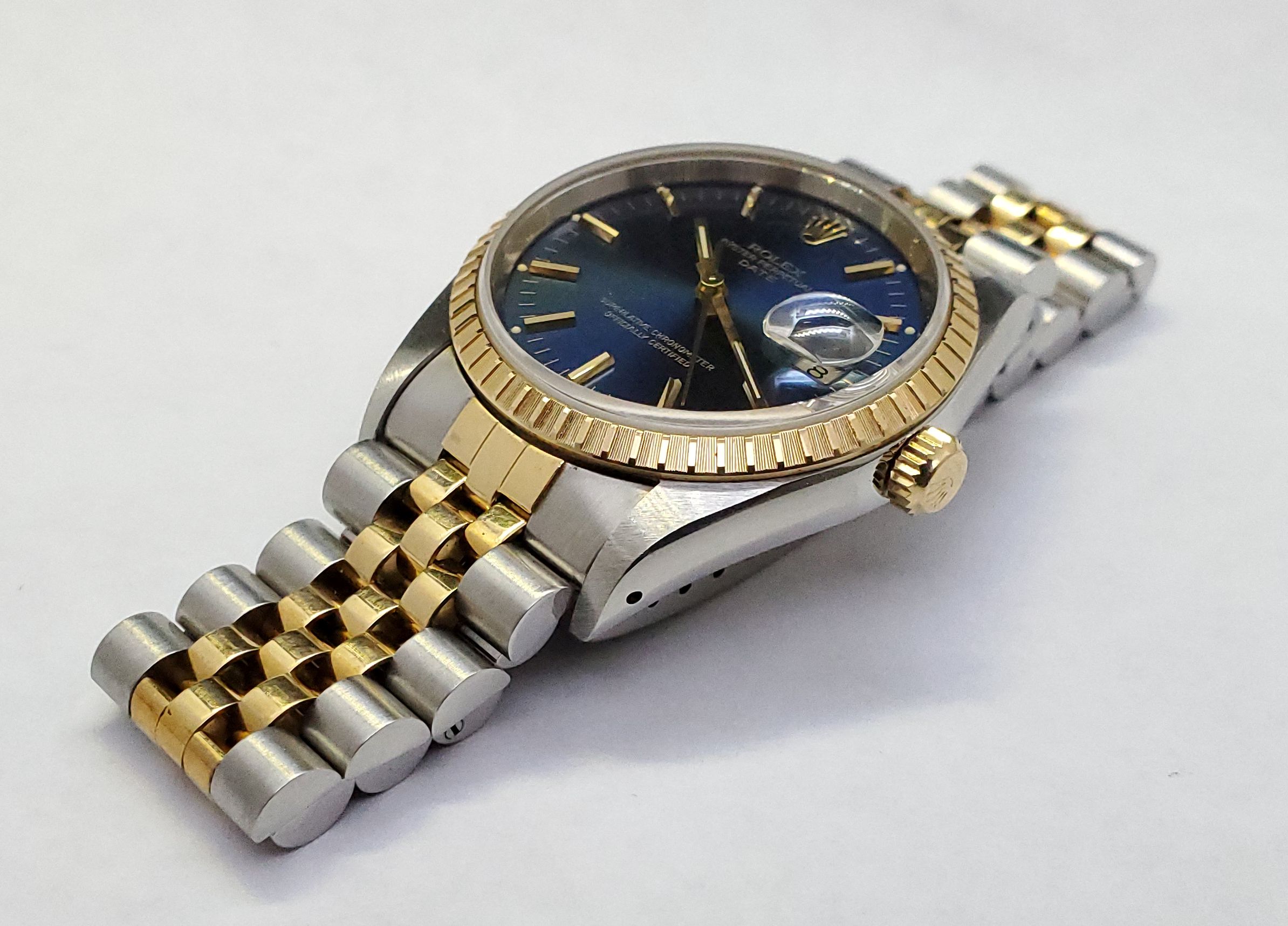 ··YaY!Overall: Very good condition 15223 Date with blue sunburst tritium dial on jubilee 18K YG/SS bracelet, engine turned bezel. Watch has small scuffs/scratches, but nothing deep.