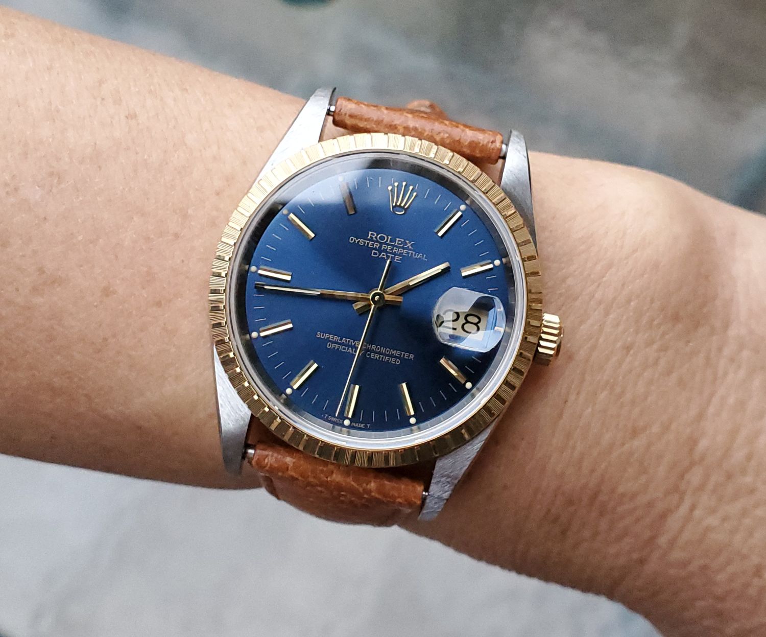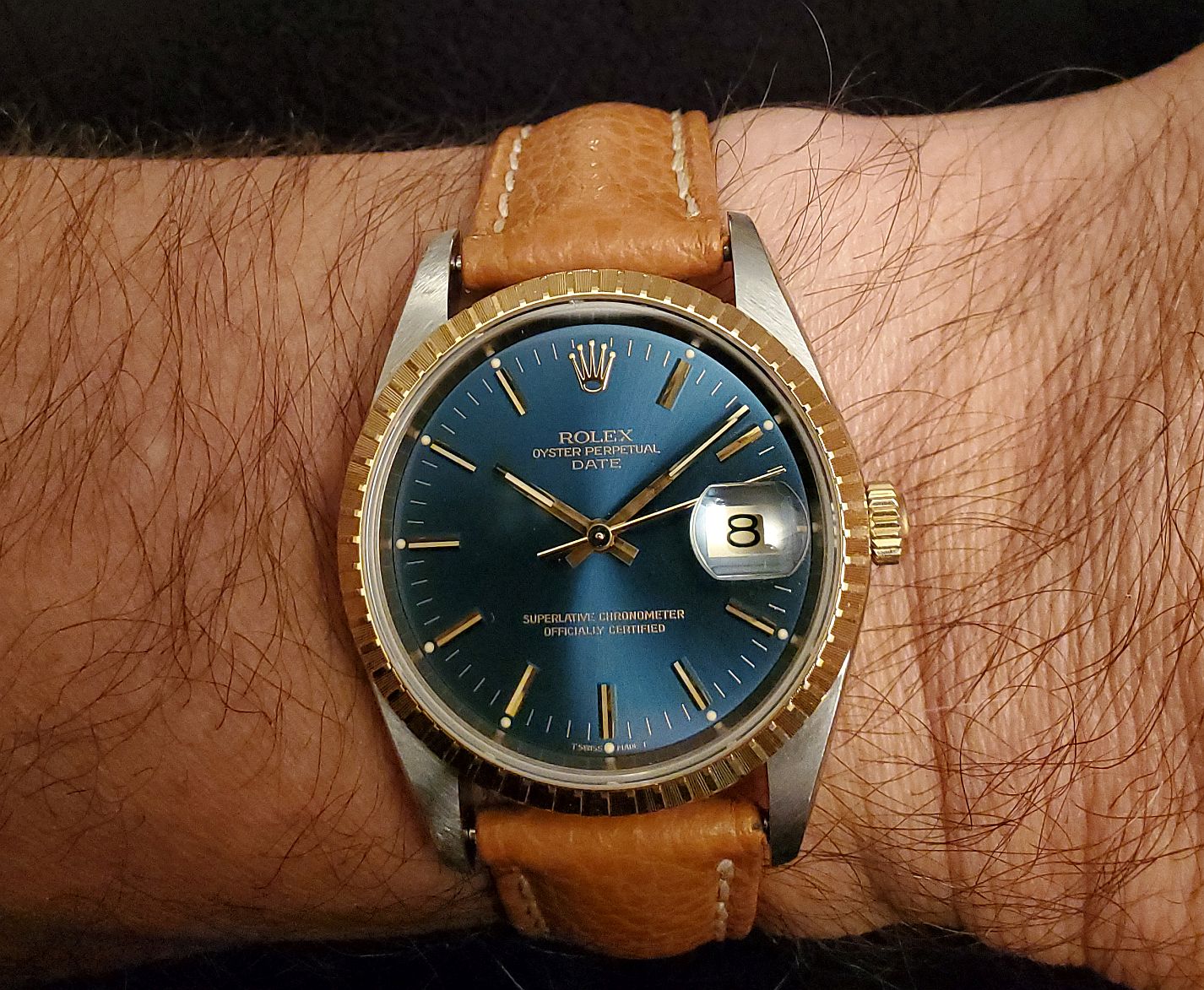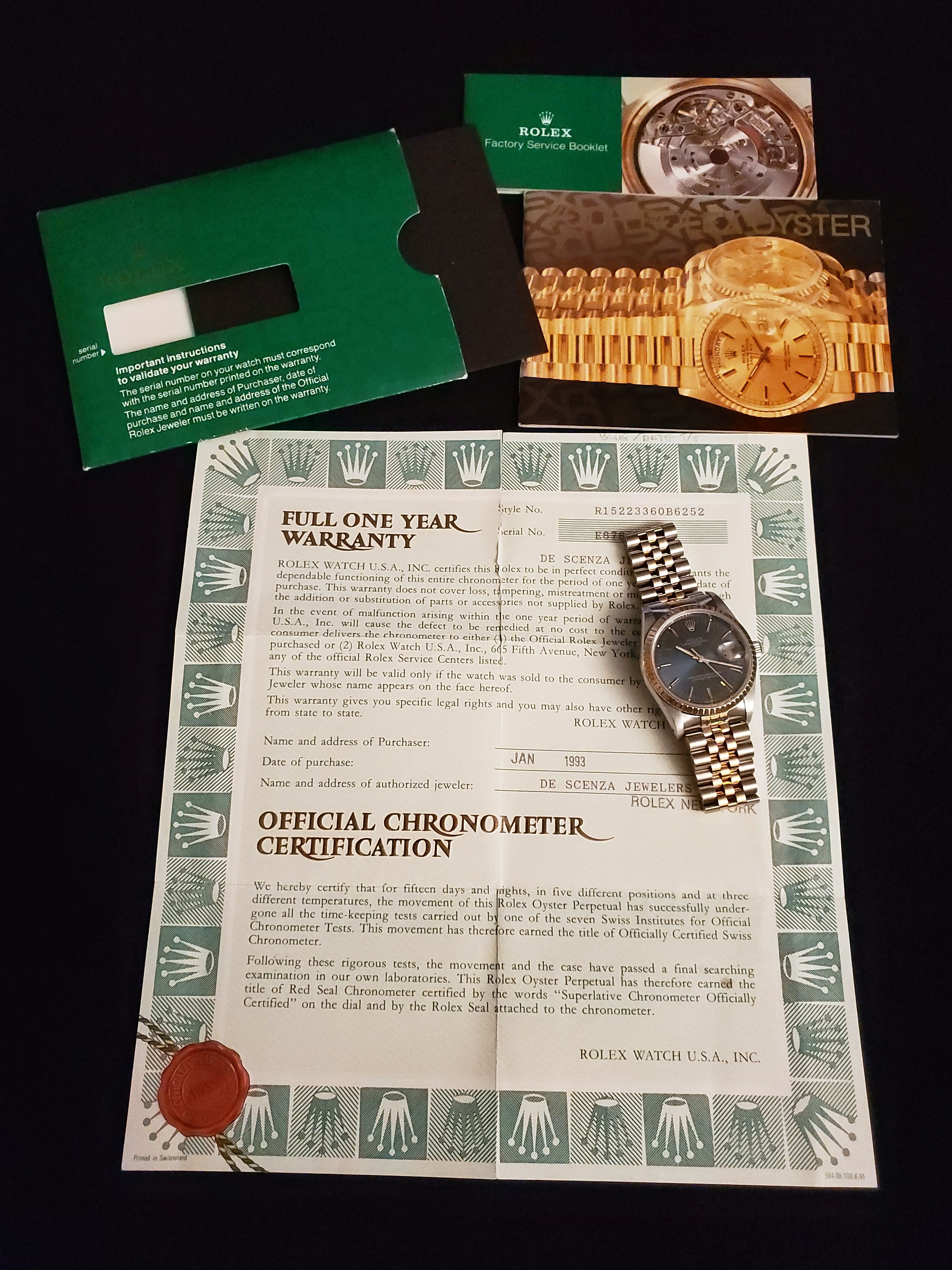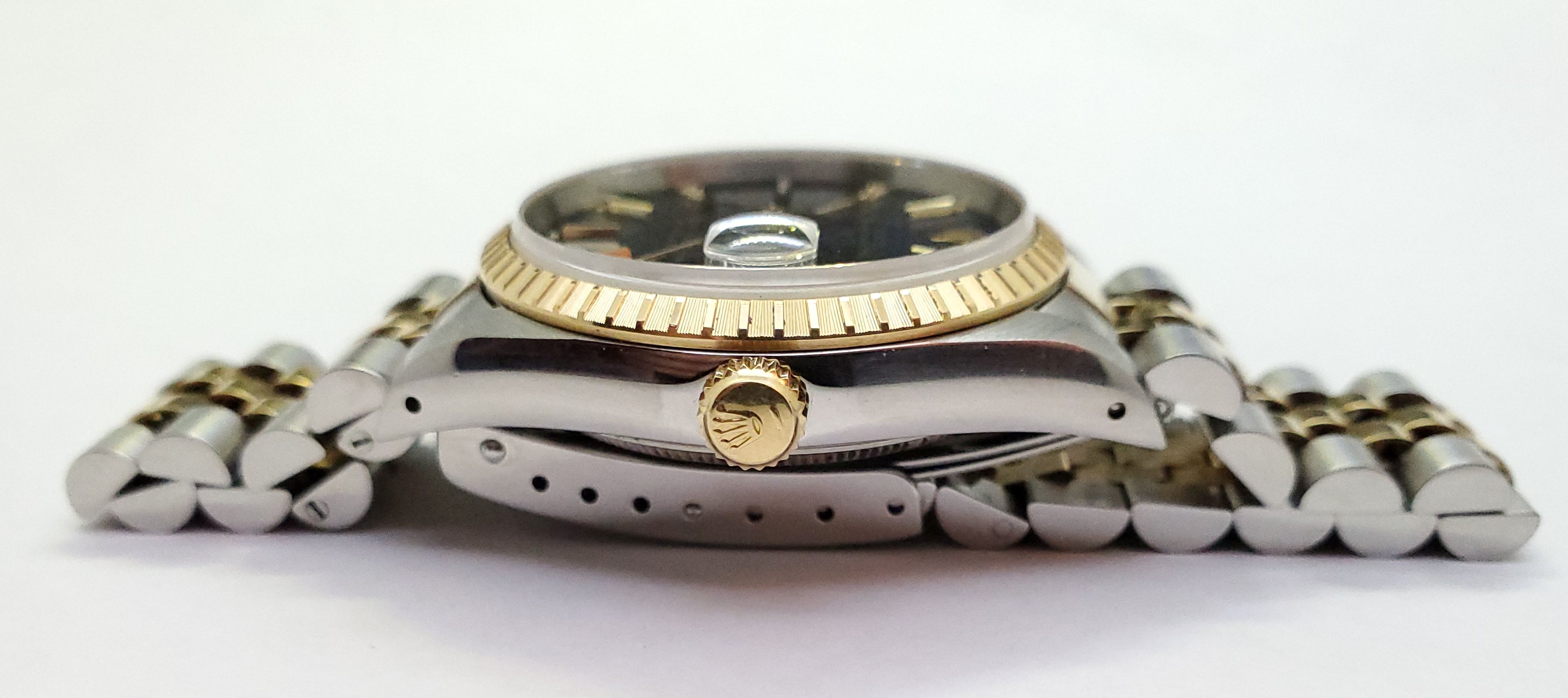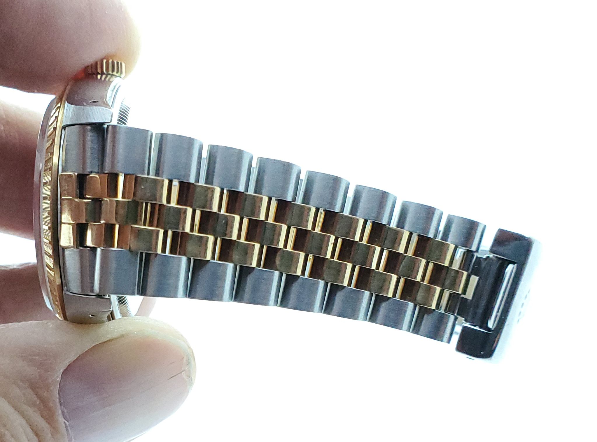 ··YaY!Overall: Very good condition 15223 Date with blue sunburst tritium dial on jubilee 18K YG/SS bracelet, engine turned bezel. Watch has small scuffs/scratches, but nothing deep.