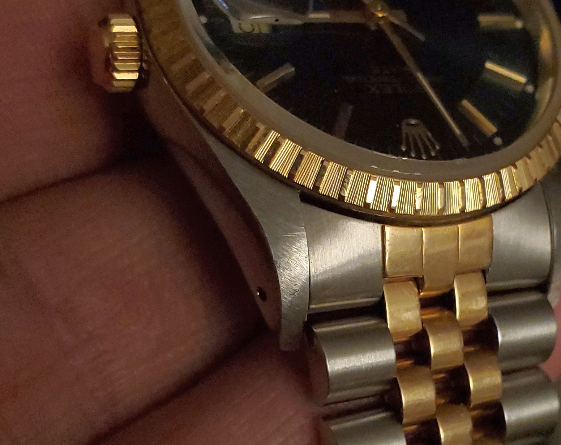 Case: 34.3mm excluding crown. I believe it is unpolished. Small scuffs on lugs, nothing deep. Small scratch on 9 o’clock side. Small nick near the 2:00 lug hole. Normal bracelet wear points.