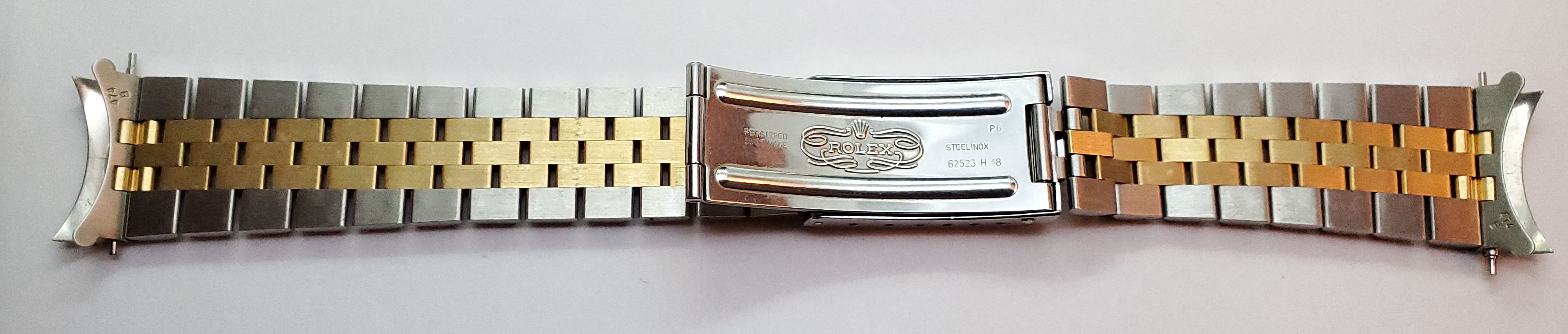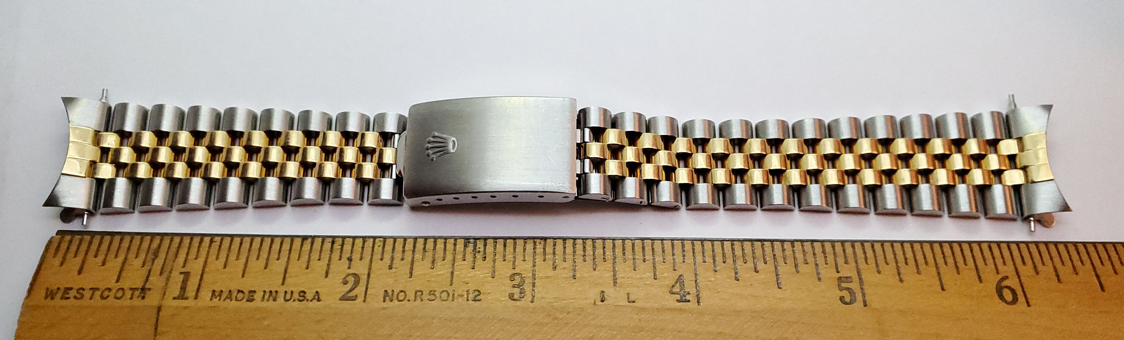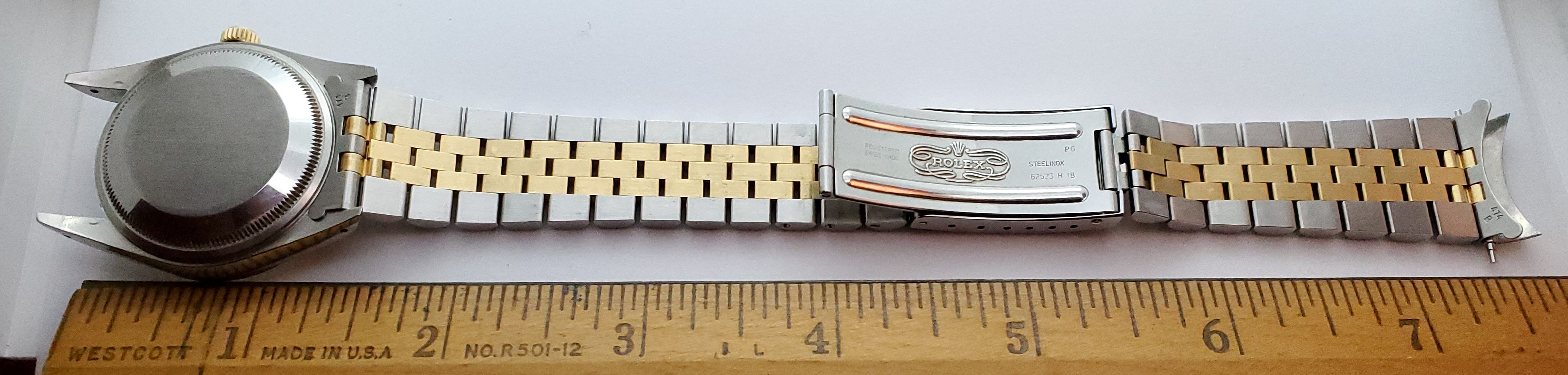 Bracelet: Two-tone jubilee 62523 H 18 bracelet with 474 B ends. 19mm tapering to 15mm. Fits approx. 7 1/2” wrist at max adjustment. Shows very little to no stretch. Small desk diving scratches, nothing deep.