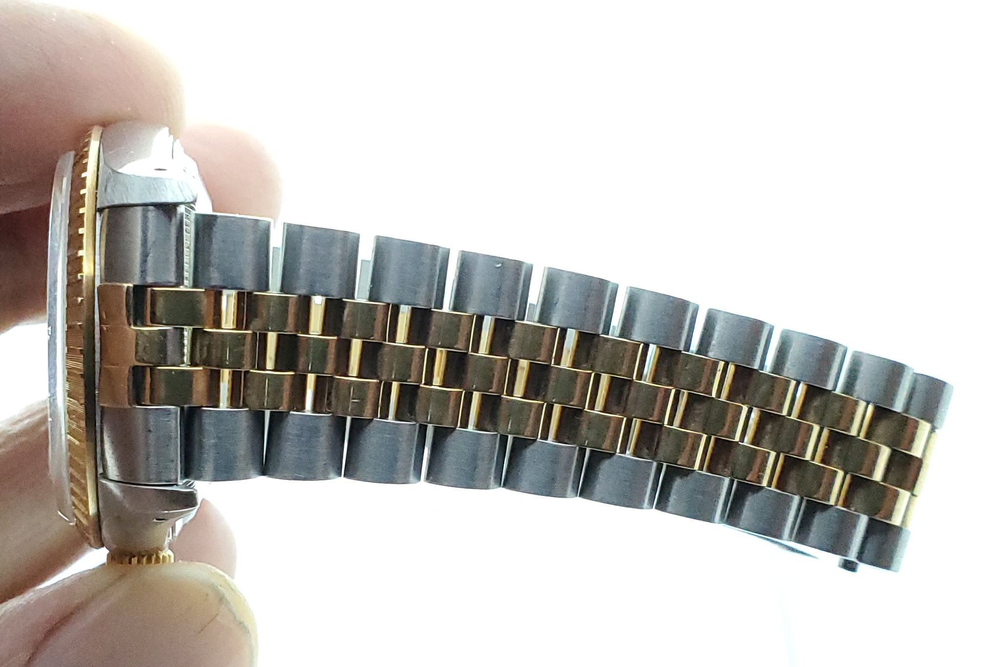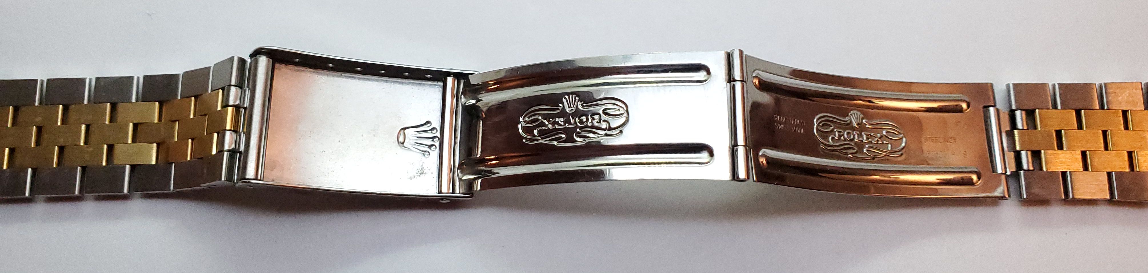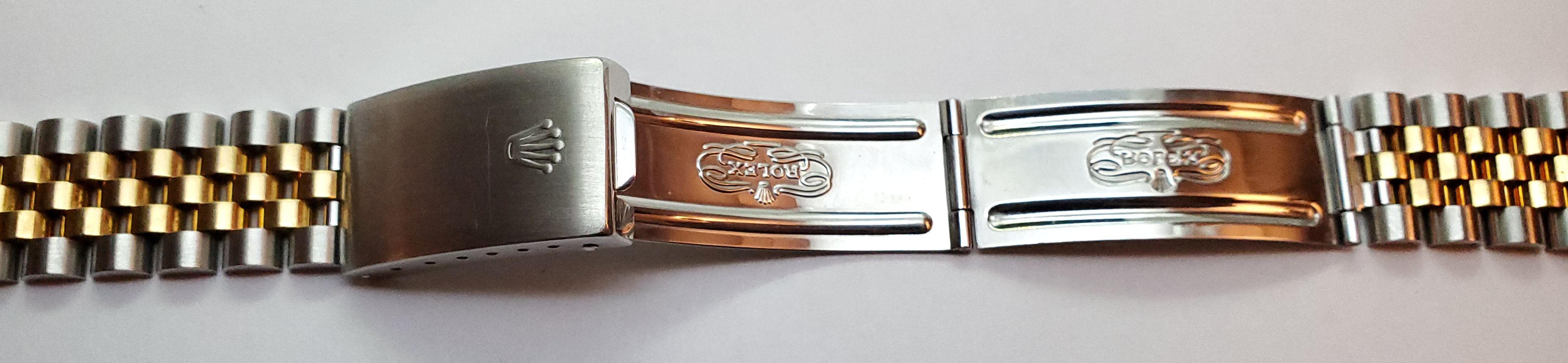 Bracelet: Two-tone jubilee 62523 H 18 bracelet with 474 B ends. 19mm tapering to 15mm. Fits approx. 7 1/2” wrist at max adjustment. Shows very little to no stretch. Small desk diving scratches, nothing deep.