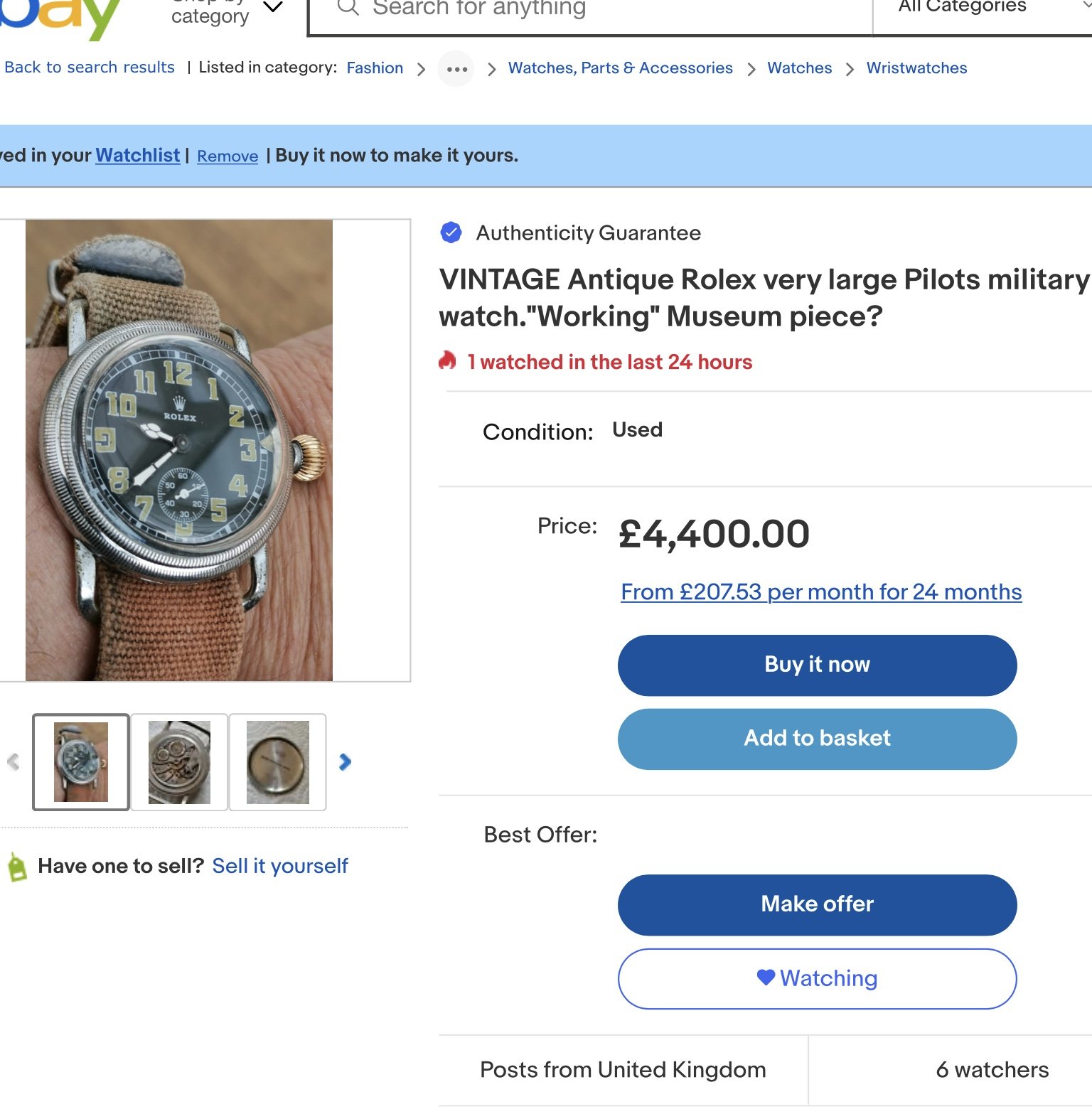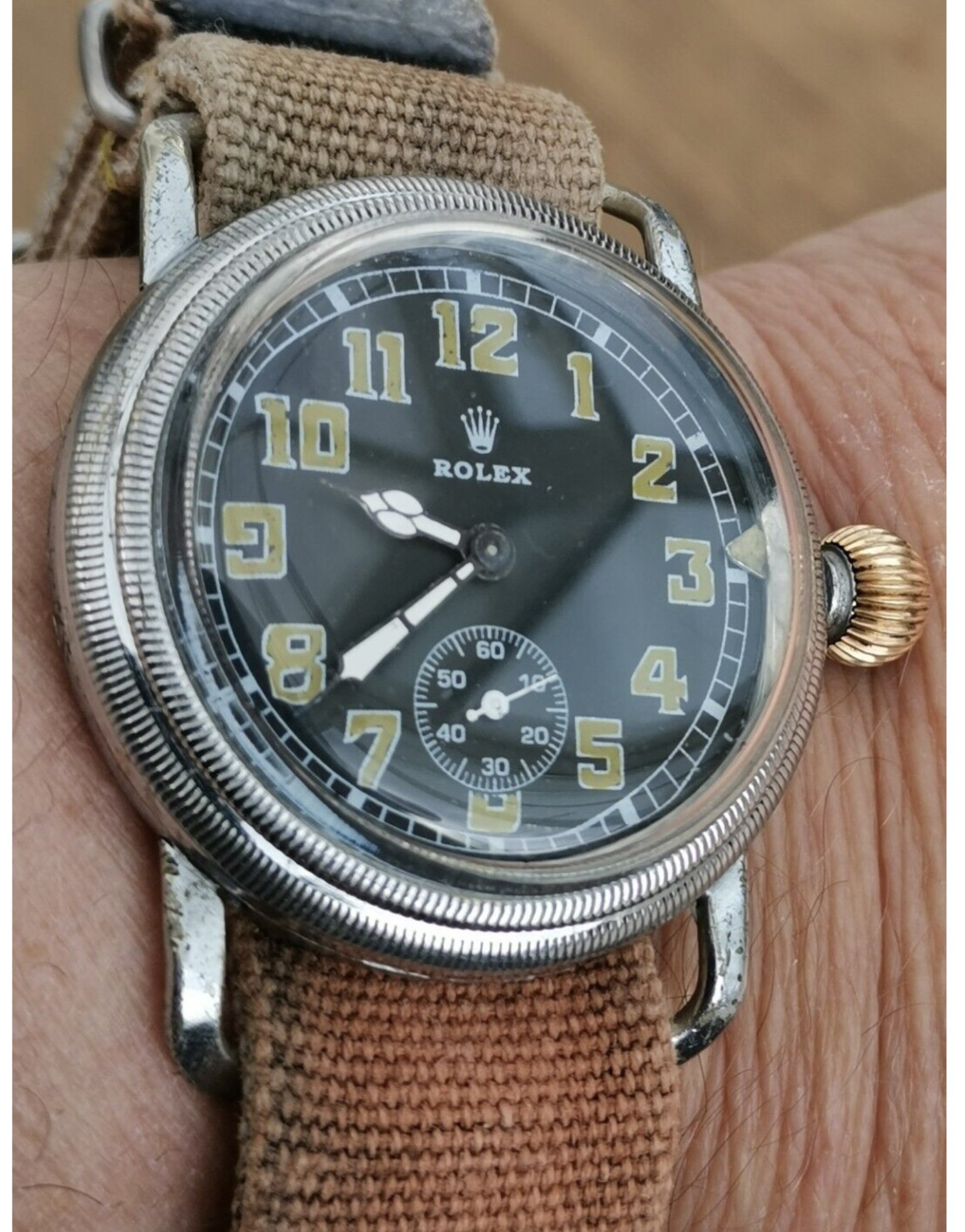 Now, after Zenith designed theirs in 1909 for Louis Bleriot to fly the english channel , I’m aware that multiple manufacturers (Omega, Natalis, Emte, Helvetia, Lanco, Rellum to name a few) made watches in this style - 40mm(ish) similar cases, black dial, clear numbers - however, I have never seen an example of a Rolex version. My gut tells me the below is bogus in some way, perhaps a franken version, but I’m really not sure… the logo looks suspicious to me - particularly given the time when these watches were around. Perhaps I’m just being skeptical having never seen another example of this kind. Though I did find this information -