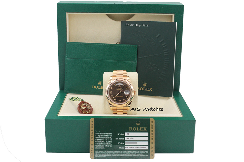 Up for sale is a Rolex 218235 DayDate II 41MM DD2 18K Rose Gold Chocolate Roman Dial Random Serial Box & Papers. The timepiece comes with 9 screws and overall condition will not disappoint.