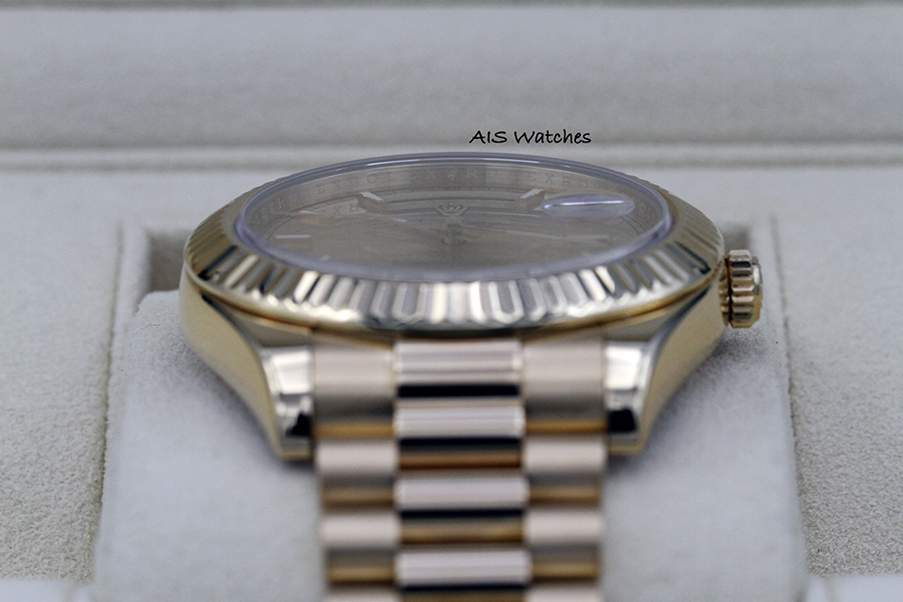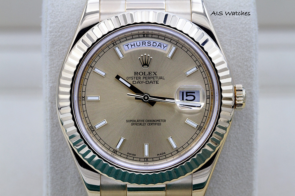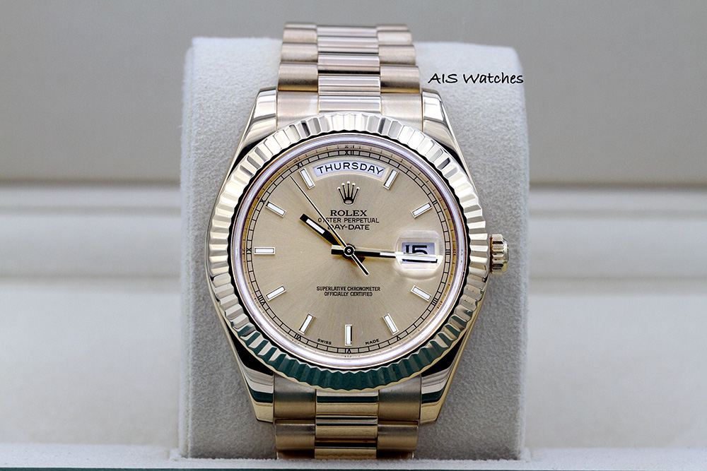 Up for sale is a Rolex 218238 DayDate II 41MM DD2 Yellow Gold Champagne Dial V Serial Box & Papers. The timepiece comes with 22 links and overall condition will not disappoint.