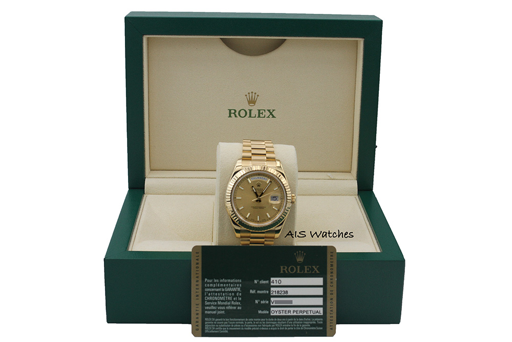 Up for sale is a Rolex 218238 DayDate II 41MM DD2 Yellow Gold Champagne Dial V Serial Box & Papers. The timepiece comes with 22 links and overall condition will not disappoint.