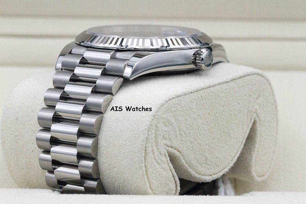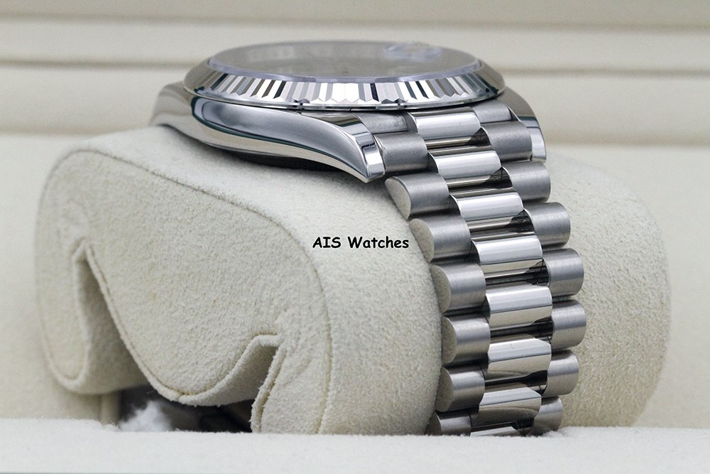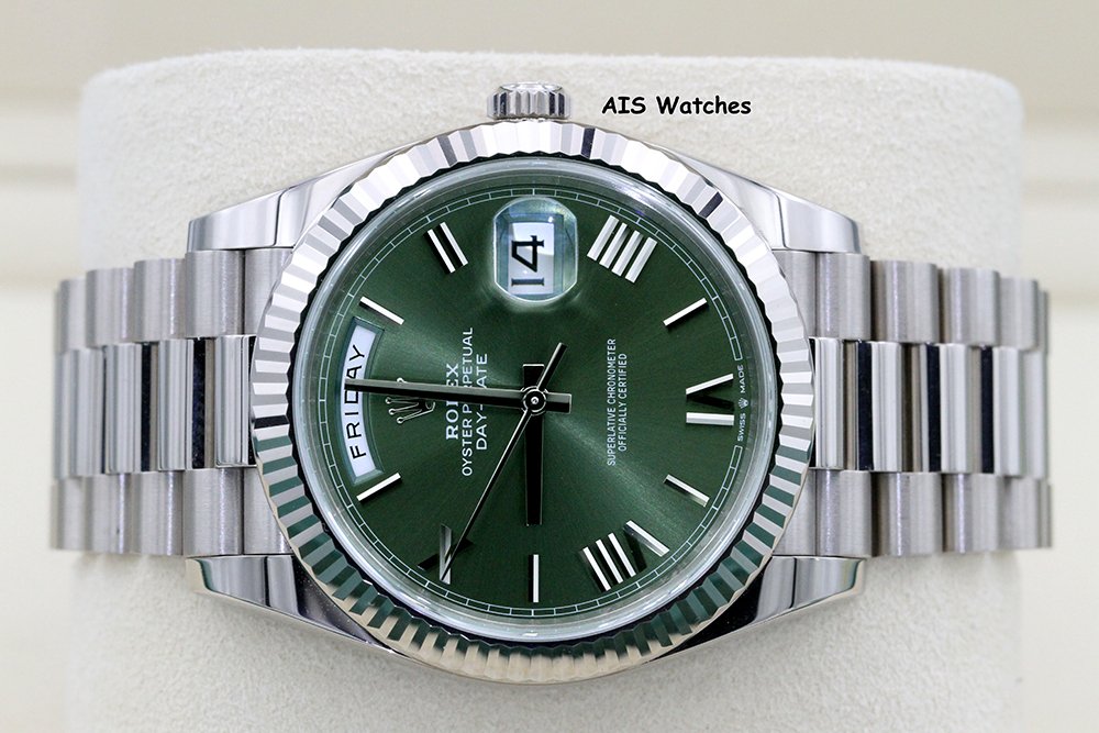 Up for sale is a Rolex 228239 DayDate 40MM DD40 18K White Gold Olive Green Roman Dial Box & Papers. The timepiece is in excellent condition