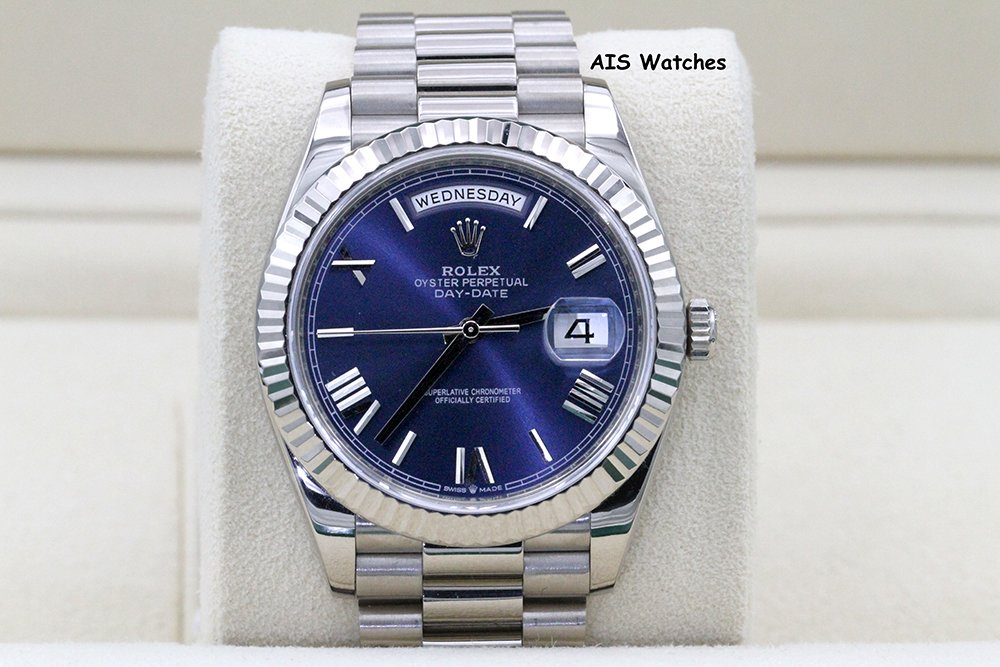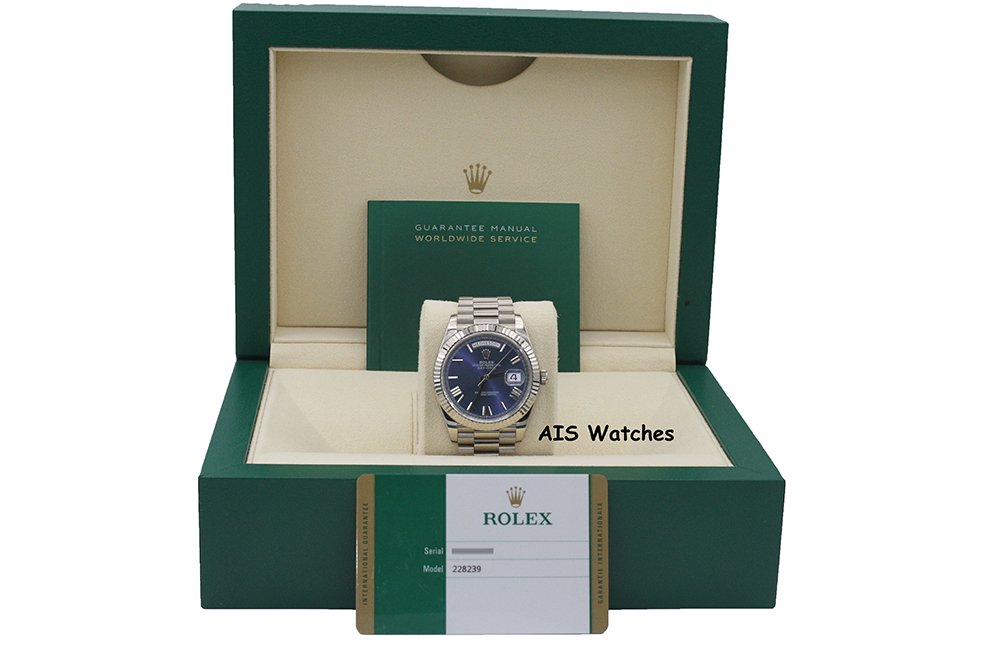 Up for sale is a Rolex 228239 DayDate 40MM DD40 White Gold Blue Roman Dial Box & Papers. The timepiece is in excellent condition