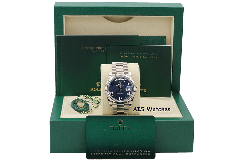 Up for sale is a Rolex 228239 DayDate 40MM DD40 White Gold Blue Roman Dial Box & Papers. The timepiece is in excellent condition