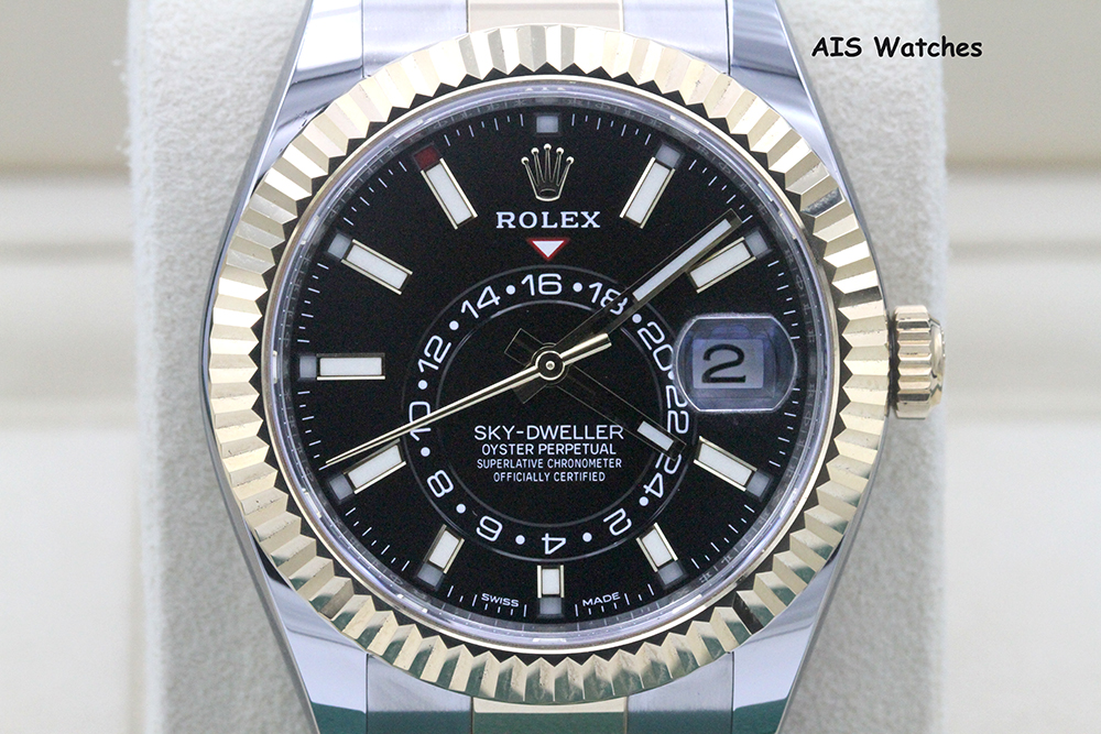 ** Rolex 326933 Sky-Dweller 18K Yellow Gold / Stainless Steel Black Dial Oyster Bracelet
