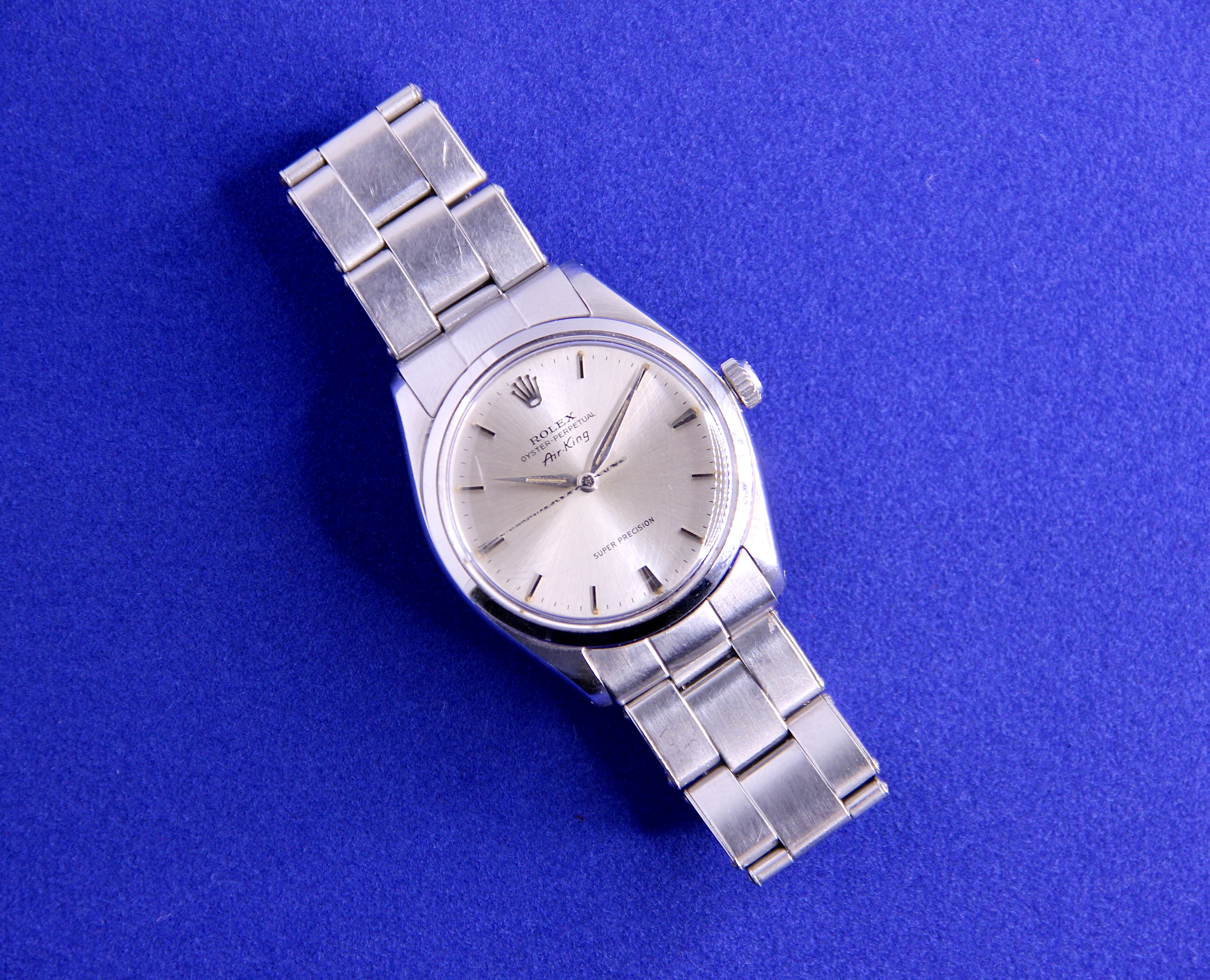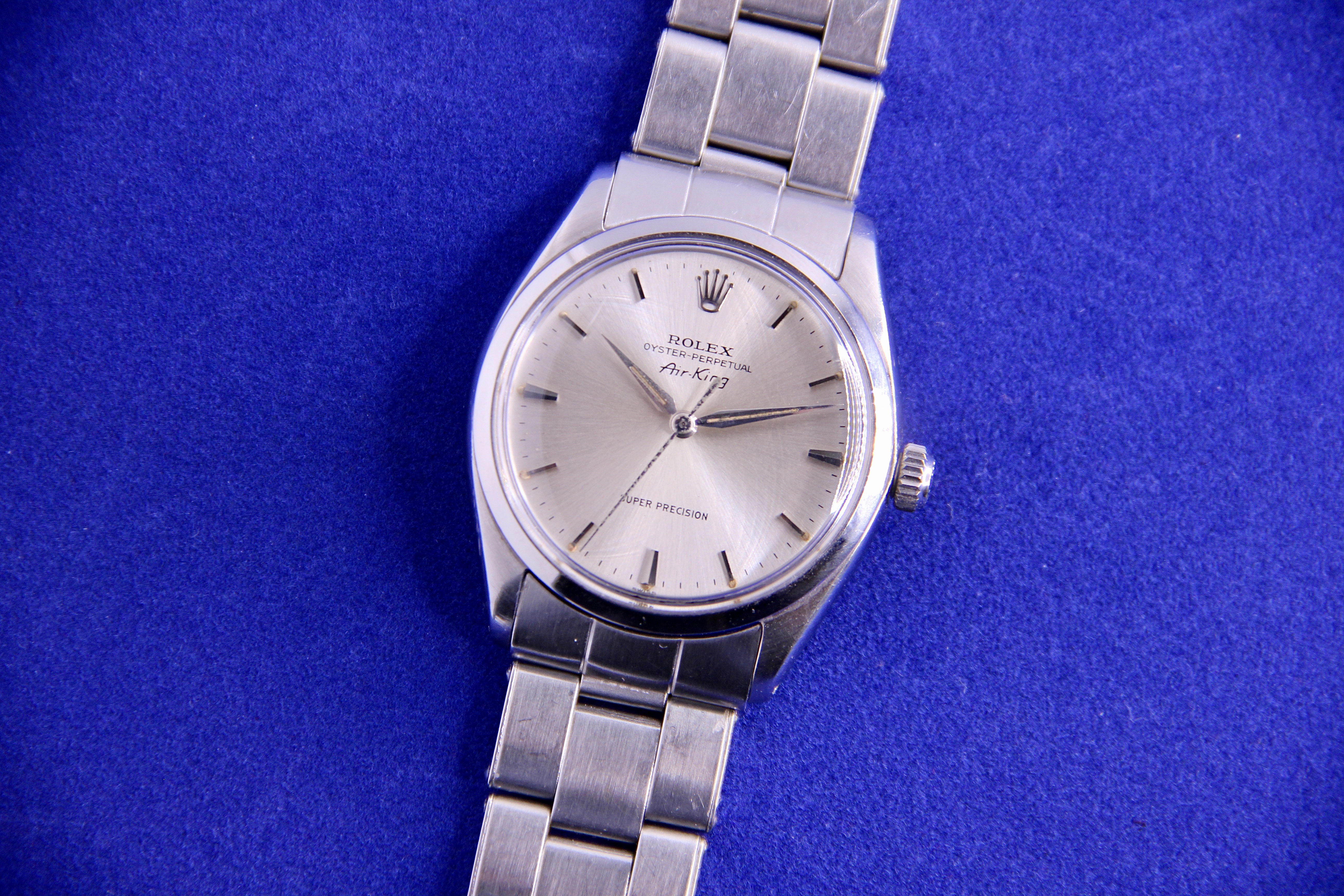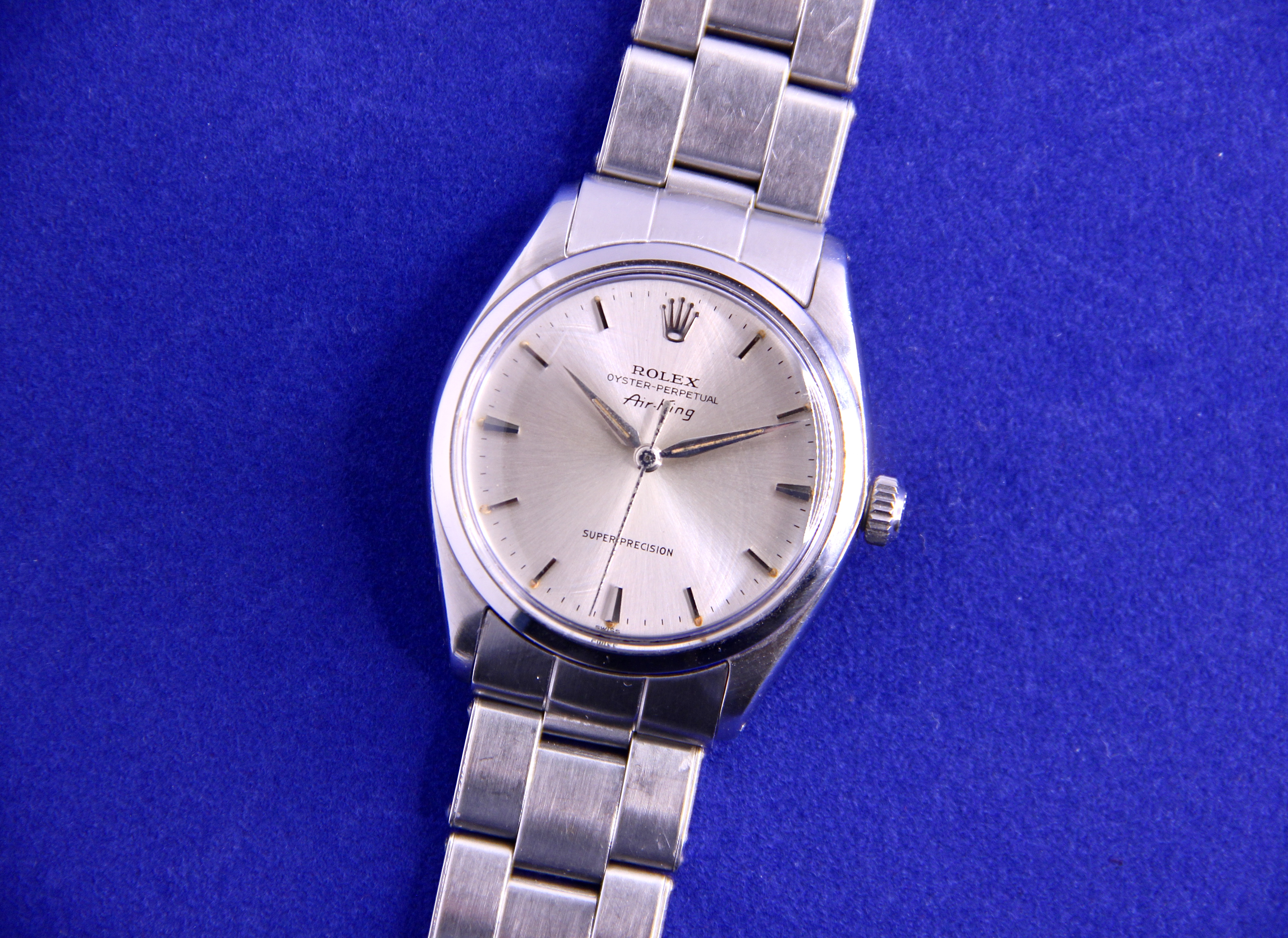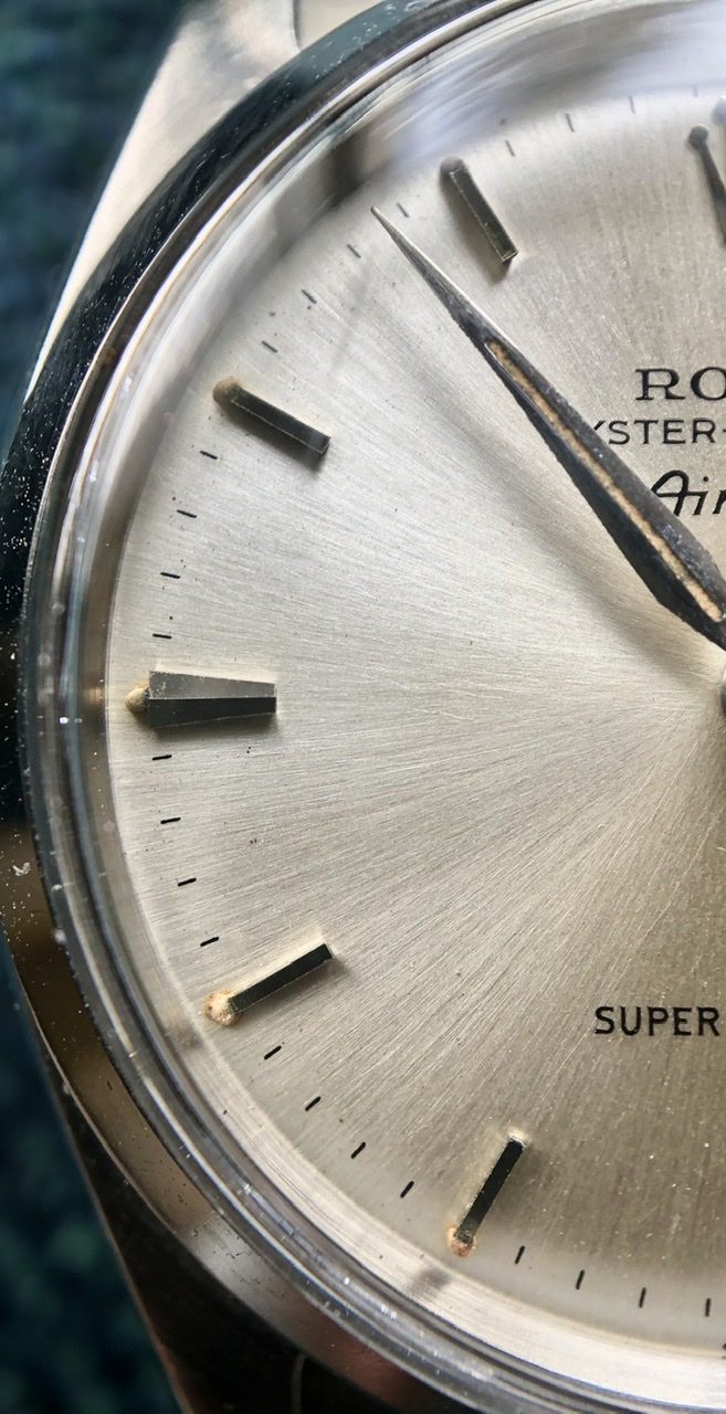 Up for sale today is my Rolex Air-King ref 5500 in stainless steel. This is an uncommon Super Precision variant with the automatic caliber 1530 and beautiful dauphine hands which in my opinion are such a quintessential design trait of this era. The lume on the dial and hands is original and has aged to a nice, creamy color. The watch comes on a late 1960s Rolex rivet oyster bracelet that will fit up to a 7.5" wrist.