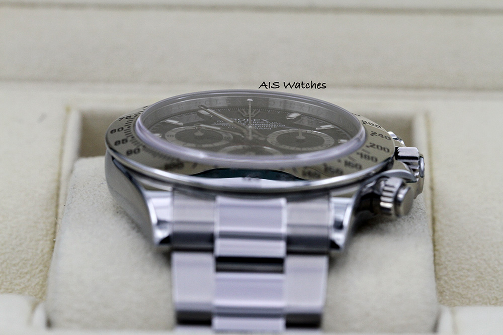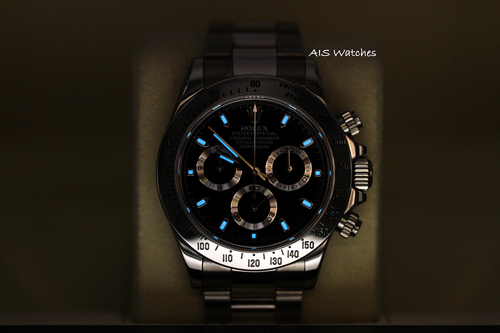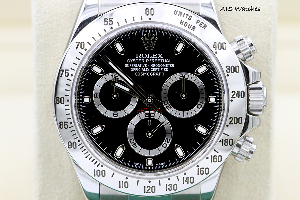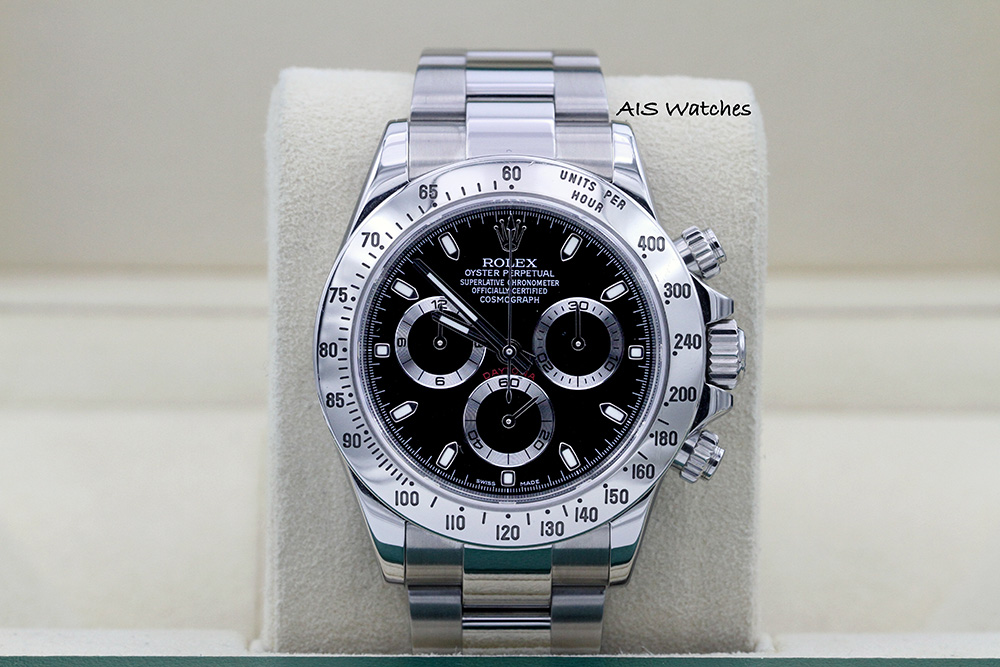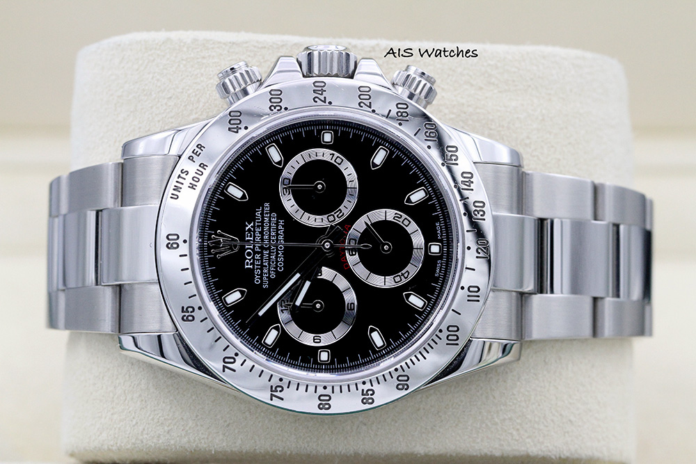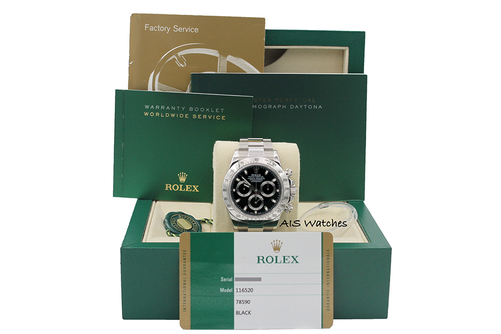 Up for sale is a Classic and Discontinued Rolex 116520 Daytona with Black Dial Box & Papers - 5-year warranty. The timepiece has engraved rehaut and newer style buckle. The timepiece is in good condition.