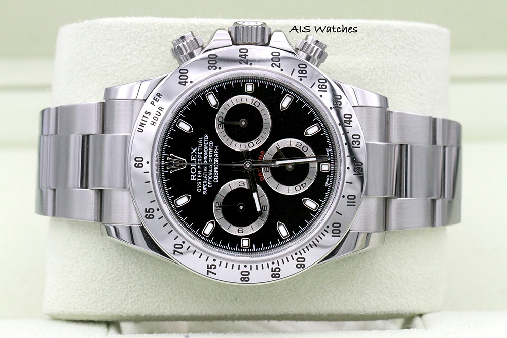Up for sale is a Classic and Discontinued Rolex 116520 Daytona with Black Dial Box & Papers. The timepiece has engraved rehaut and newer style buckle. The timepiece has minor swirls but overall condition will not disappoint.