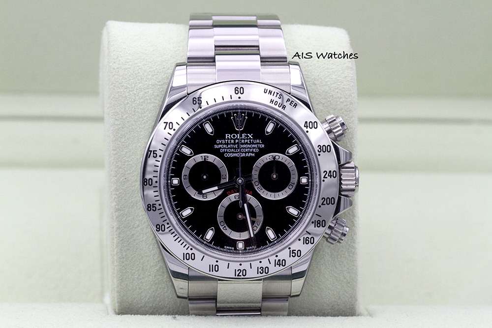 Up for sale is a Classic and Discontinued Rolex 116520 Daytona with Black Dial Box & Papers. The timepiece has engraved rehaut and newer style buckle. The timepiece has minor swirls but overall condition will not disappoint.