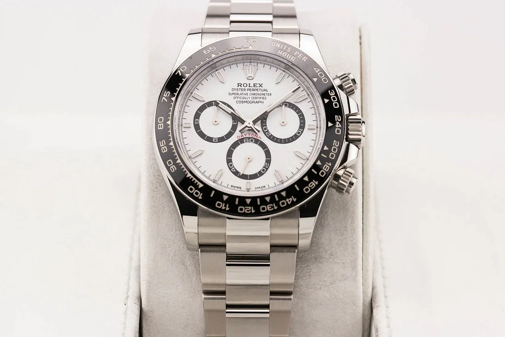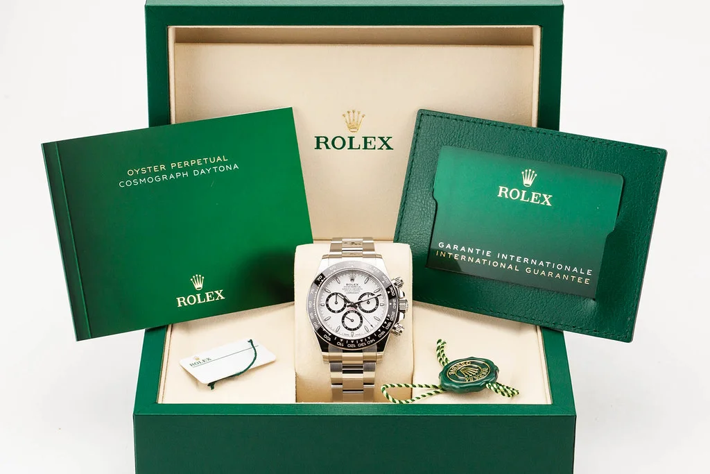 ·Up for sale is an excellent condition Rolex Cosmograph Daytona 40mm White Dial on Oystersteel Bracelet, reference # 126500LN. It comes complete with all newly redesigned boxes, papers, booklets, hang tags, and Rolex Warranty Card dated June 2025.