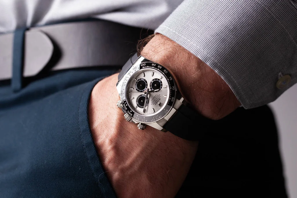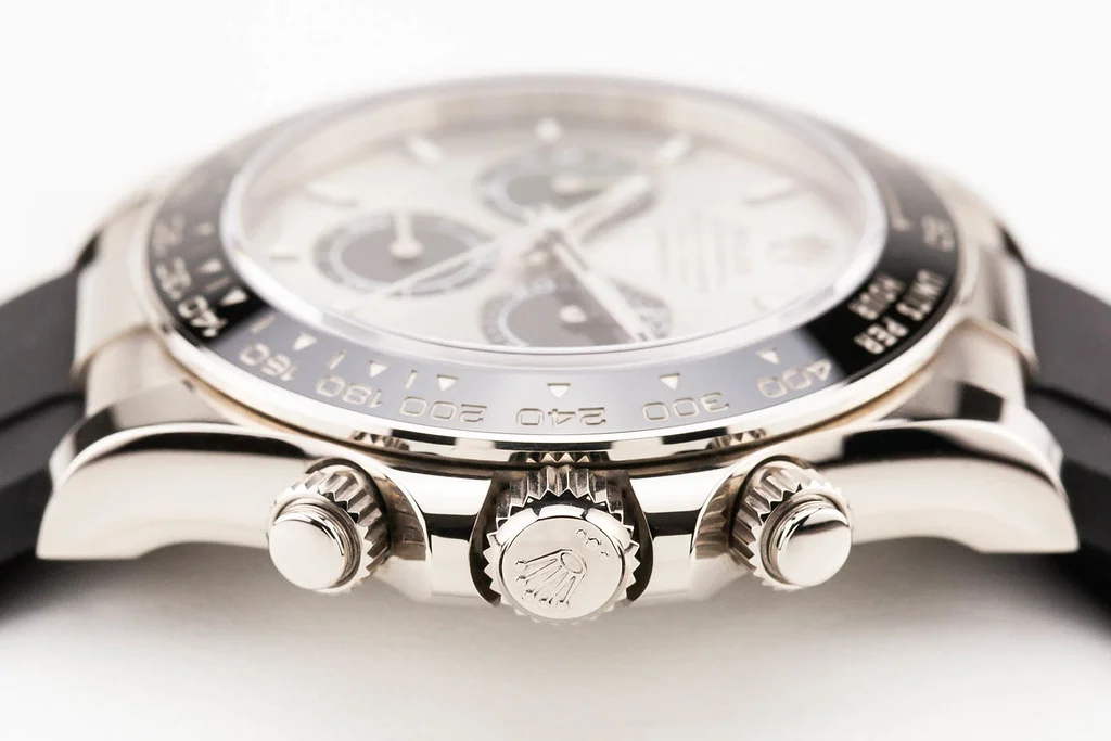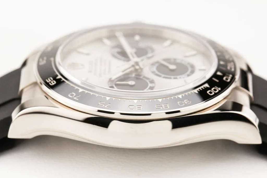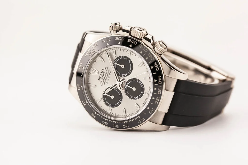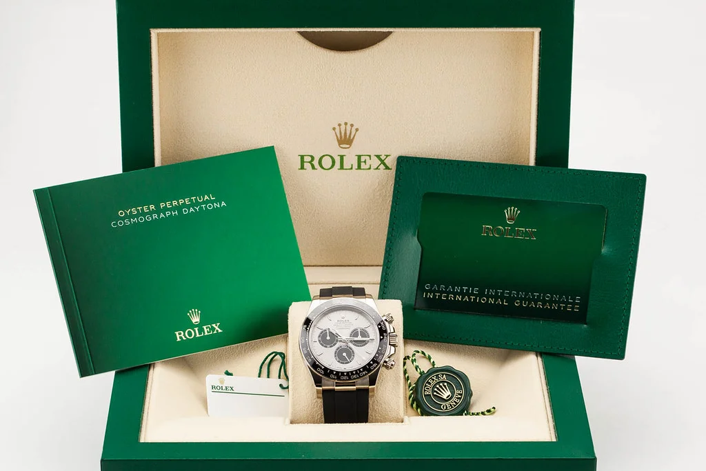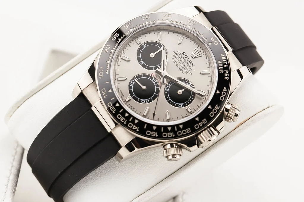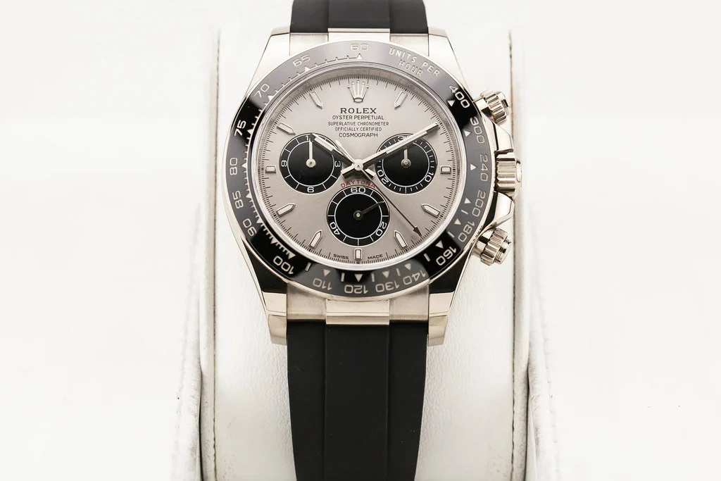 ·Up for sale is an excellent condition Rolex Cosmograph Daytona 40mm White Gold Grey and Black "Ghost" Dial on D/E sized Oysterflex Strap, reference # 126519LN-0005. It comes complete with all boxes, papers, booklets, hang tags, and Rolex Warranty Card dated December 2023.