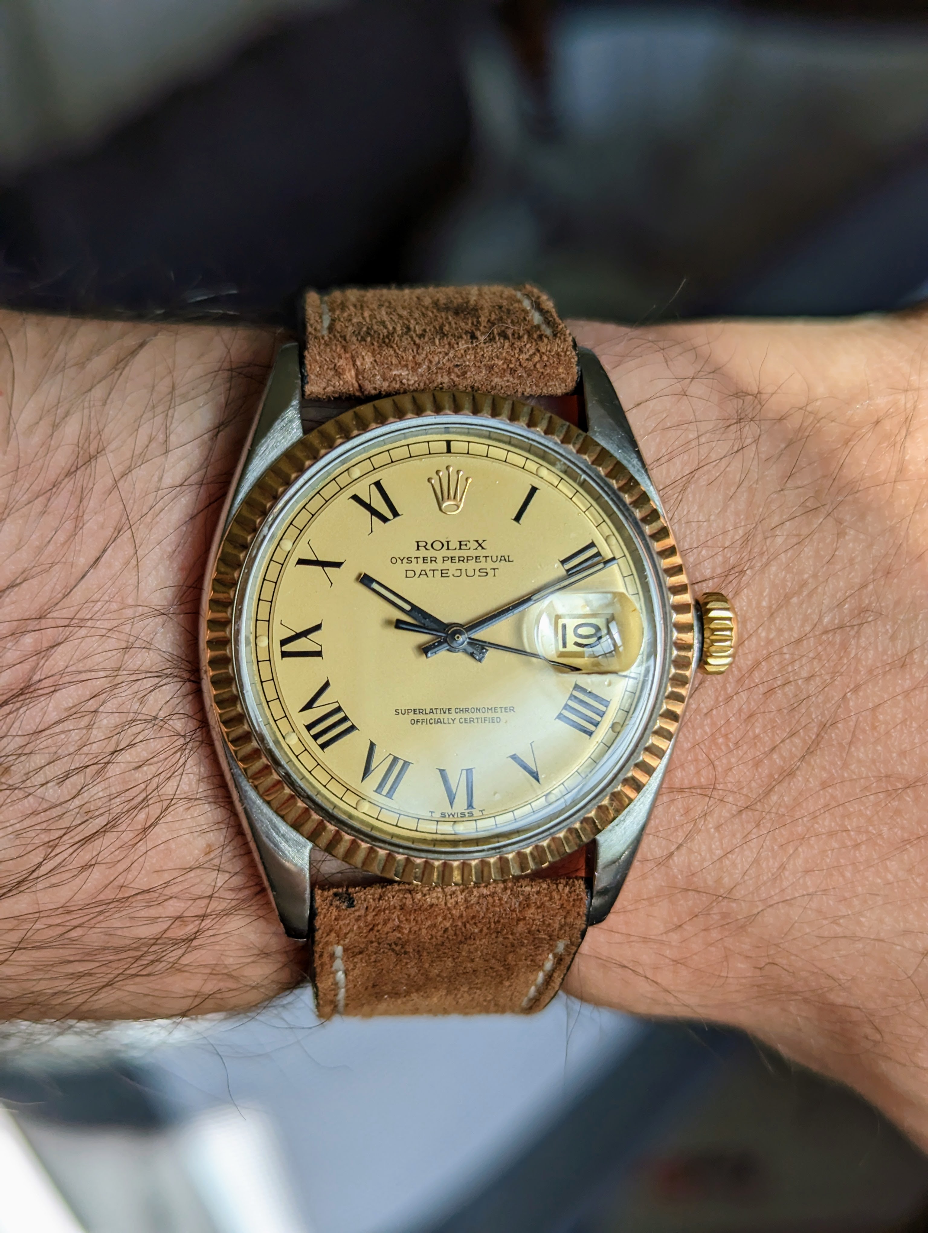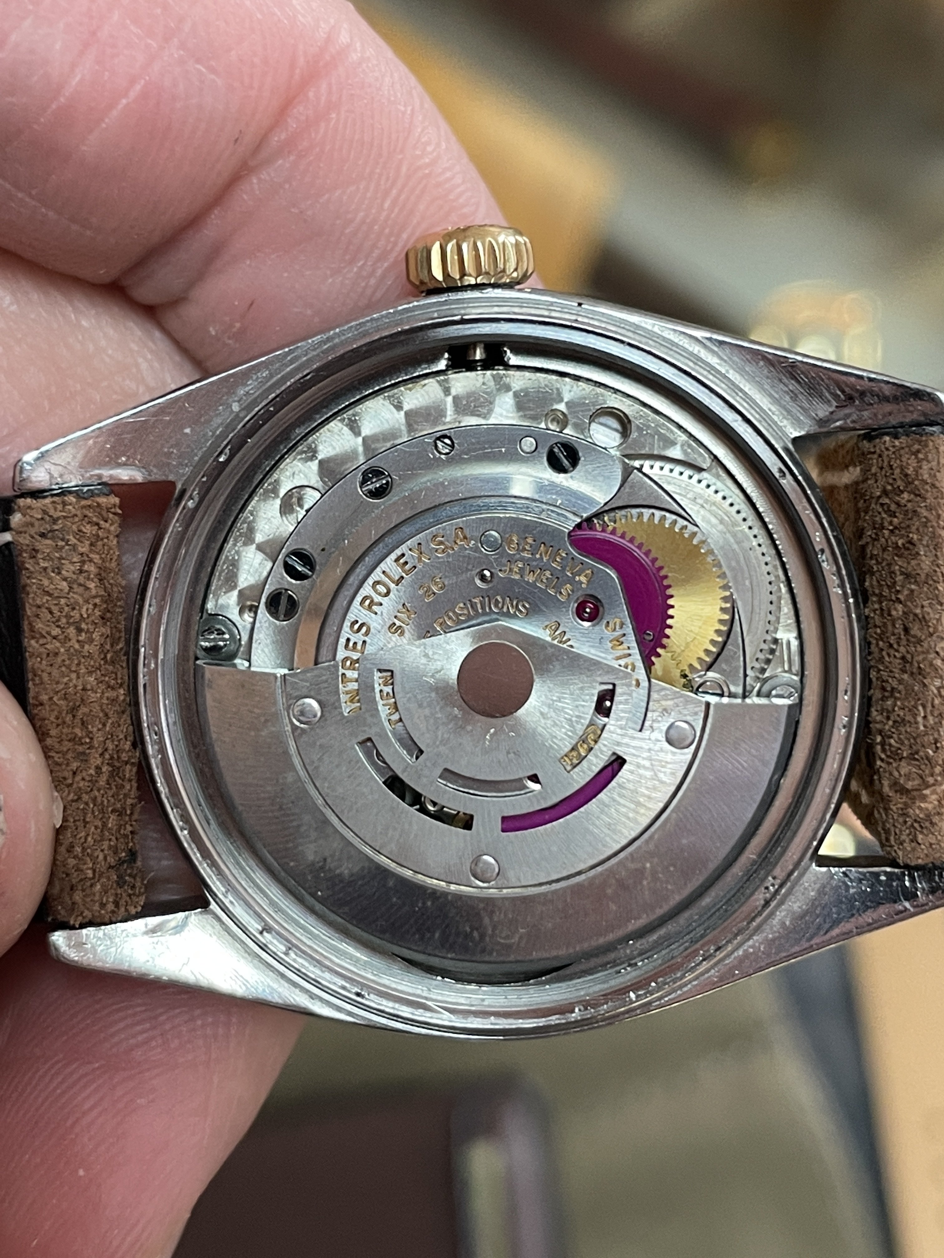 MOVEMENT: Rolex automatic self winding caliber 1570. 25 Jewels, 19800 frequency, 48h power reserve. Service history is unknown. The watch winds, sets and runs and is currently keeping good time. The watch was timed over a 24hr period. The 24hrs included periods of wear and non-wear. Over those 24hrs the watch lost 14 seconds.