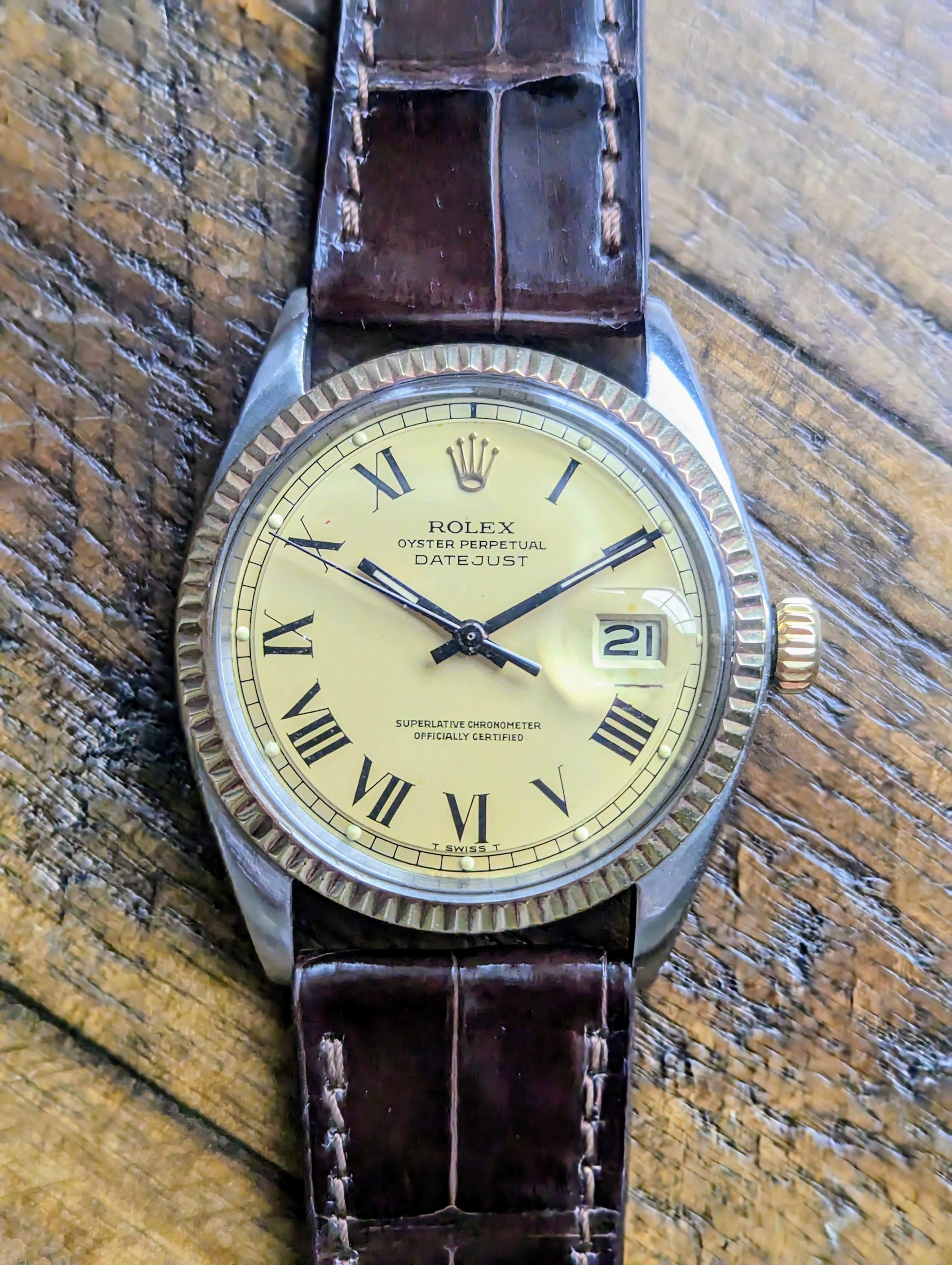 CASE: The previously polished 36mm steel case is in fair shape. The lugs appear more rounded due to past polishing and have lost their original brushed finishing and crisp lines. The 18kt yellow gold fluted bezel is in good shape. The case is complete by its screw-down case back and original crown.