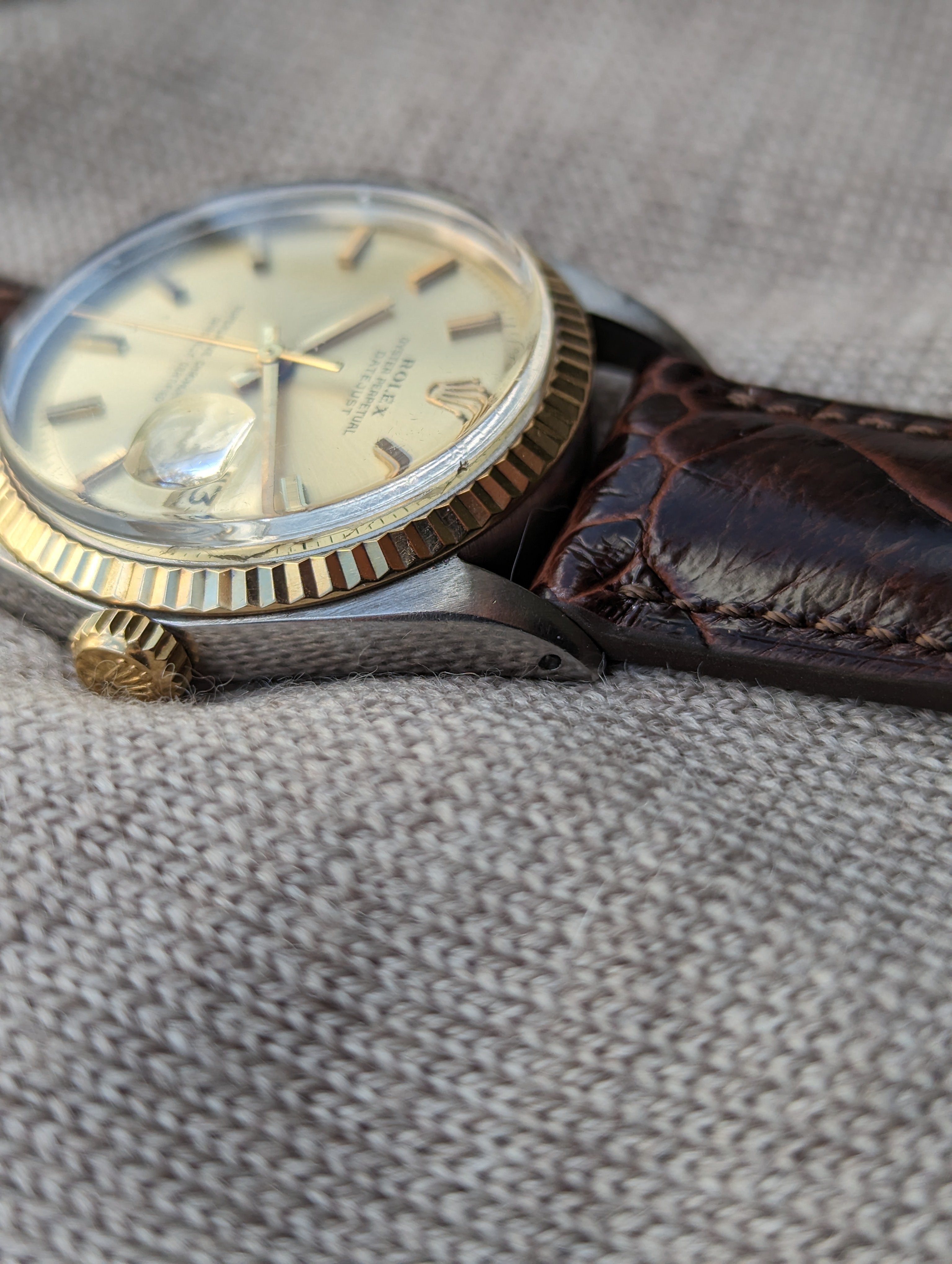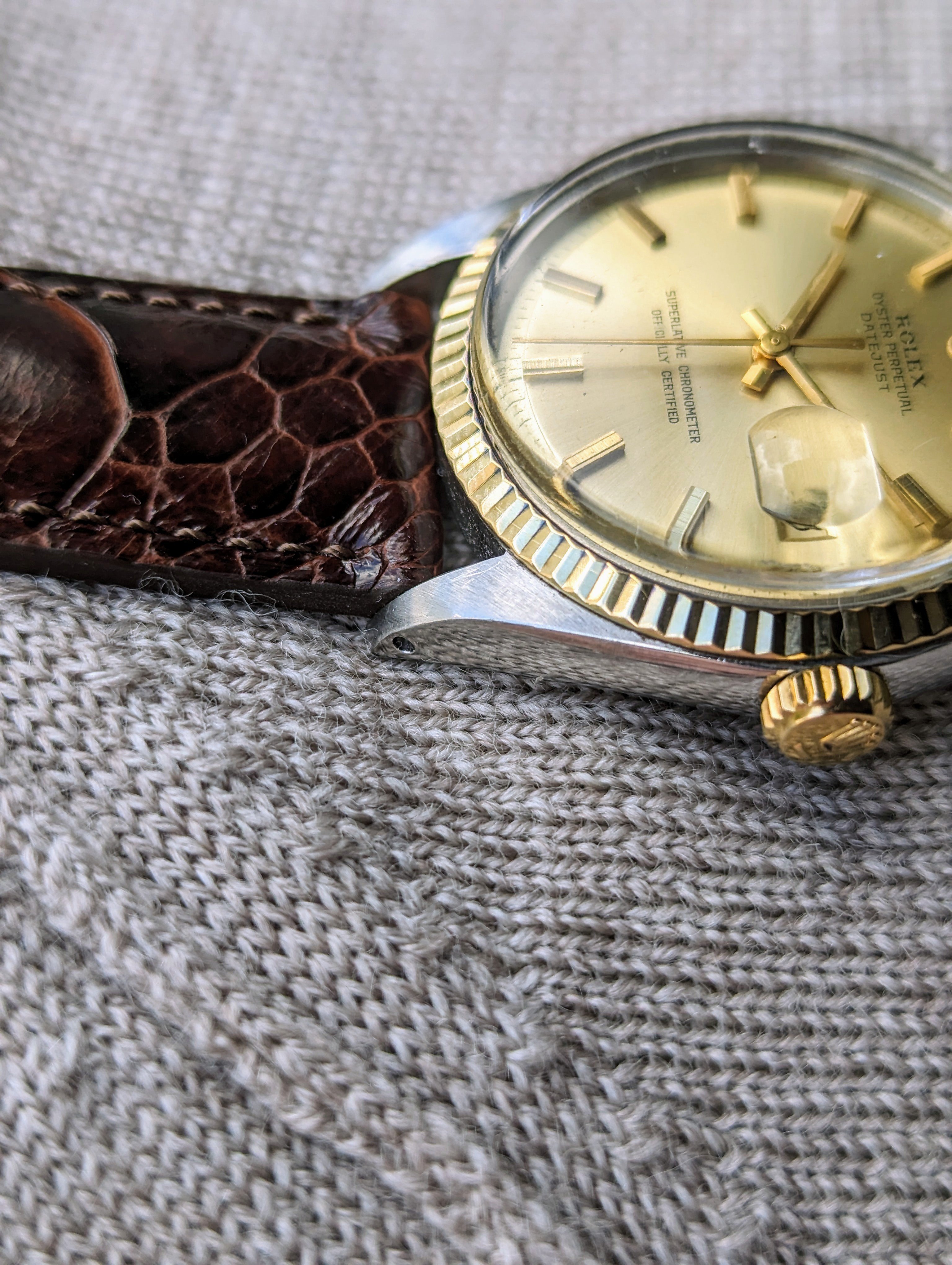 DIAL: An original, champagne sunburst dial. This is a non-luminous dial variation. The dial is clean. It appears to be free of any staining or imperfections as evidenced by photographs. It features baton style hour markers and hands.