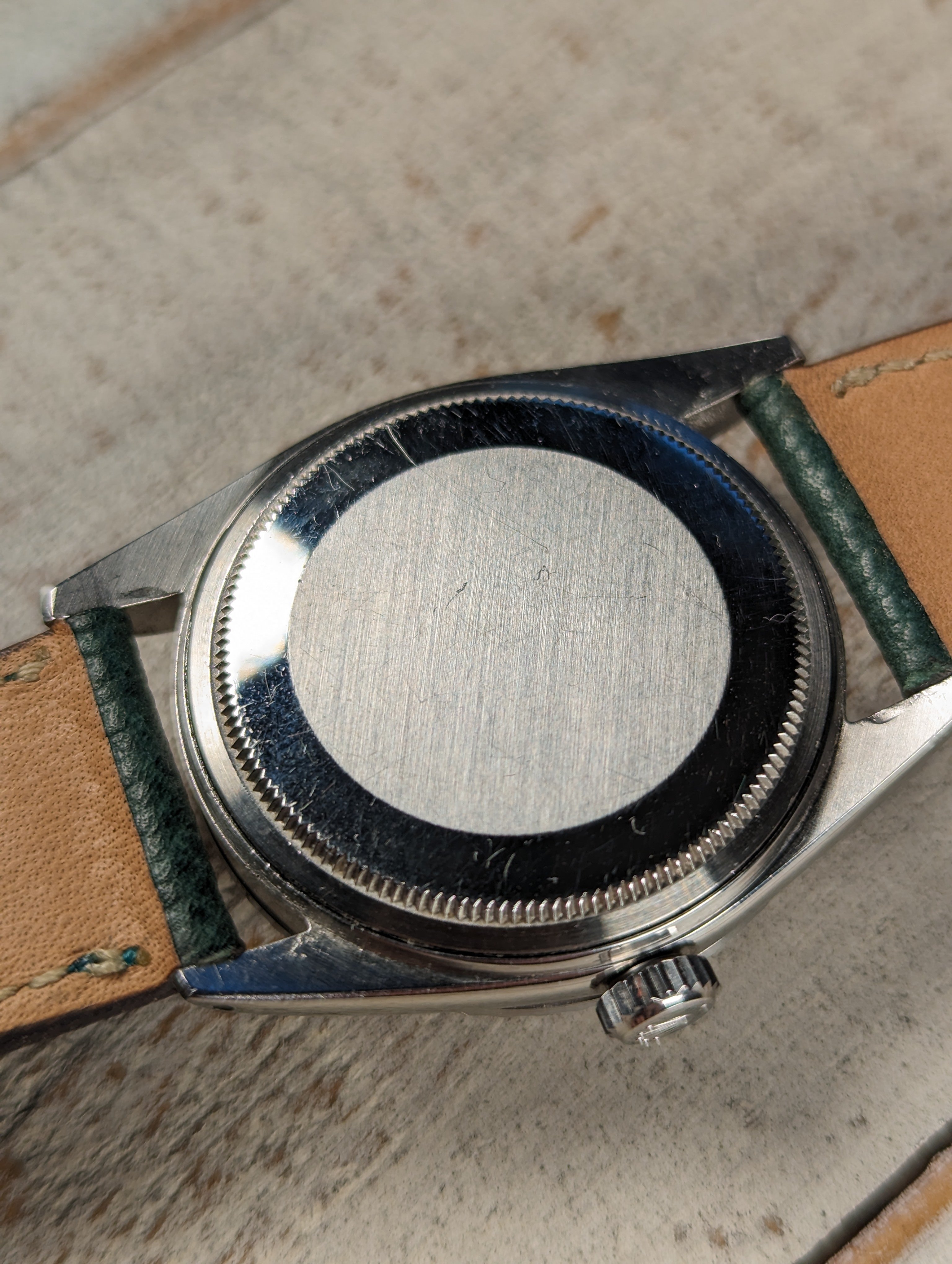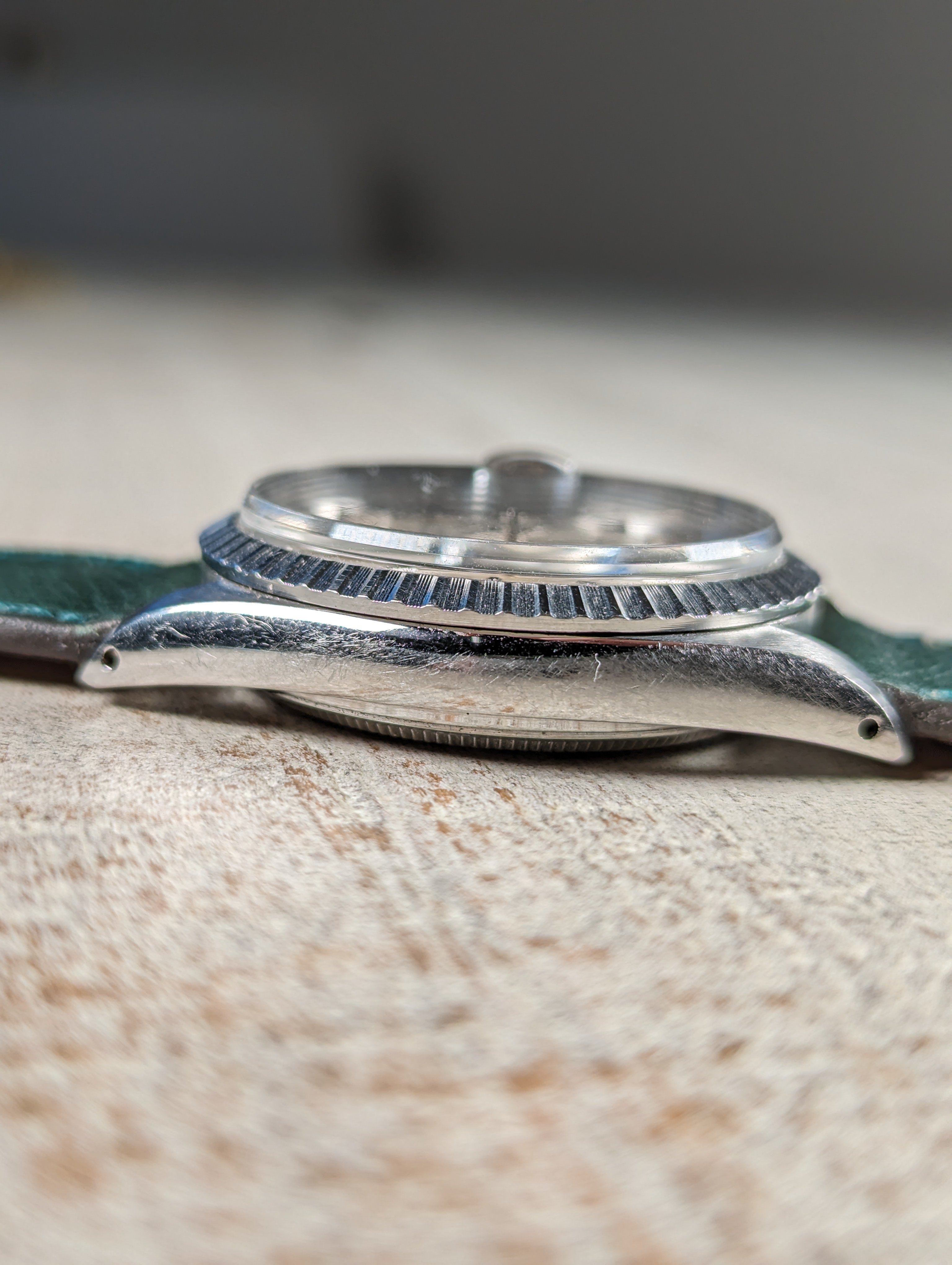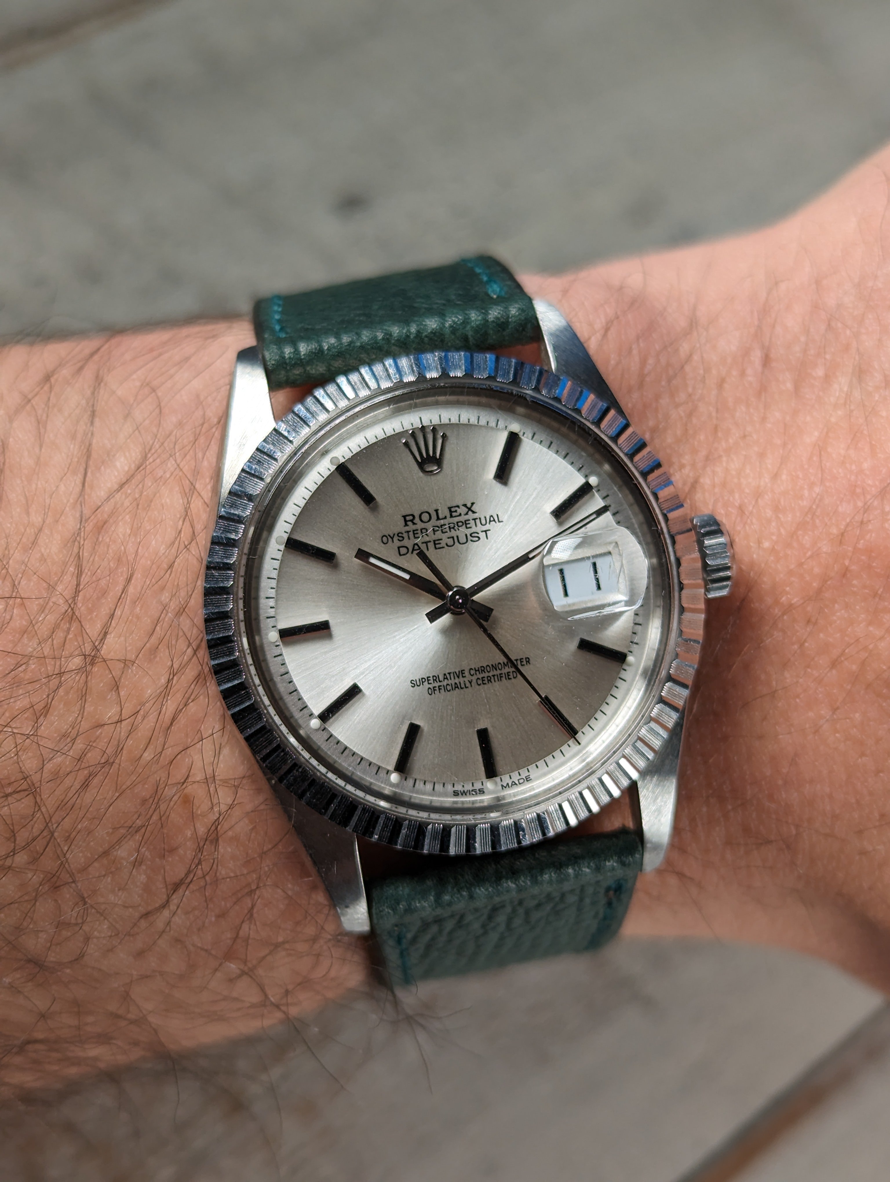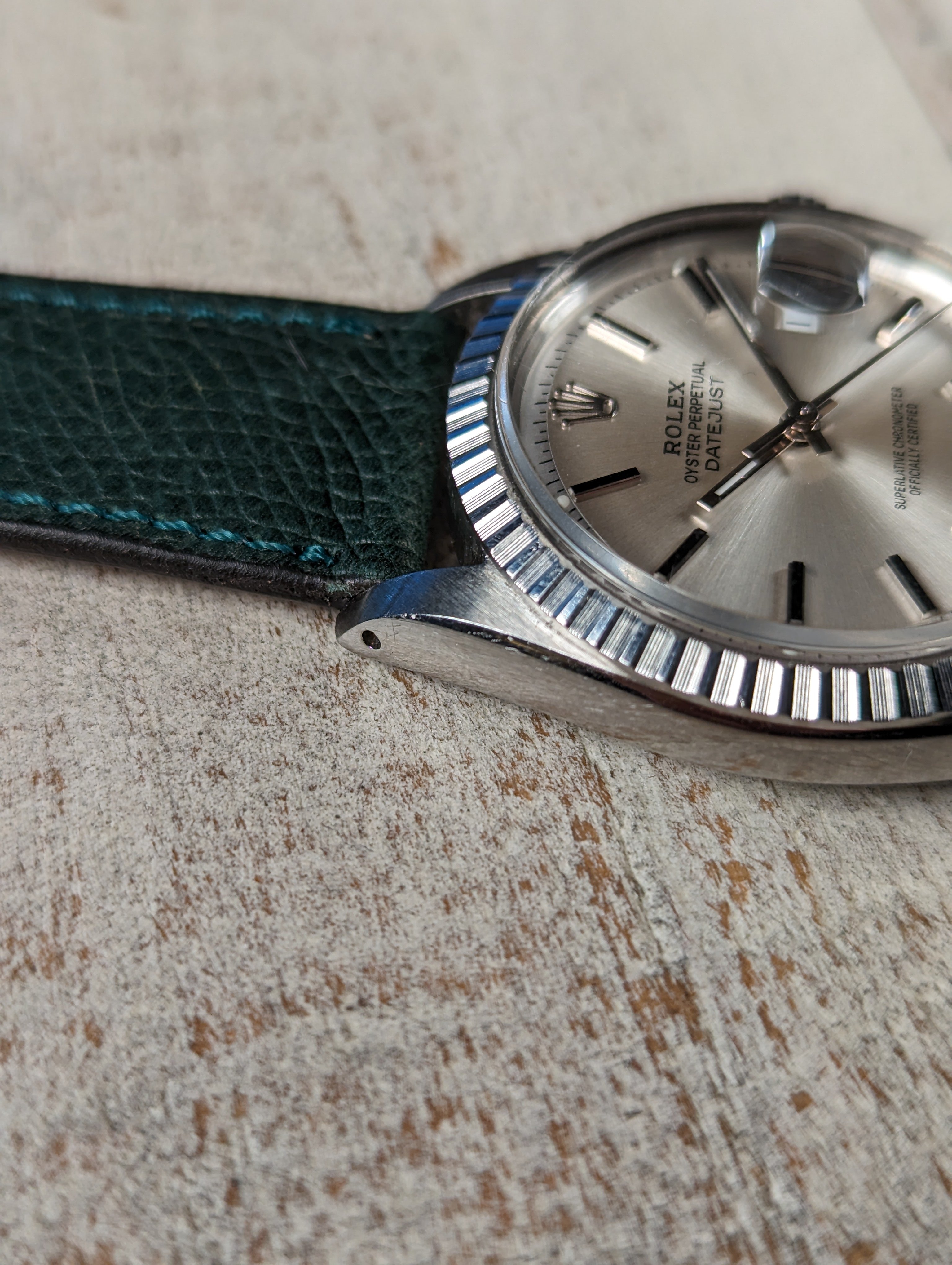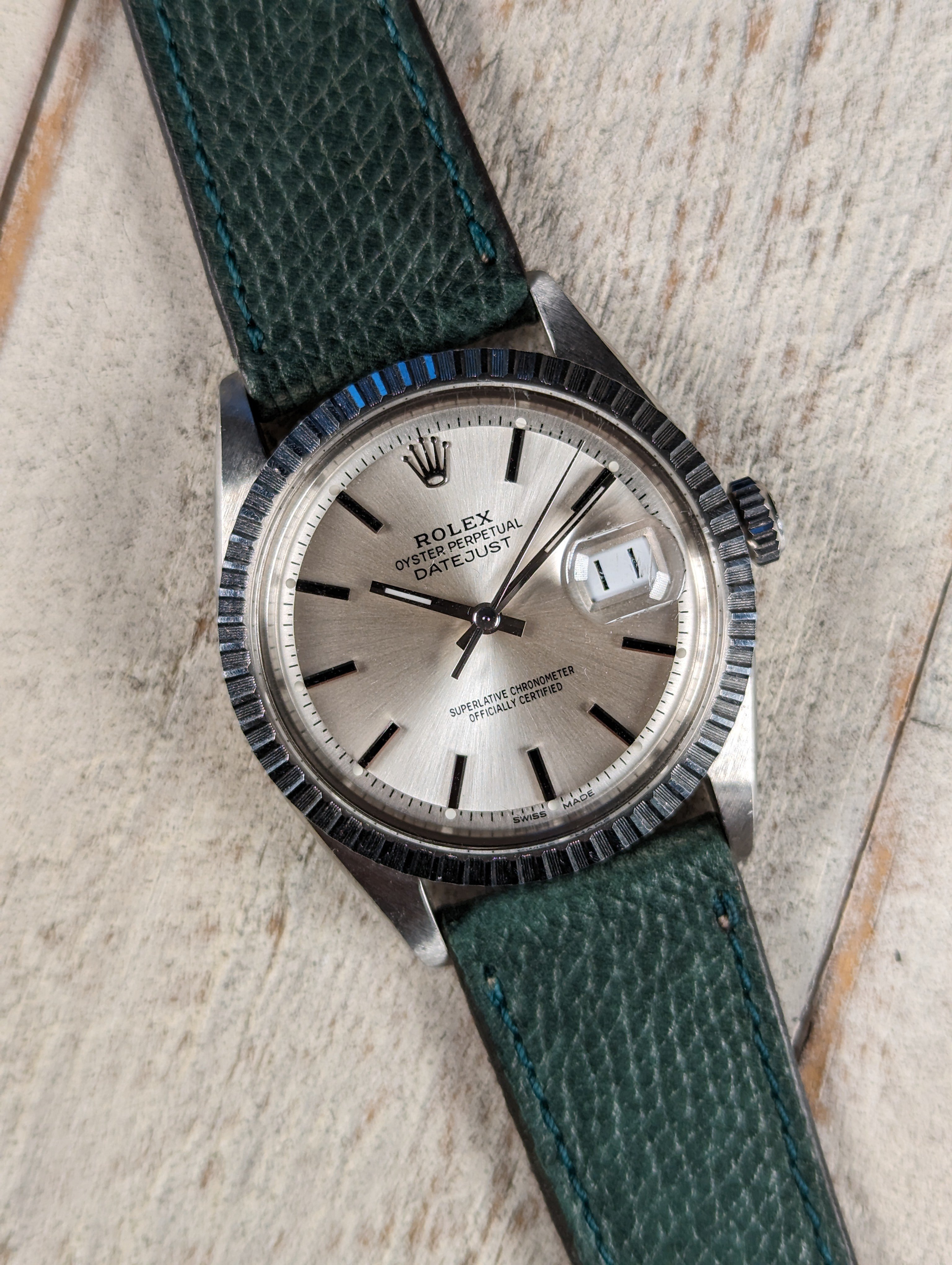 BRACELET: We have paired this clean datejust with a complimenting handmade, hand stitched and hand painted Italian calf skin strap from TorreStraps.