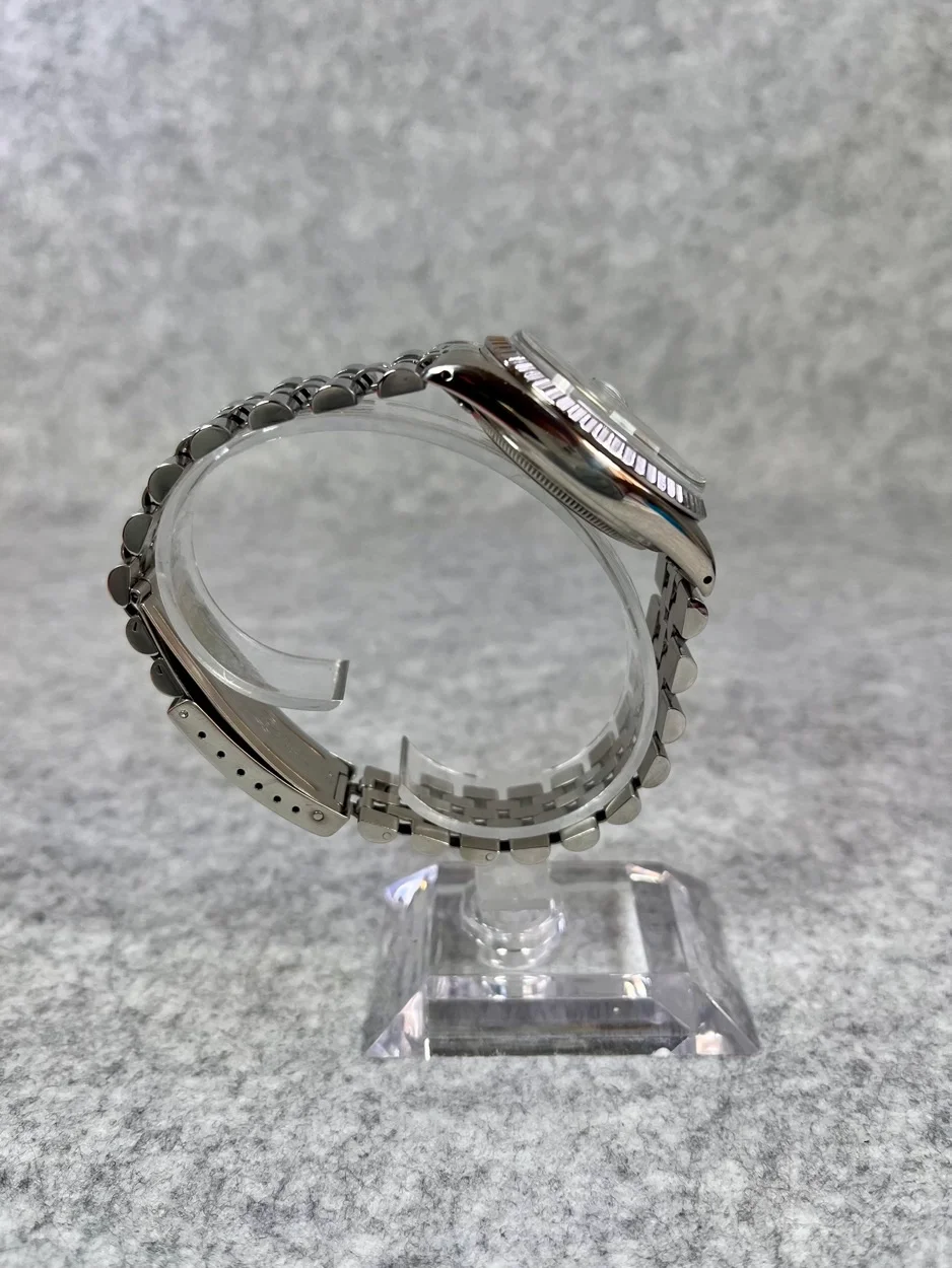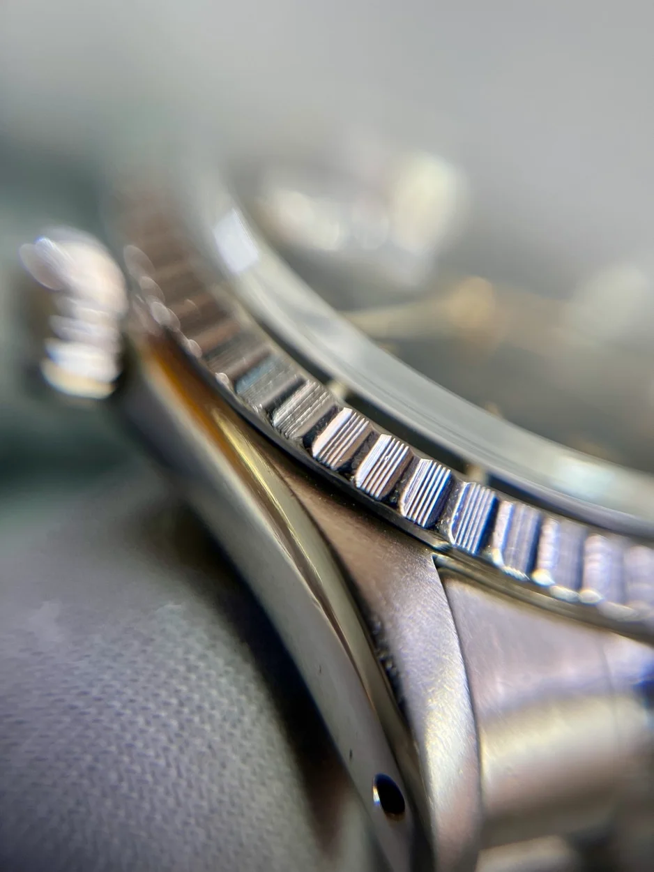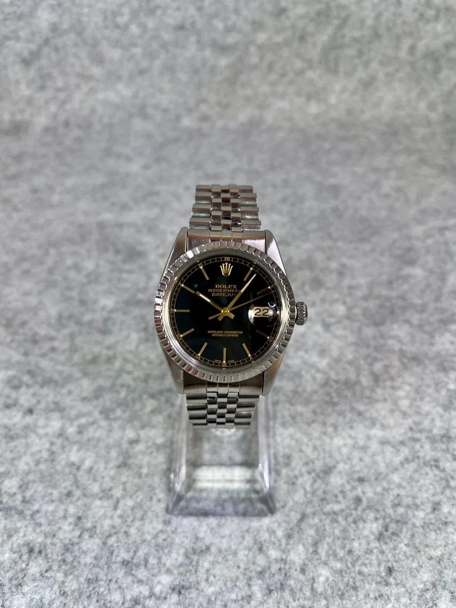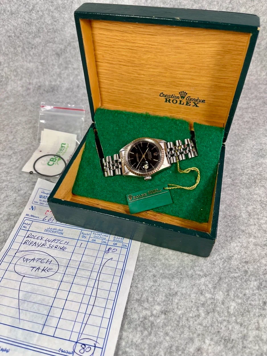 Up for sale is my Rolex Datejust 16030. Asking £3,950 Or Best Offer. The watch is from 1980, and in excellent cosmetic and mechanical condition—worn minimally and always stored properly. The 16030 features a 36mm stainless steel case with a distinctive engine-turned bezel, offering a refined vintage aesthetic. There is a lovely contrast between the gloss black dial and gold baton markers. For a watch of its age there is some sagging to the original bracelet but is still totally wearable and robust. Comes as a partial set with box and Rolex hang tag. It’s been stored in a PELI 1450 watertight case (not included) in a temperature-controlled room, opened monthly to give the movement a full wind.