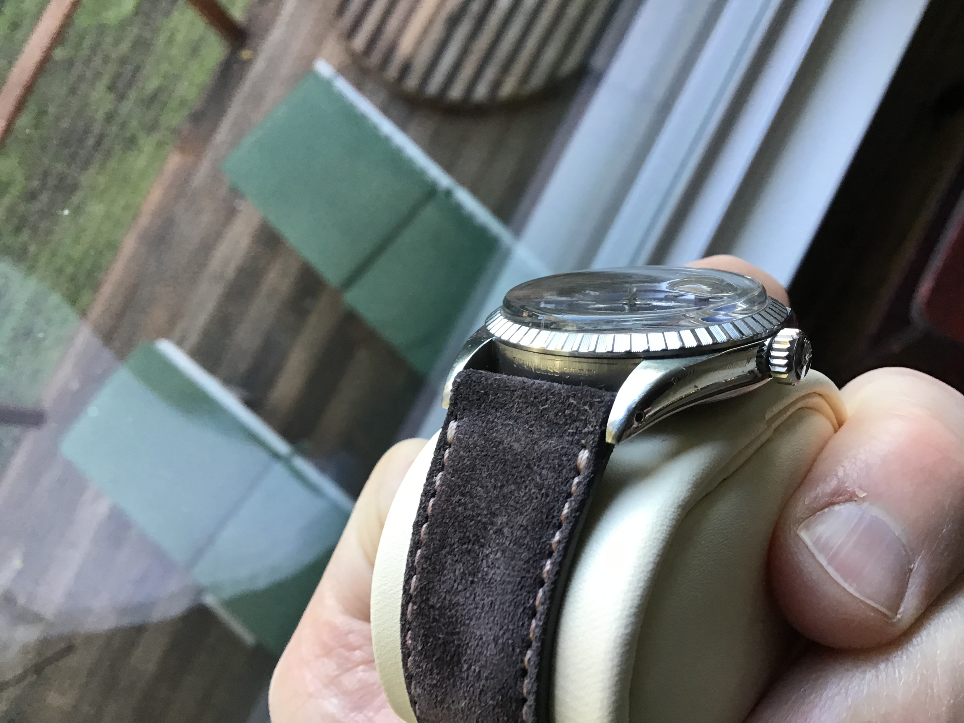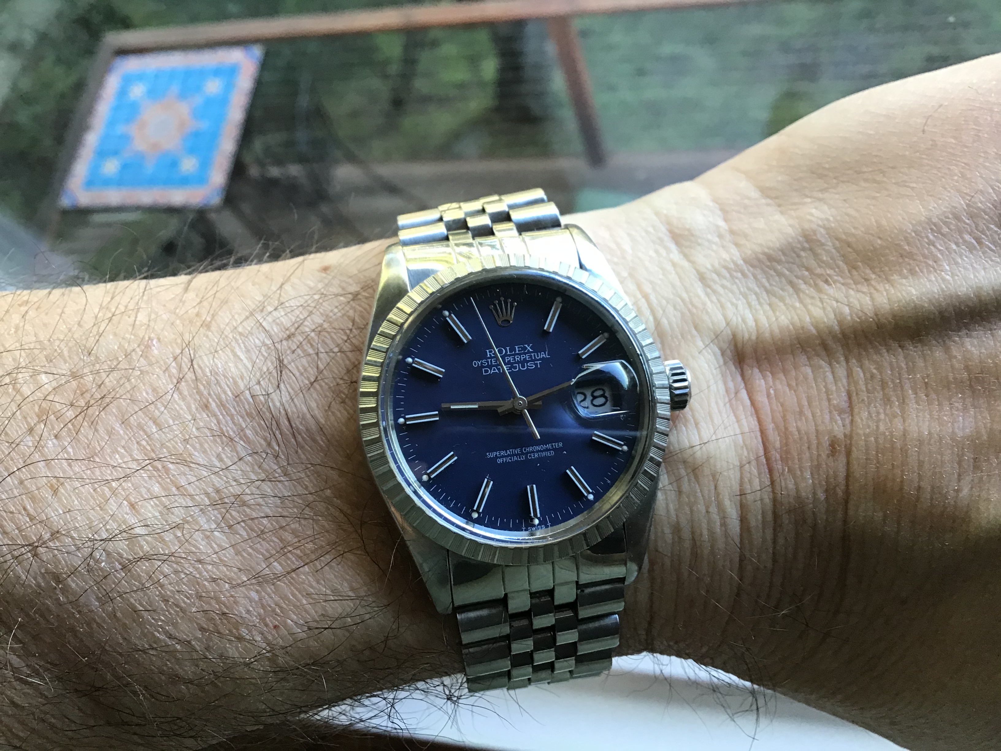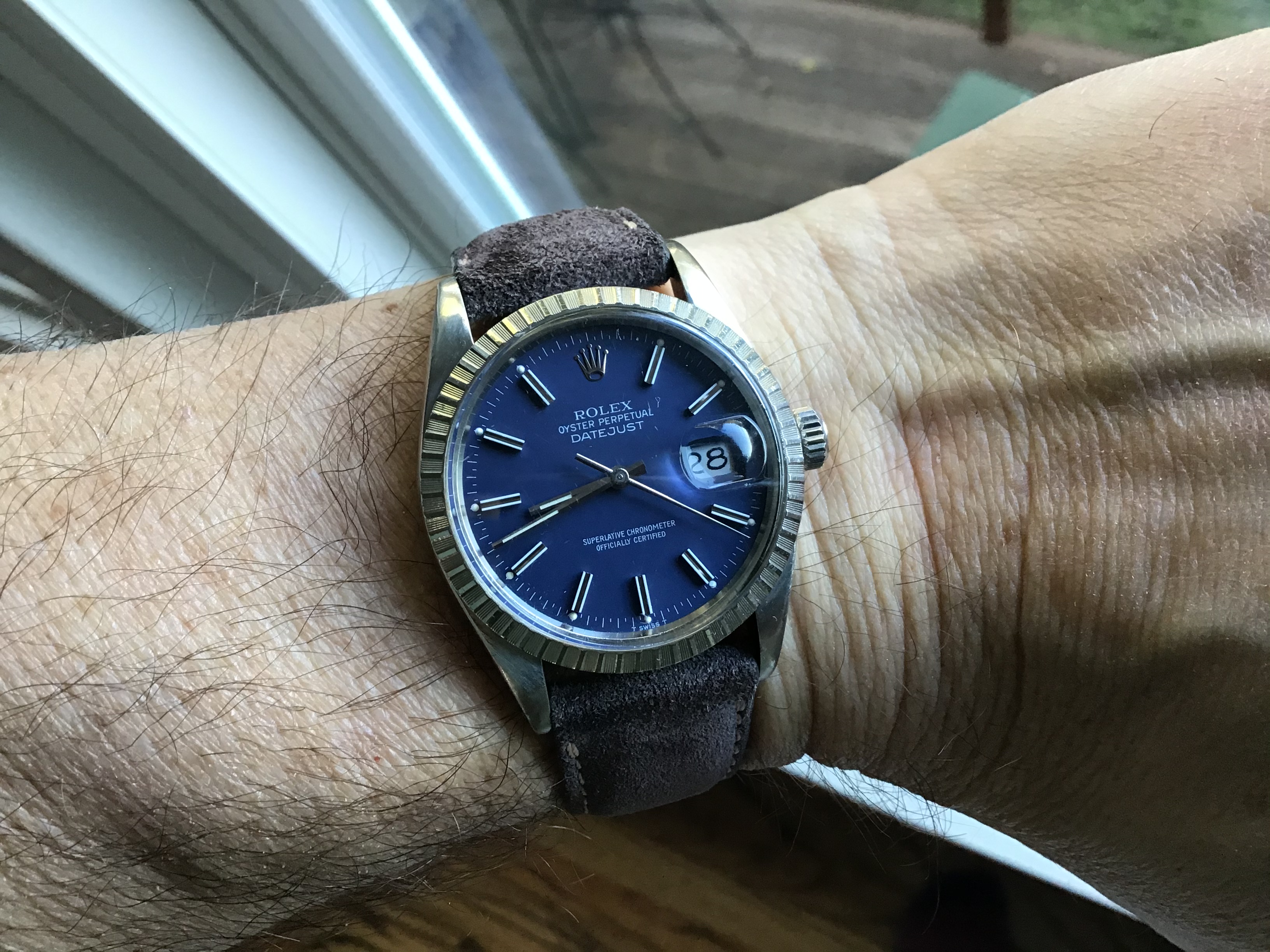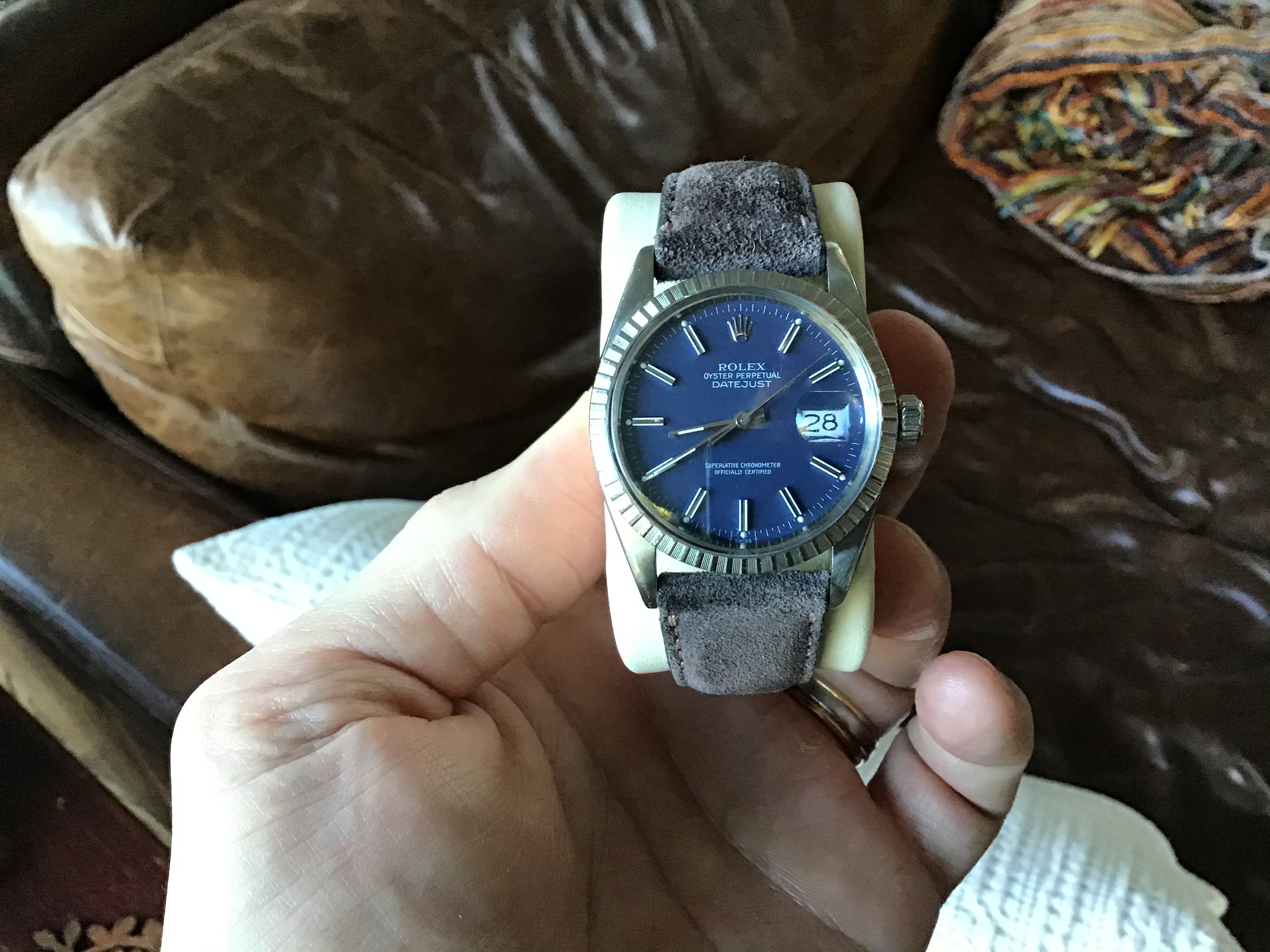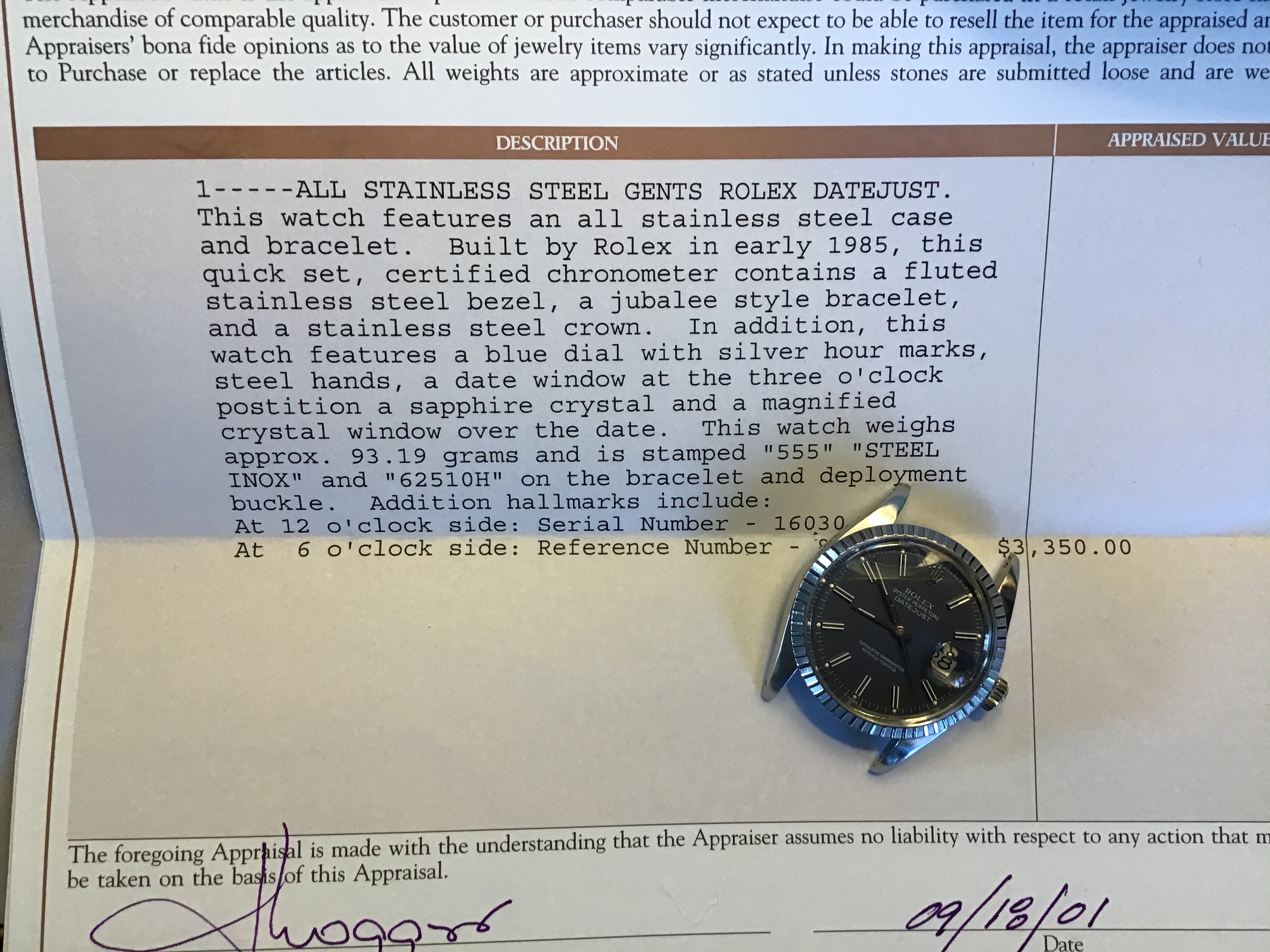 ·Hi all, for sale is my Dad’s 1985 DJ 36mm with blue dial. I just bought him a new one for Christmas, so selling this for him. He was not the original owner. He bought it in 2001, and had it authenticated and appraised then. It was serviced by Ben Bridge in Seattle in 2012. No service papers, but we have the 2001 appraisal (see photos). About the sale: watch only (no box / papers). The watch definitely has character and is showing its age. He wore it just about everyday for 19 years, and wear is evident (please see pictures). Bracelet has stretch, but still wears nicely on the wrist and is super comfortable. Also included in sale is the vintage grey suede Bulang & Sons watch strap. The strap has some wear but was worn maybe a total of 10 times. My dad wore the watch only on the bracelet. The B&S strap is from my collection. The watch is keeping good time. It’s lost about 4 seconds over the last 48 hours.