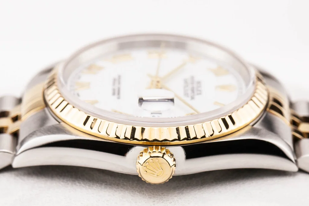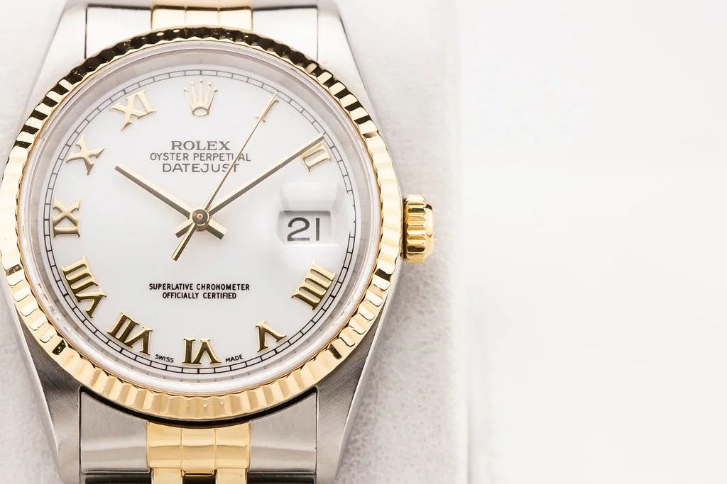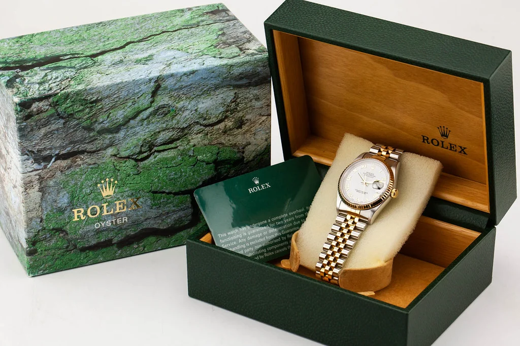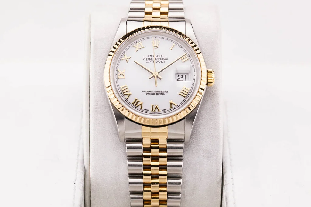 ·Up for sale is an excellent condition Rolex Datejust 36 Two-Tone White Roman Numeral Dial - Fluted Bezel - Jubilee Bracelet, reference # 16203. P-Serial, which puts this watch's production year around 2000. It comes with everything shown - boxes and Rolex Service Centre Card dated February 2021. No warranty card.