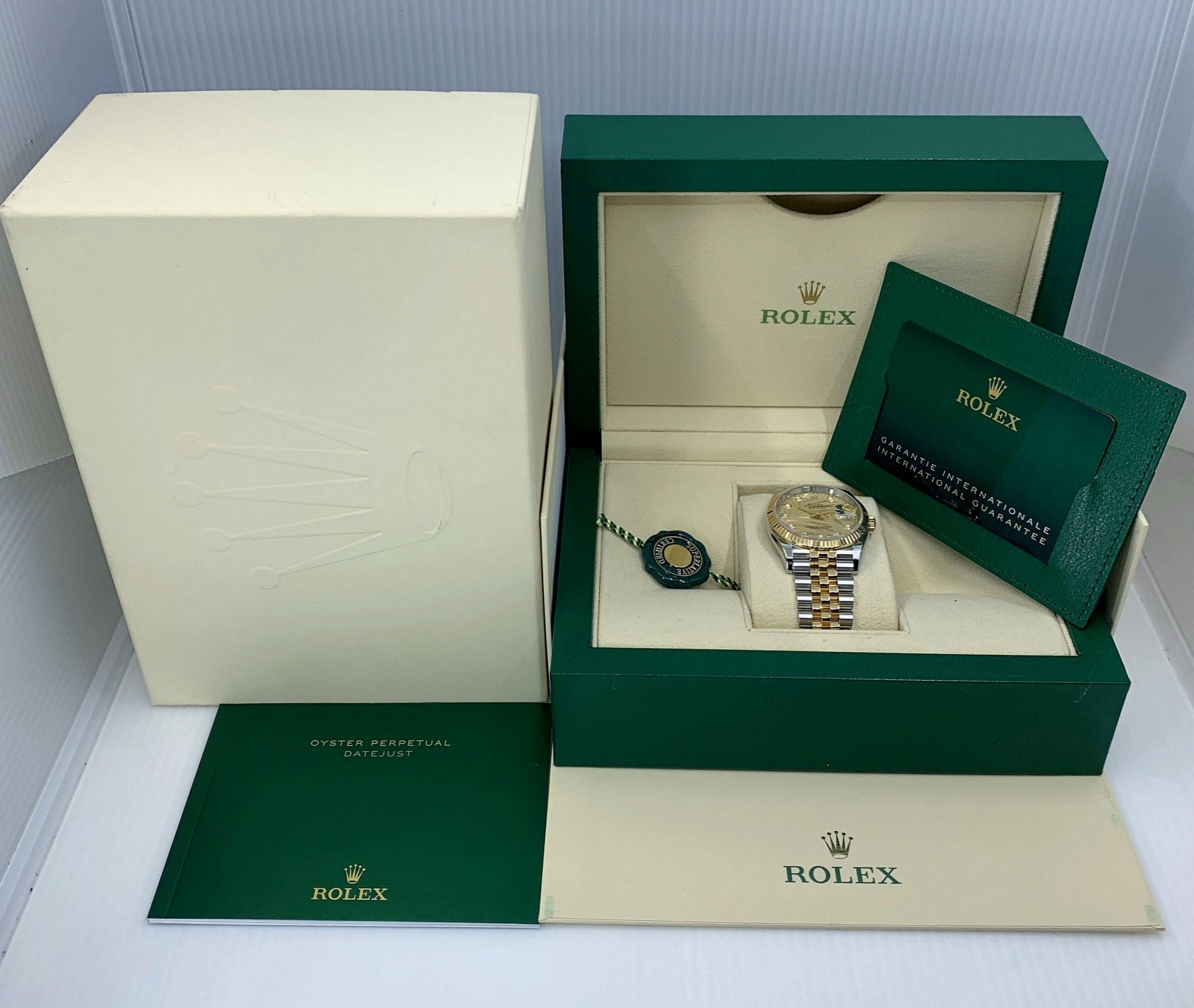 The watch comes with Box and Papers including International Warranty Card, Datejust Booklet and Green Tag