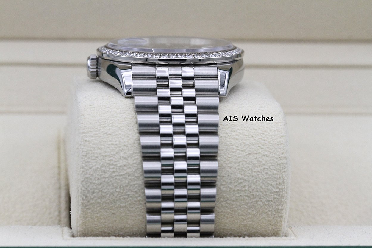 Up for sale is a discontinued Rolex Datejust 36MM 126284RBR Factory Diamond Bezel Jubilee Palm Green Dial Box & Papers. The timepiece is in excellent condition.
