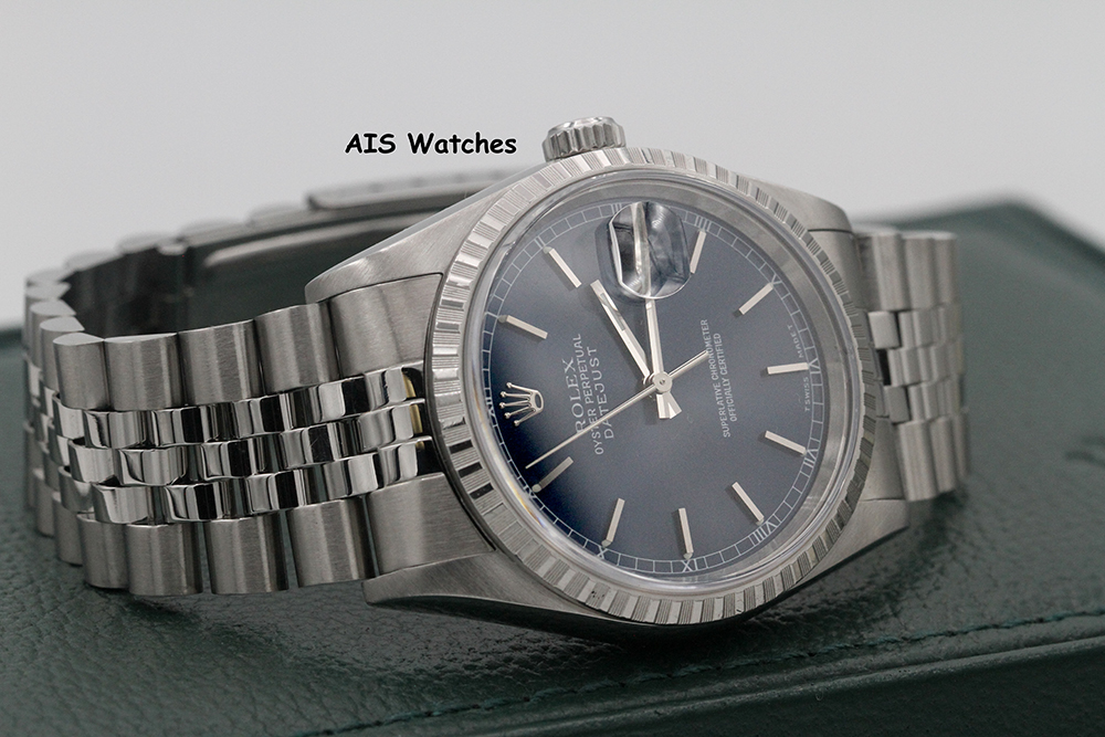 Up for sale is a Classic Rolex Datejust 36MM 16220 Blue Stick Dial A Serial Fluted Bezel / Jubilee Bracelet Stainless Steel Box & Papers. One Owner timepiece with minimal bracelet stretch. Watch is in excellent condition and was serviced by my watchmaker - 06/2021