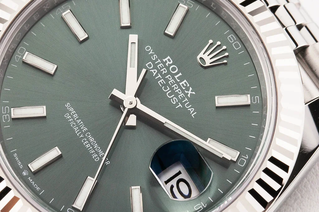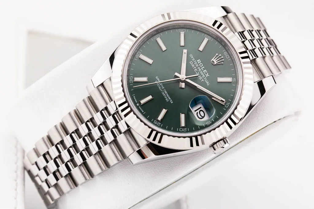 ·Up for sale is a brand new Rolex Datejust 41 with Mint Green Stick Dial with Fluted Dial on Jubilee Bracelet, reference # 126334. It comes complete with all boxes, papers, booklets, hang tags, and Rolex Warranty Card dated February 2025.