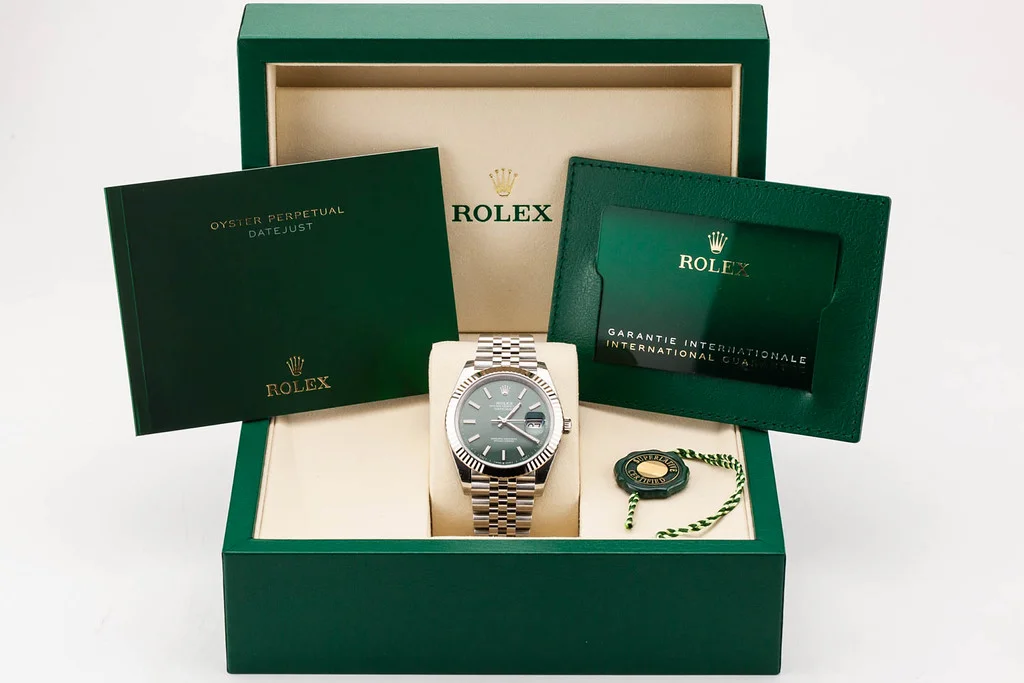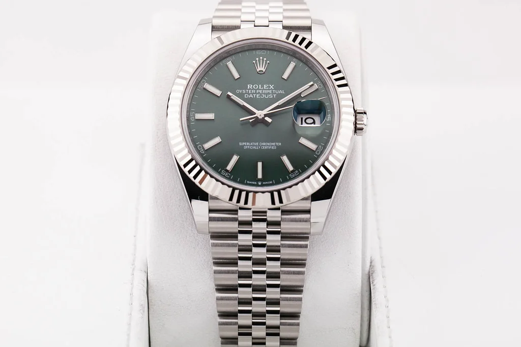 ·Up for sale is a brand new Rolex Datejust 41 with Mint Green Stick Dial with Fluted Dial on Jubilee Bracelet, reference # 126334. It comes complete with all newly redesigned boxes, papers, booklets, hang tag, and Rolex Warranty Card dated November 2025.