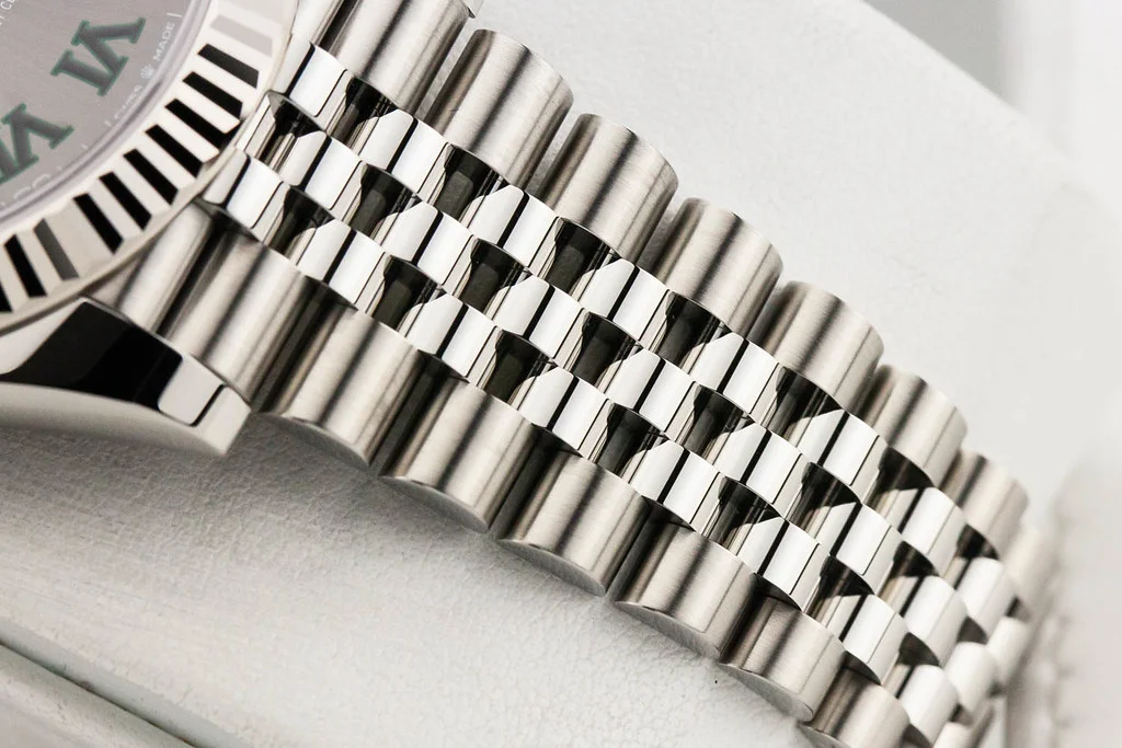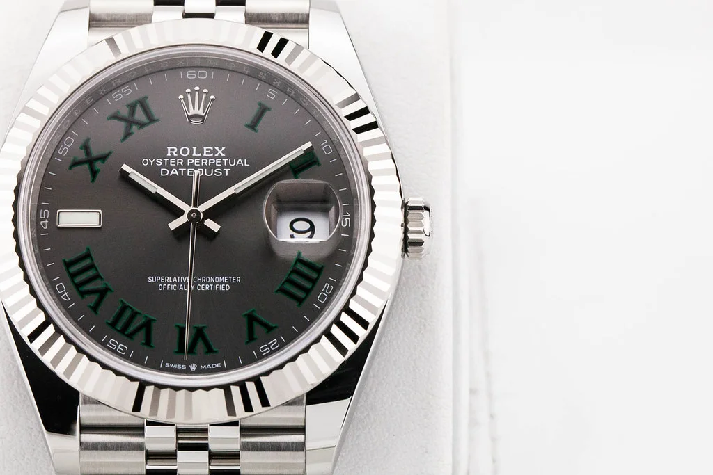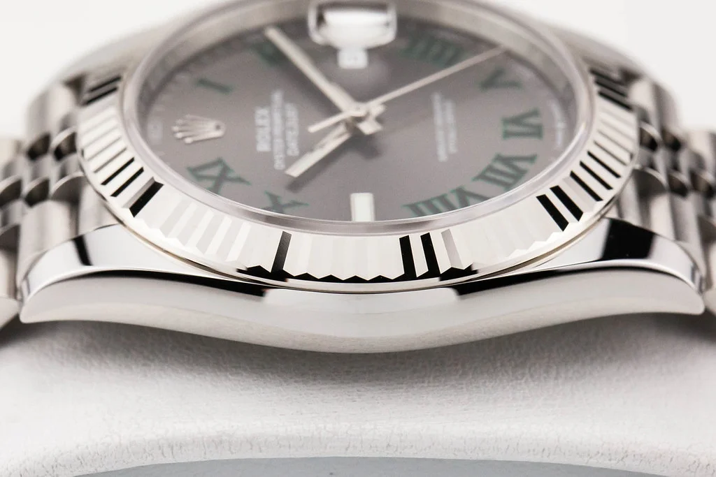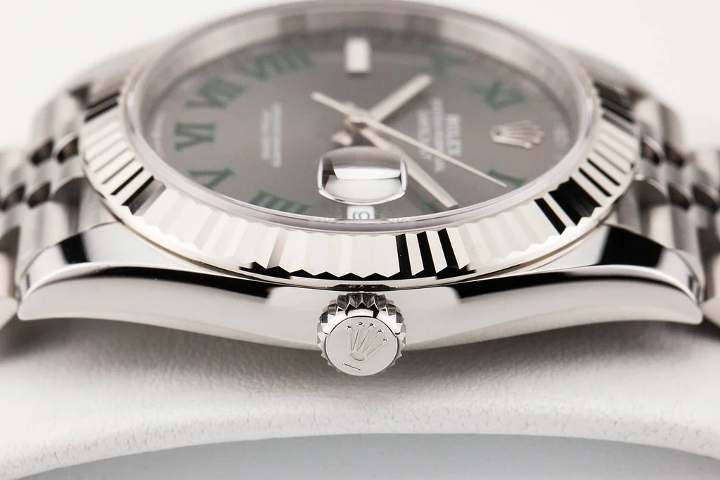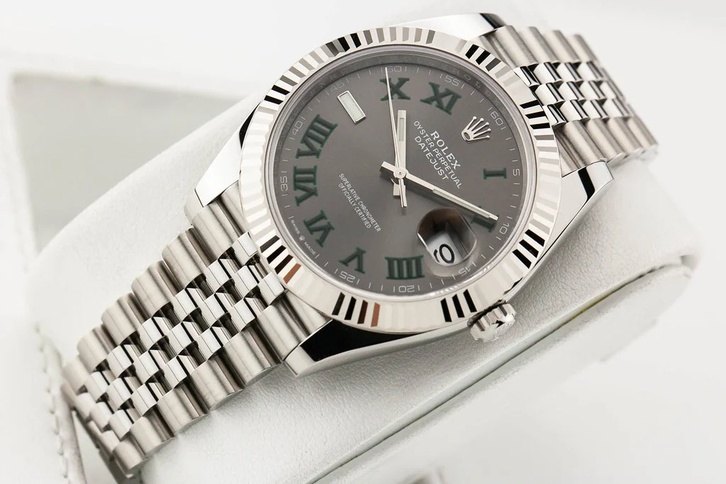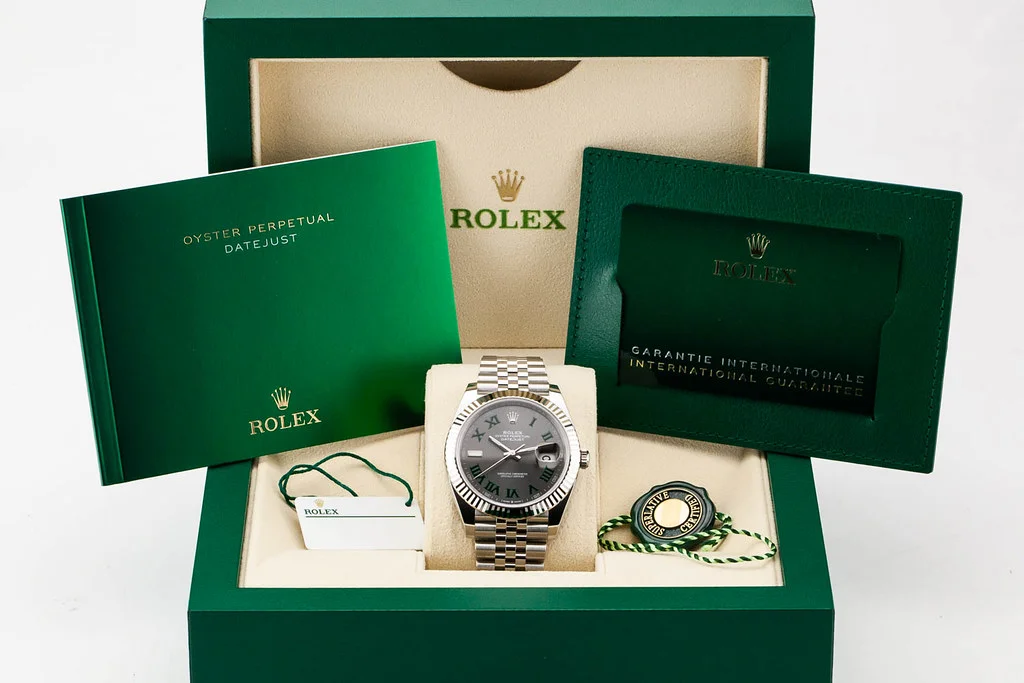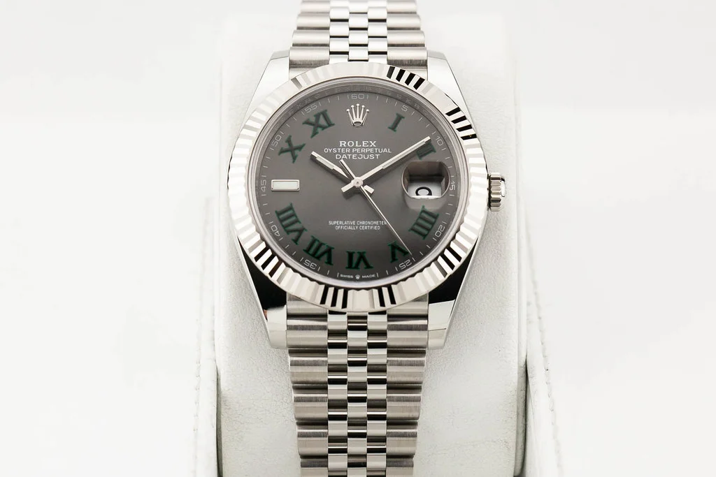 ·Up for sale is a brand new Rolex Datejust 41 Wimbledon Slate Dial Roman Numeral with Fluted Bezel on Jubilee Bracelet, reference # 126334 It comes complete with all boxes, papers, booklets, hang tags, and Rolex Warranty Card dated February 2025.