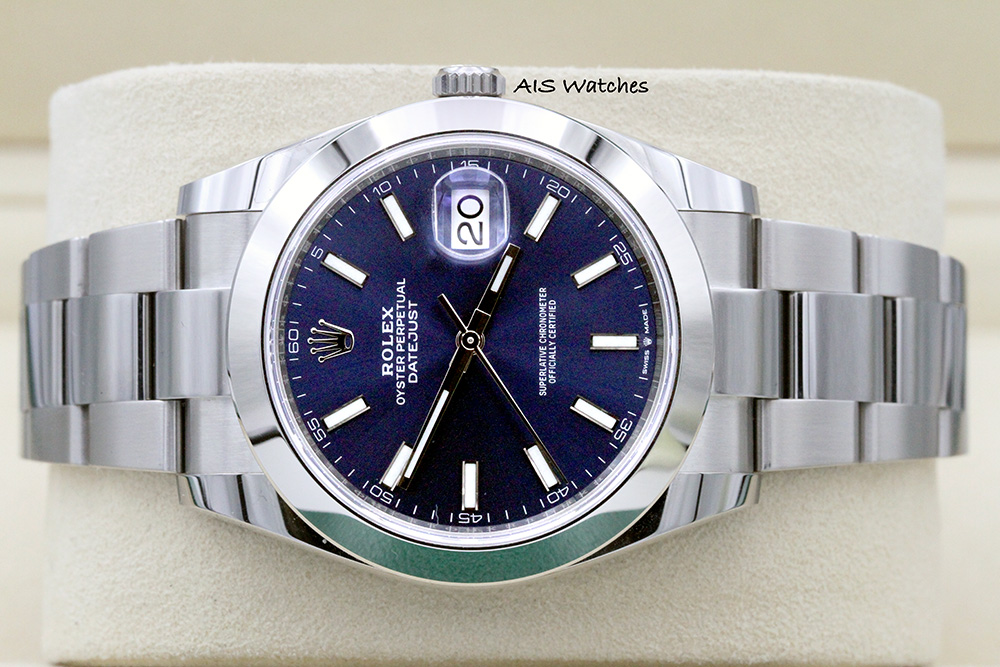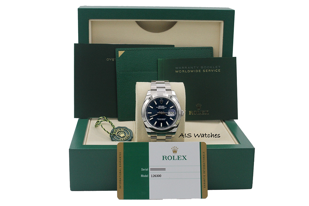 Up for sale is this Classic Rolex Datejust 41MM 126300 Blue Stick Dial Smooth Bezel Oyster Bracelet Stainless Steel Box & Papers. Watch is in excellent condition.