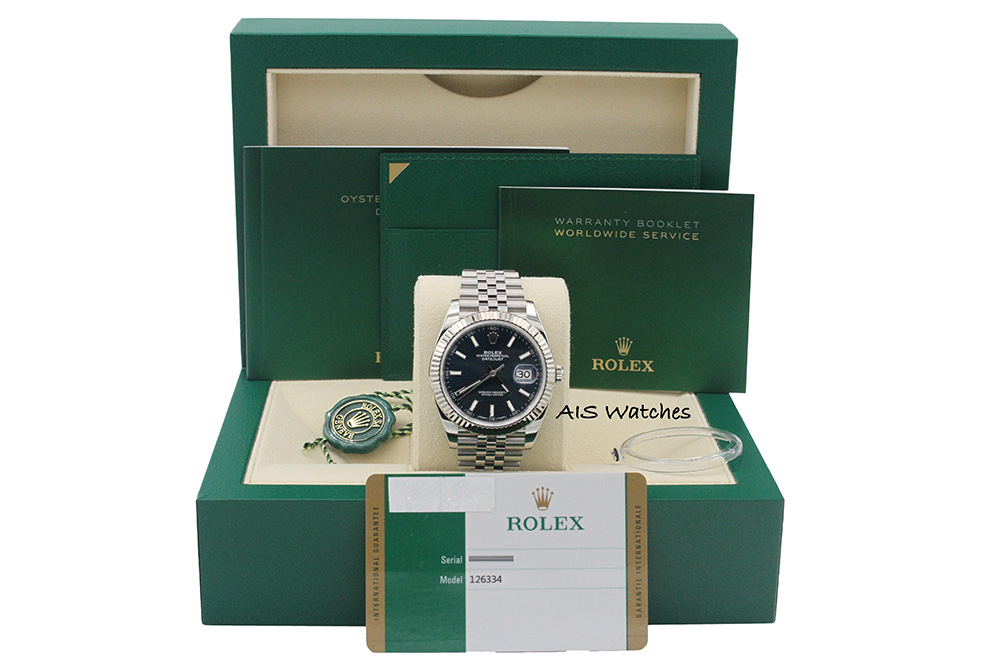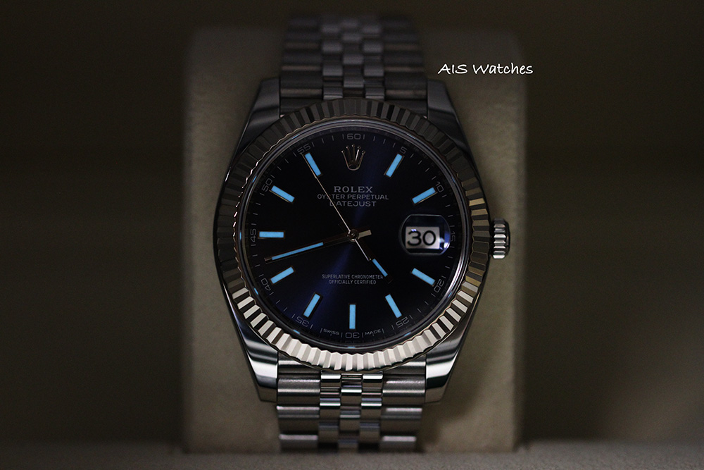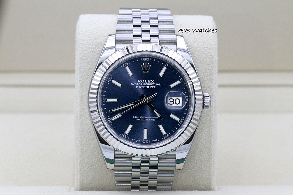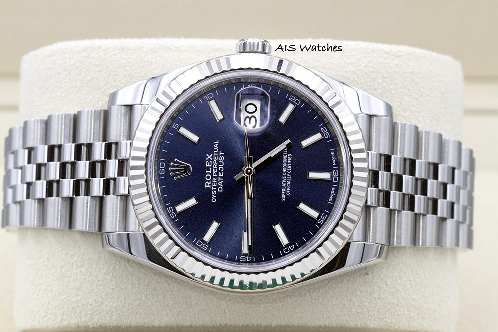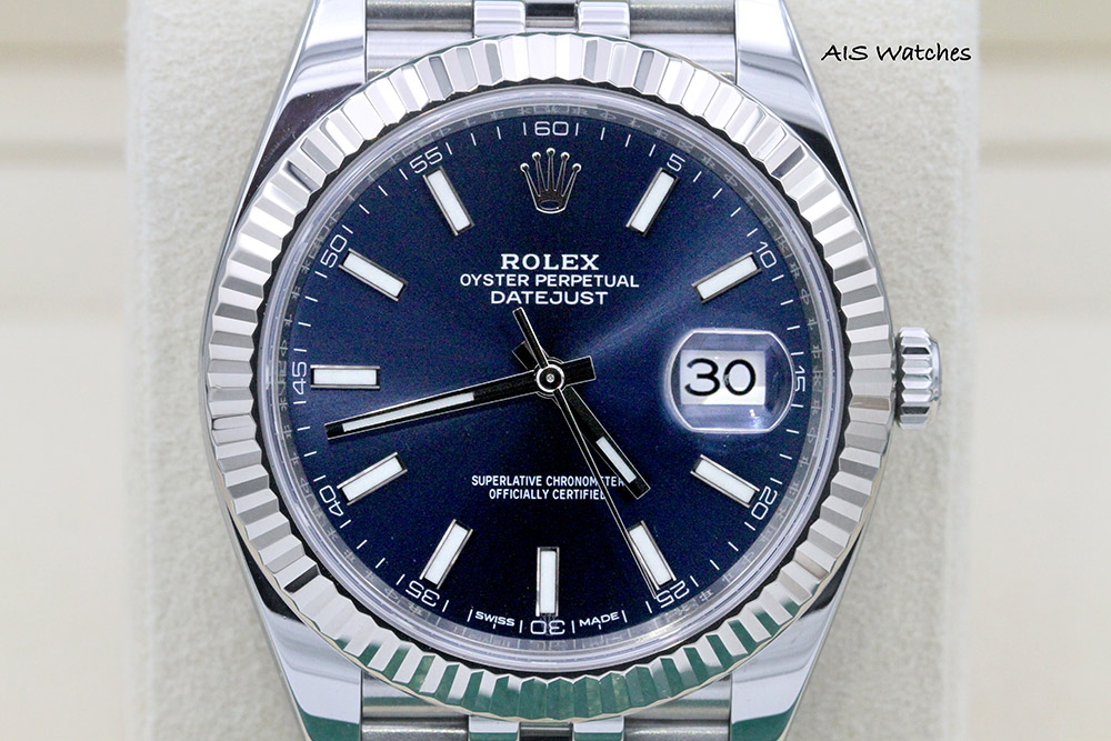 Up for sale is a Classic Rolex Datejust 41 MM 126334 Blue Stick Dial Jubilee Bracelet with 18K WG Fluted Bezel Box & Papers. Watch is in clean condition.
