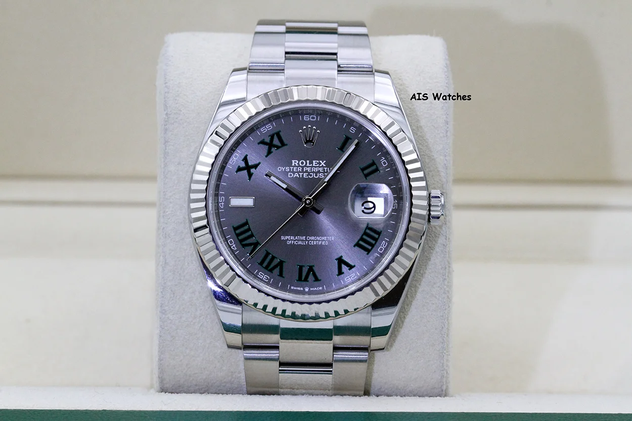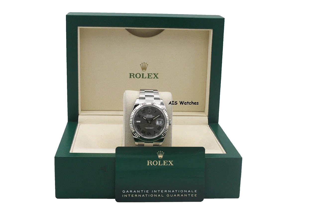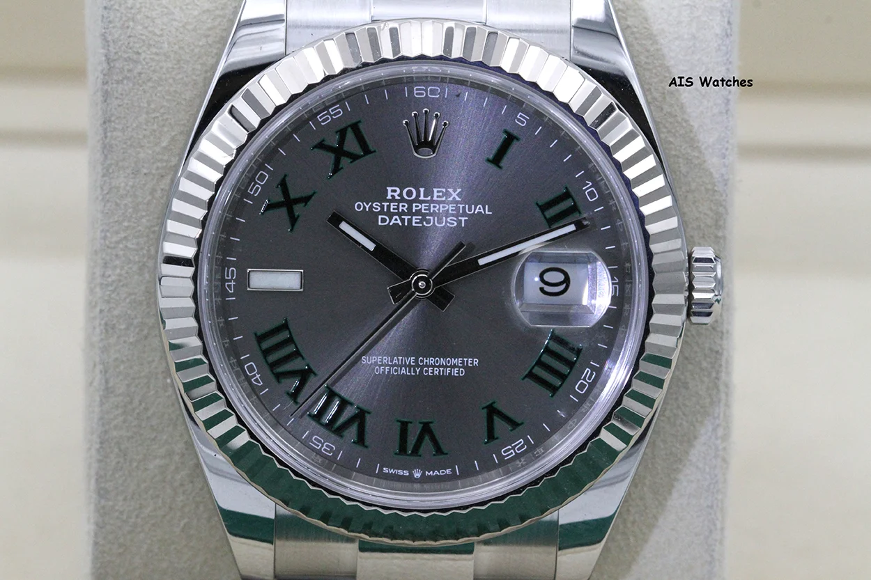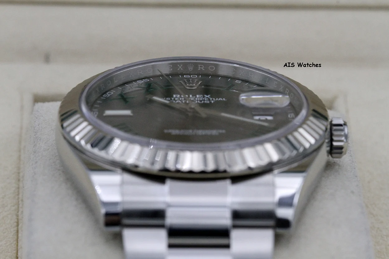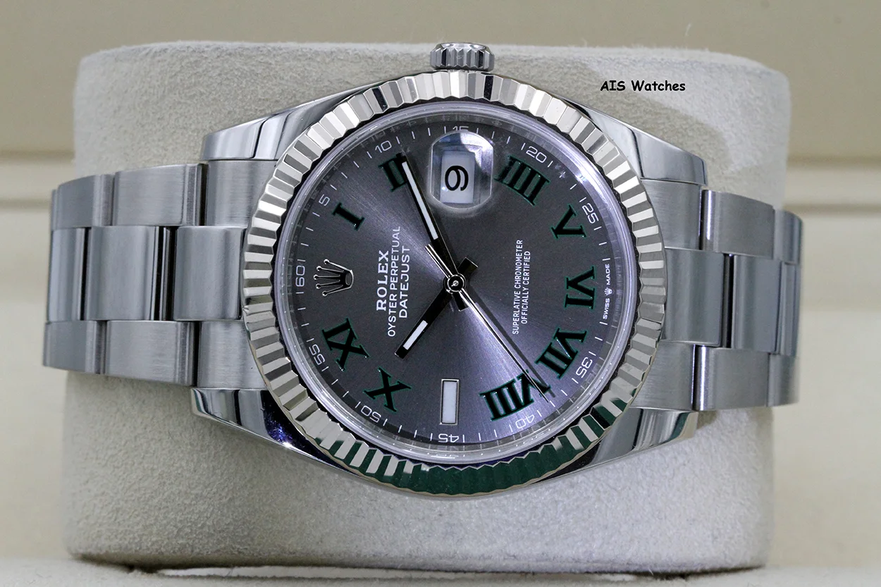 Up for sale is a Classic Rolex Datejust 41MM 126334 Wimbledon / Slate Roman Dial Oyster Bracelet with 18K WG Fluted Bezel Box & Papers. The timepiece is in excellent condition.