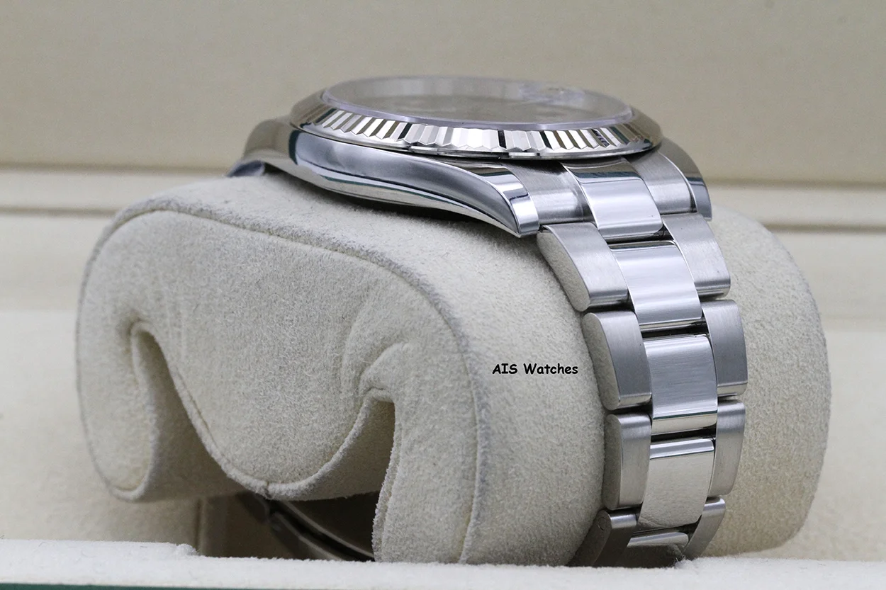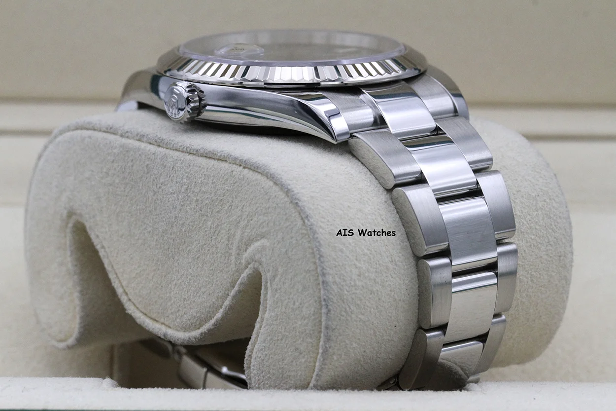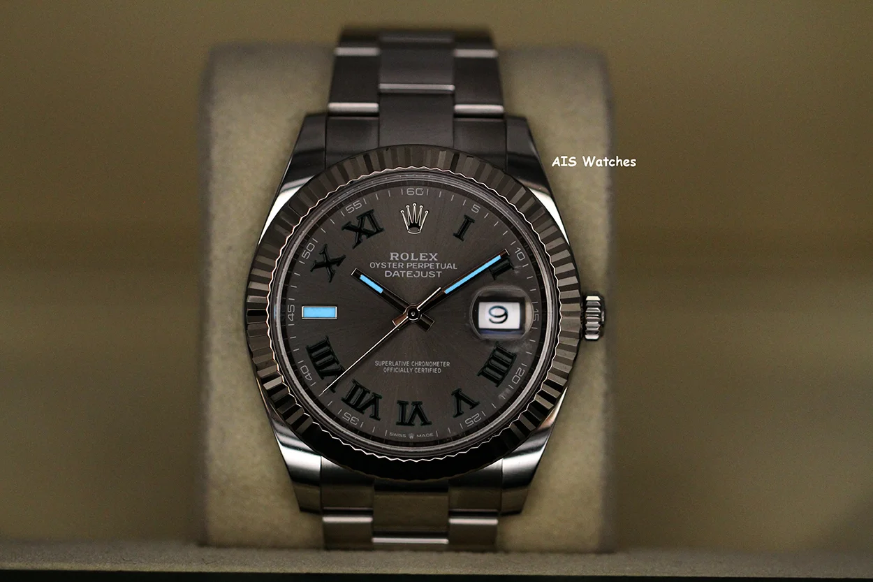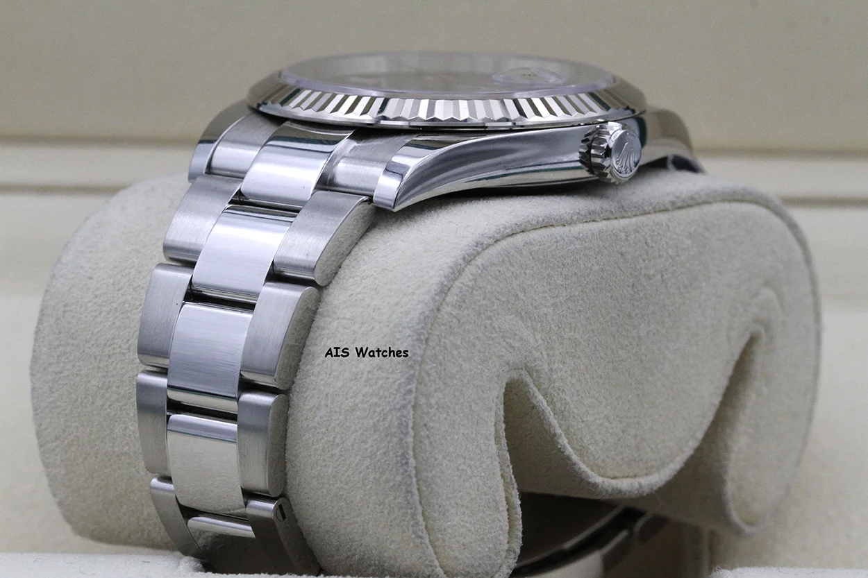 Up for sale is a Classic Rolex Datejust 41MM 126334 Wimbledon / Slate Roman Dial Oyster Bracelet with 18K WG Fluted Bezel Box & Papers. The timepiece is in excellent condition.
