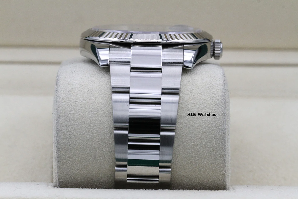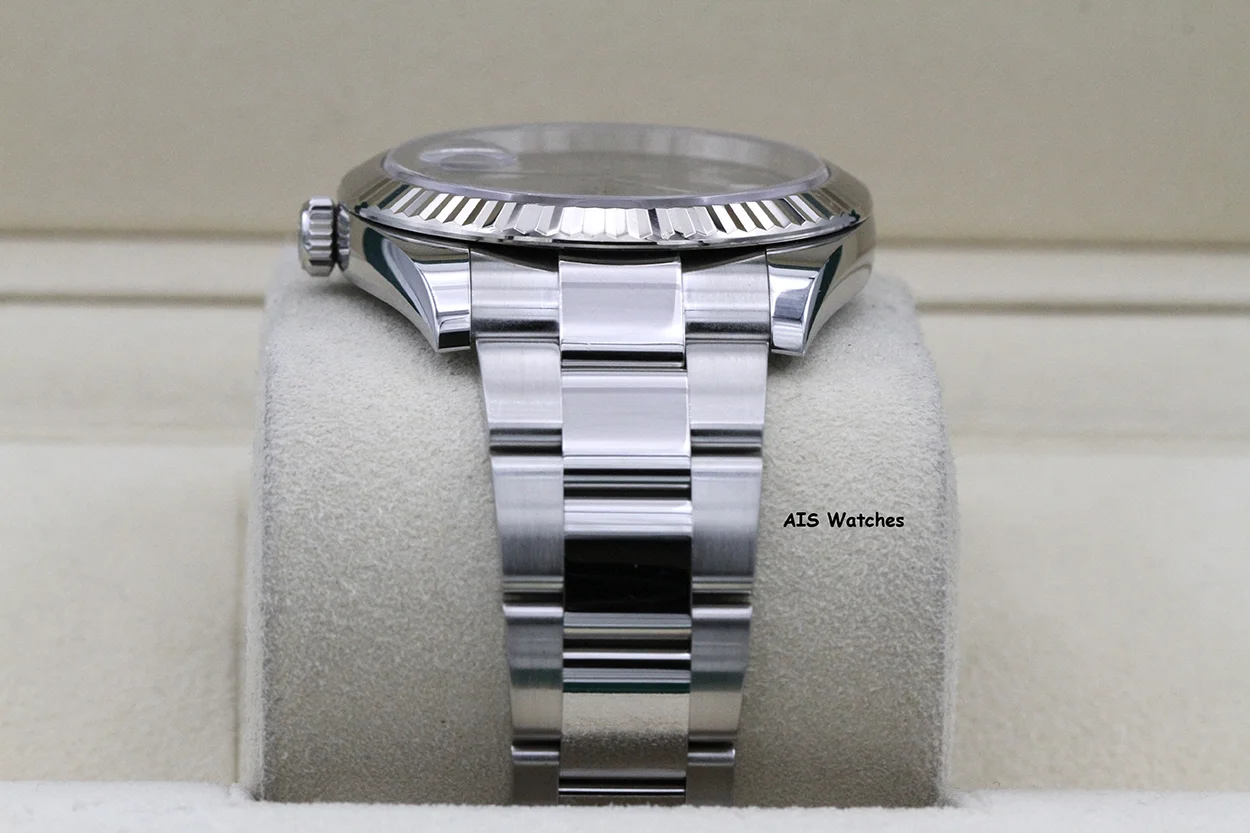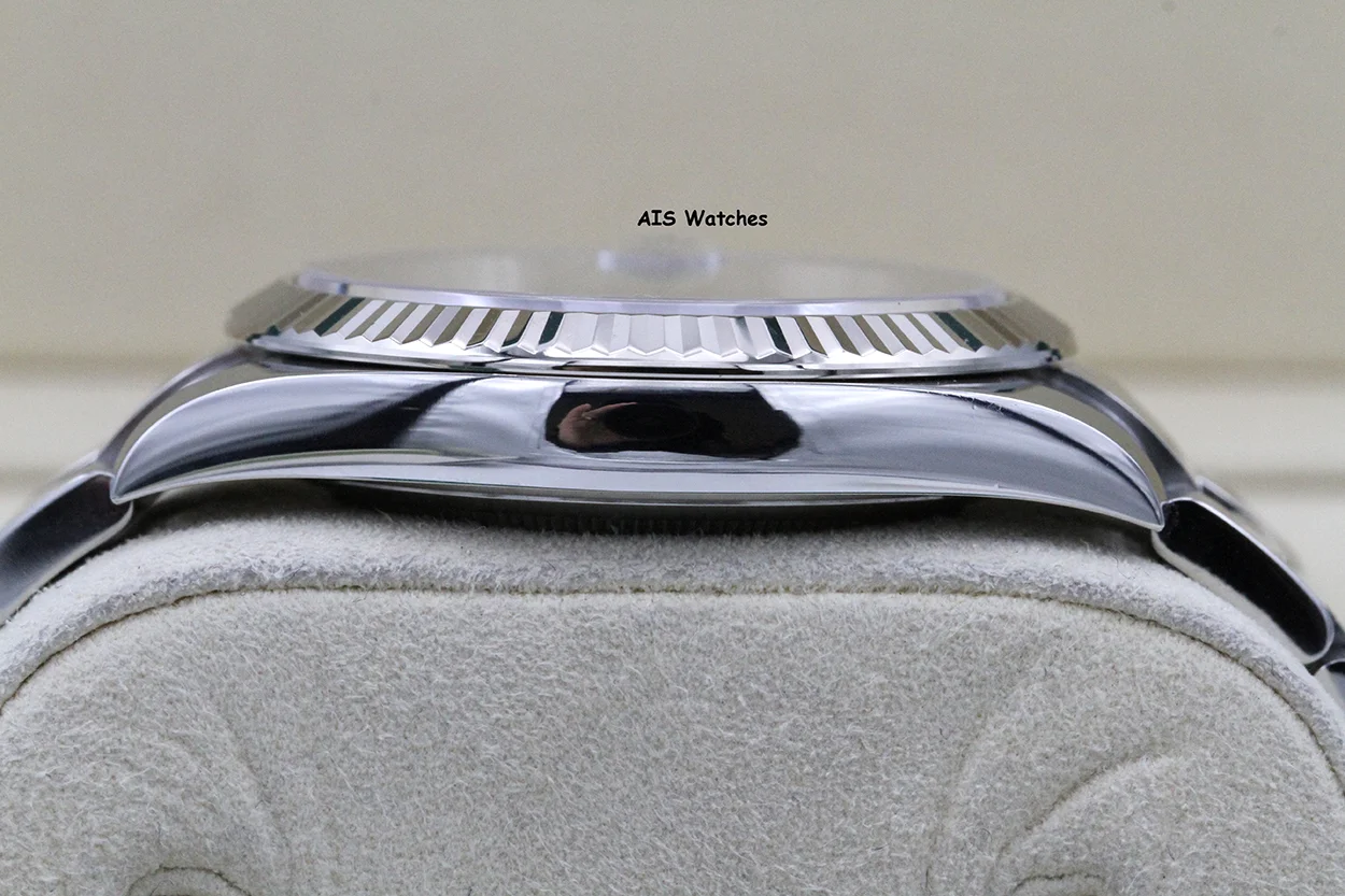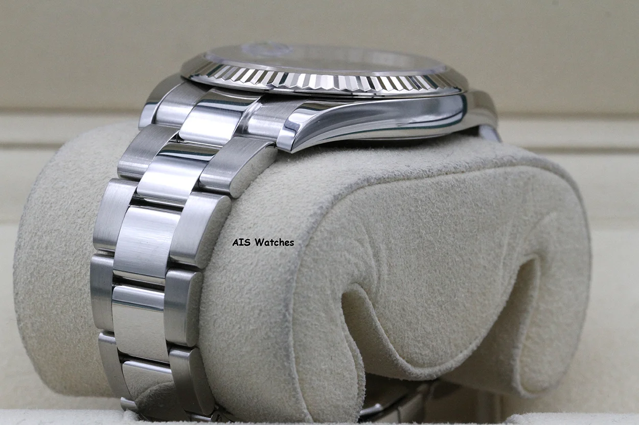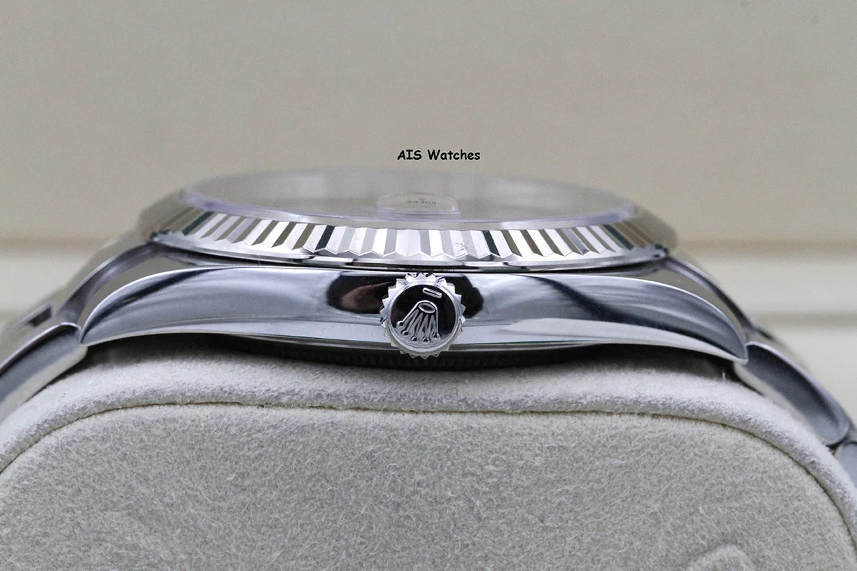 Up for sale is a Classic Rolex Datejust 41MM 126334 Wimbledon / Slate Roman Dial Oyster Bracelet with 18K WG Fluted Bezel Box & Papers. The timepiece is in excellent condition.
