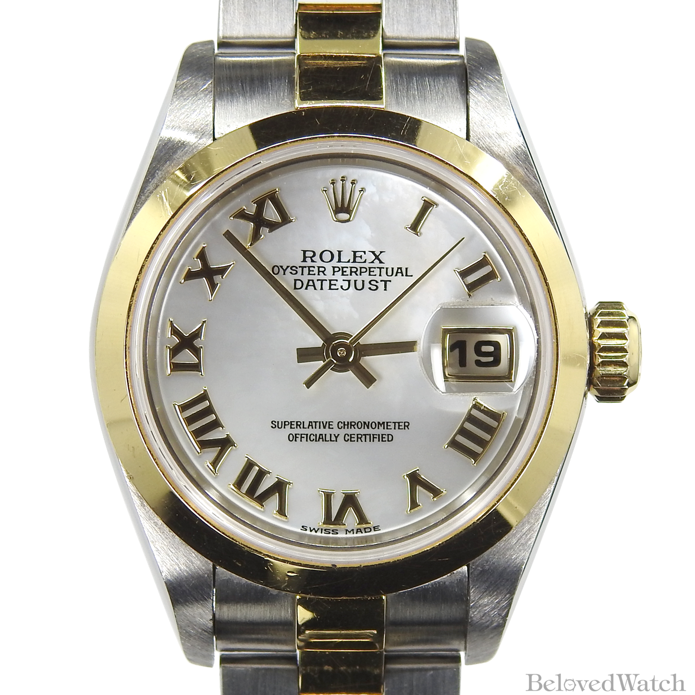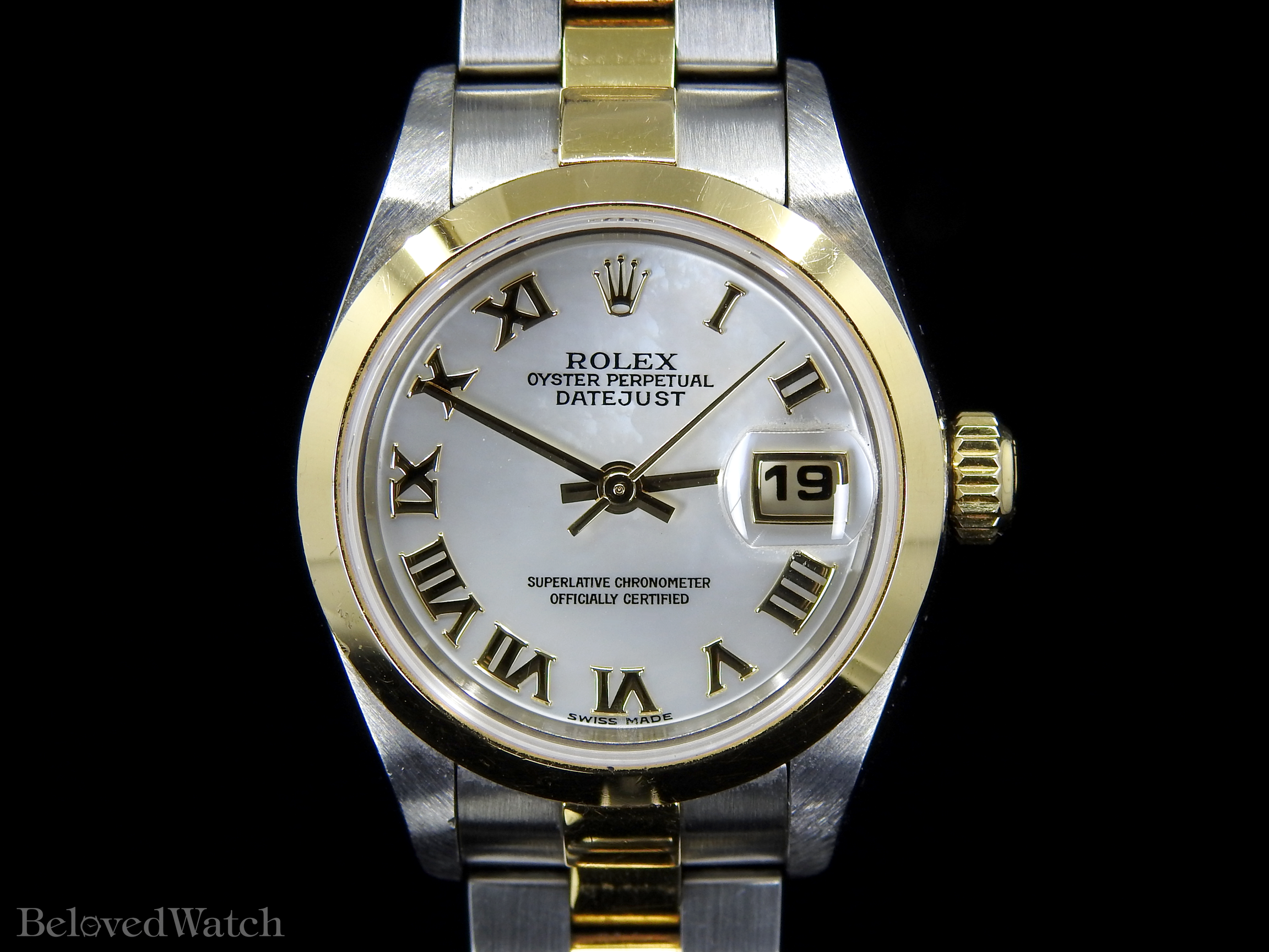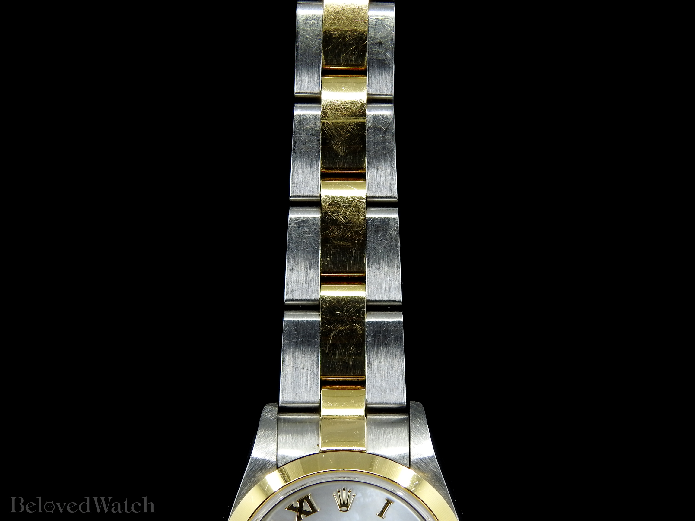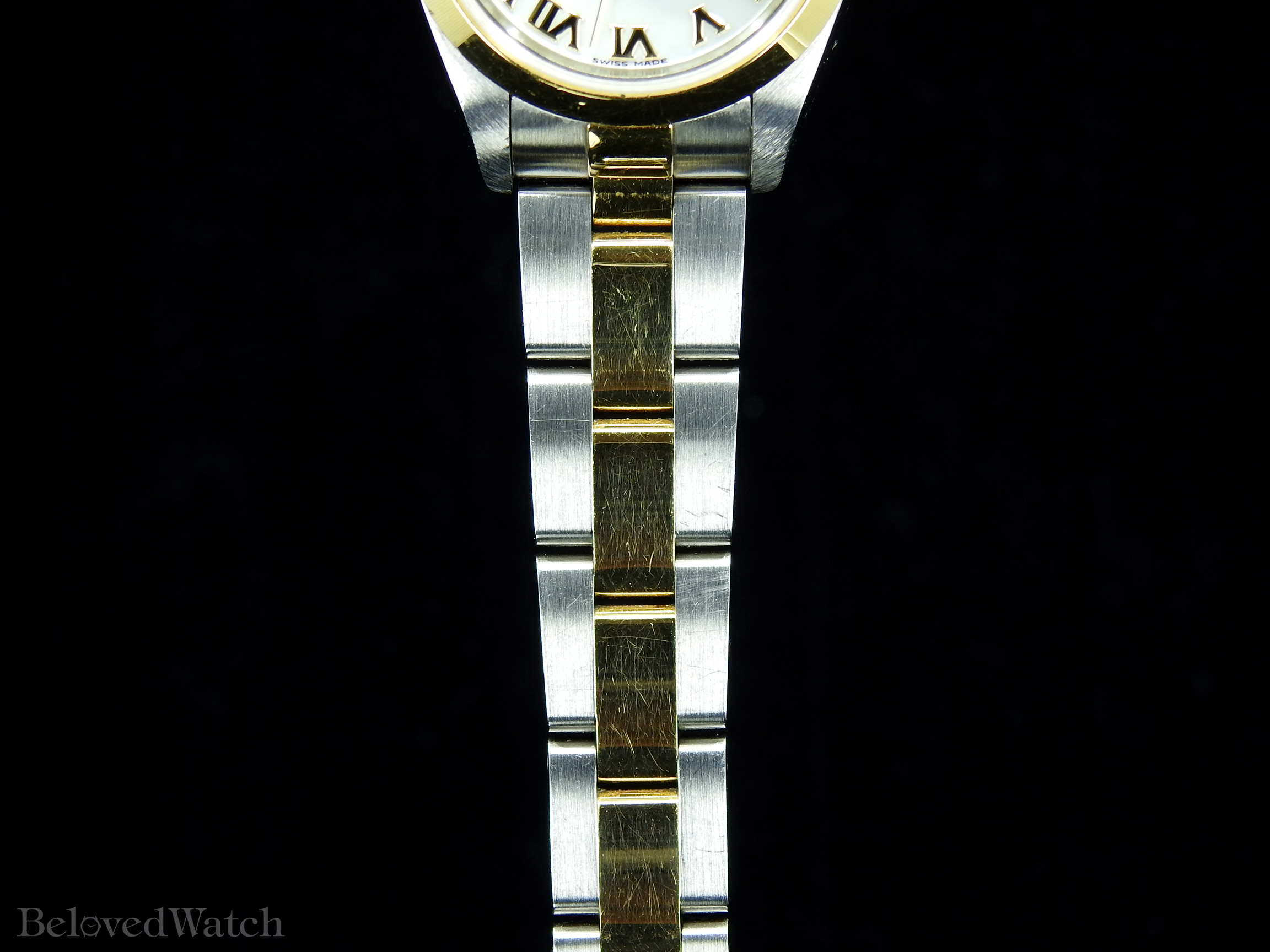 - Factory white mother of pearl dial with yellow gold Roman numeral hour markers.