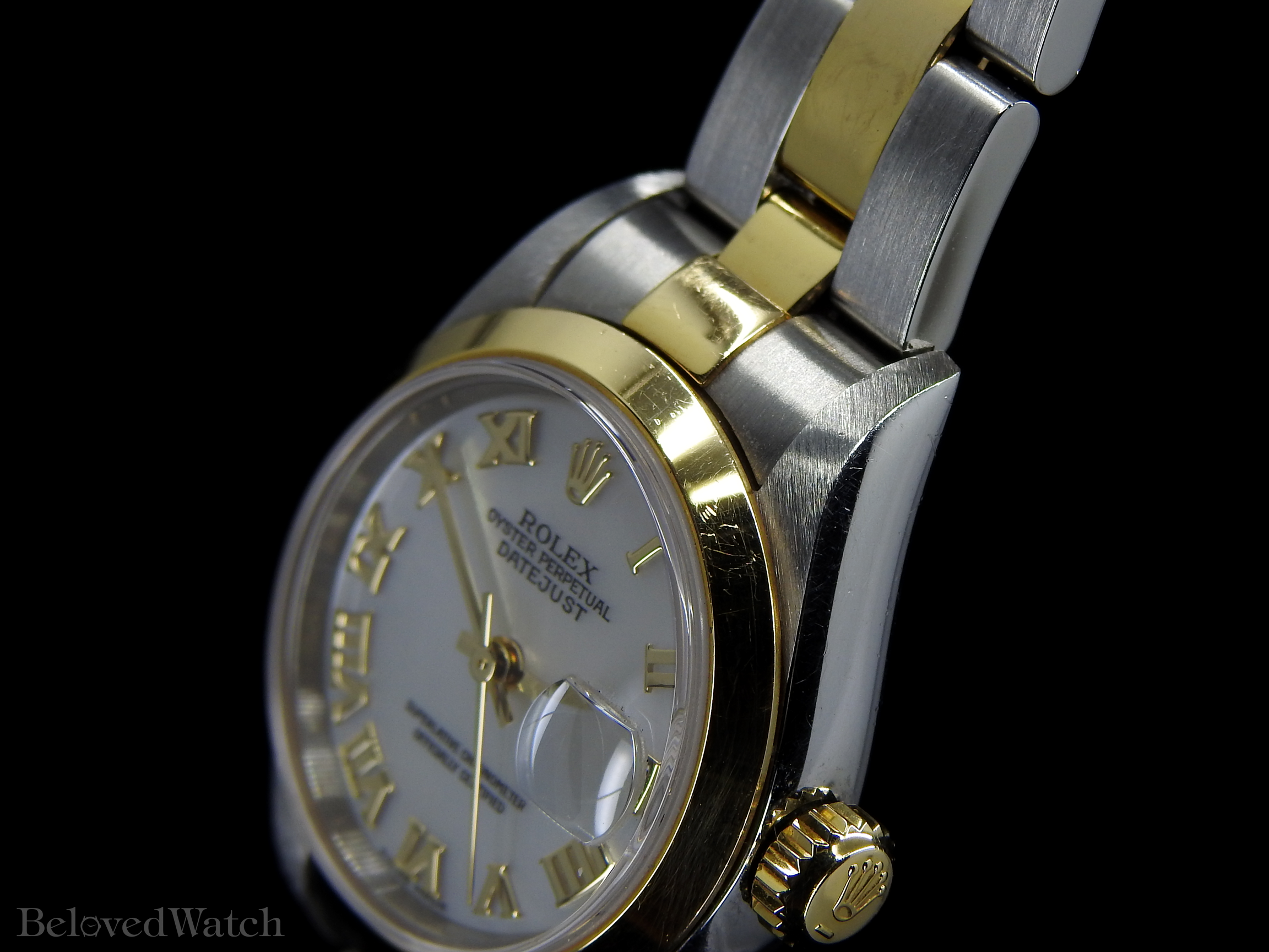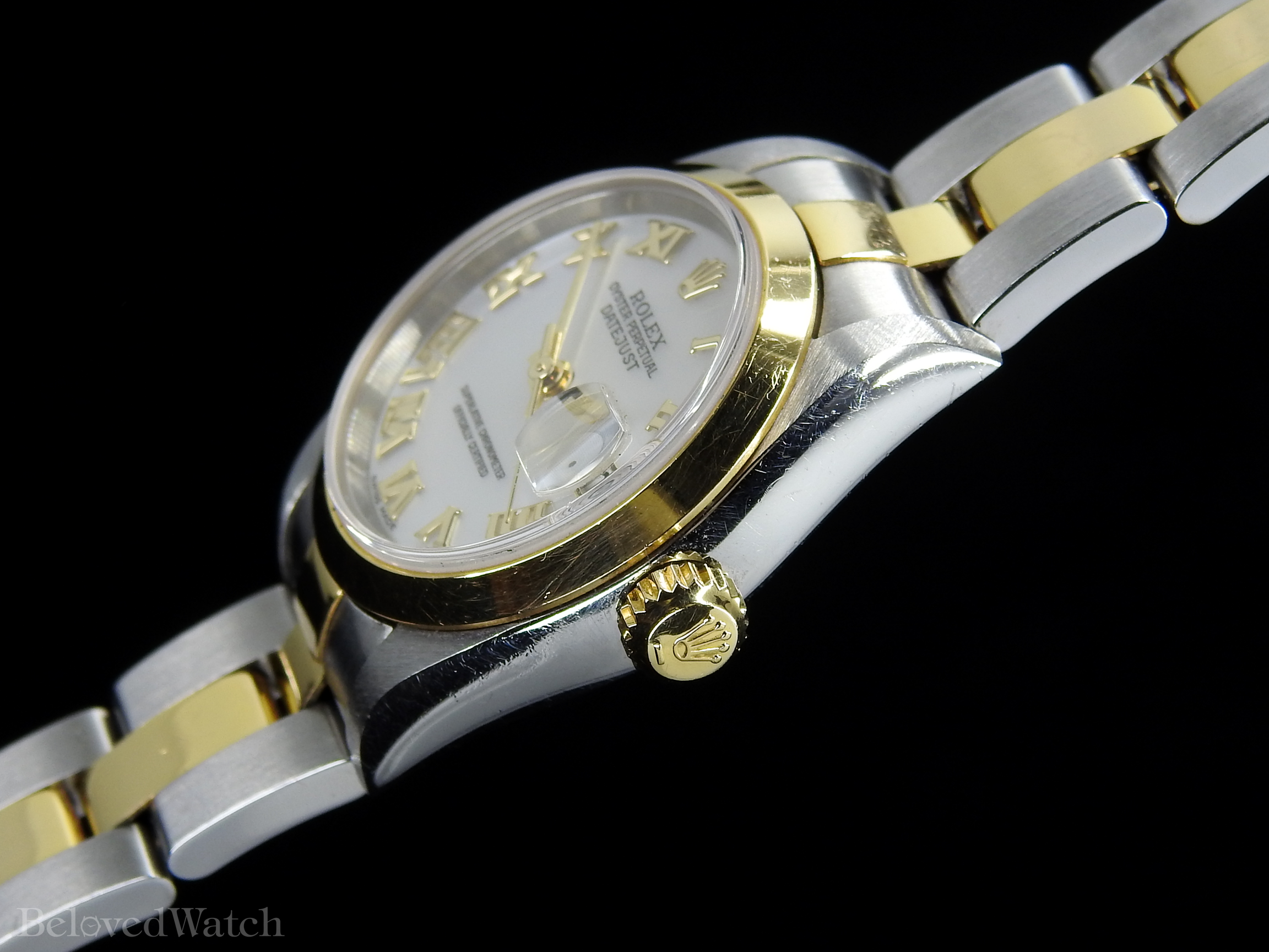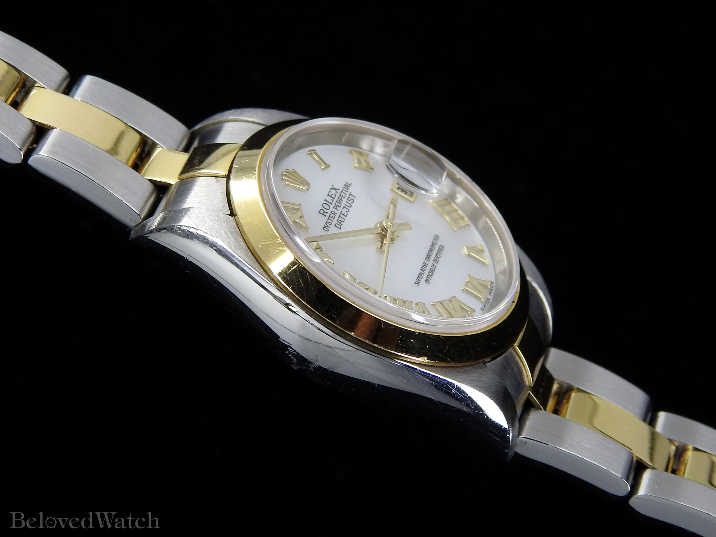- Factory white mother of pearl dial with yellow gold Roman numeral hour markers.