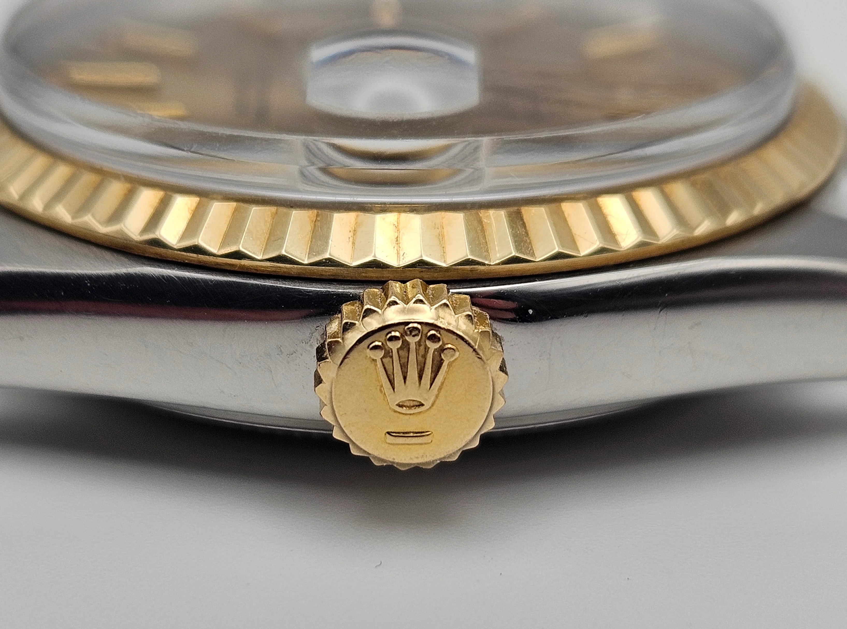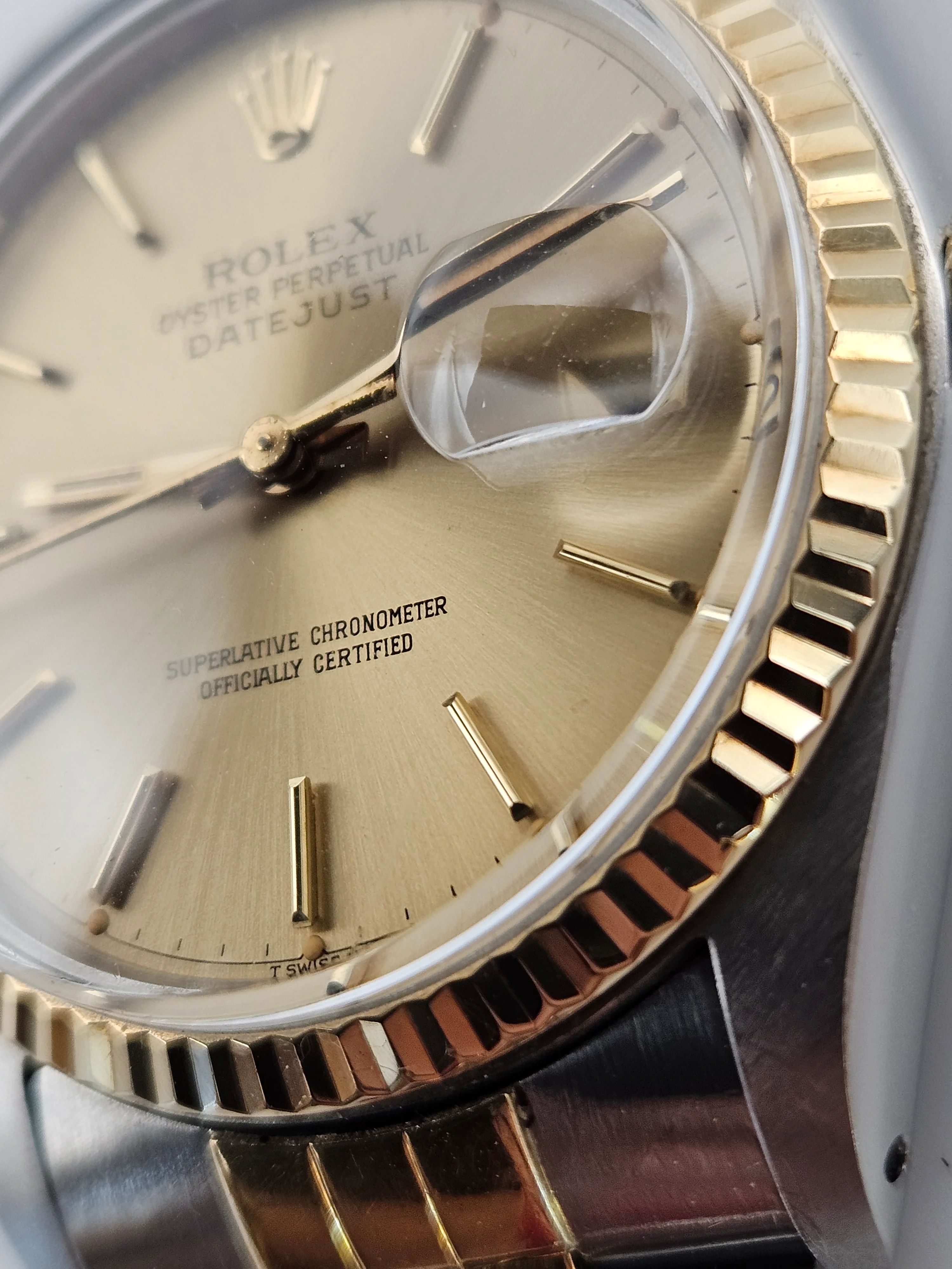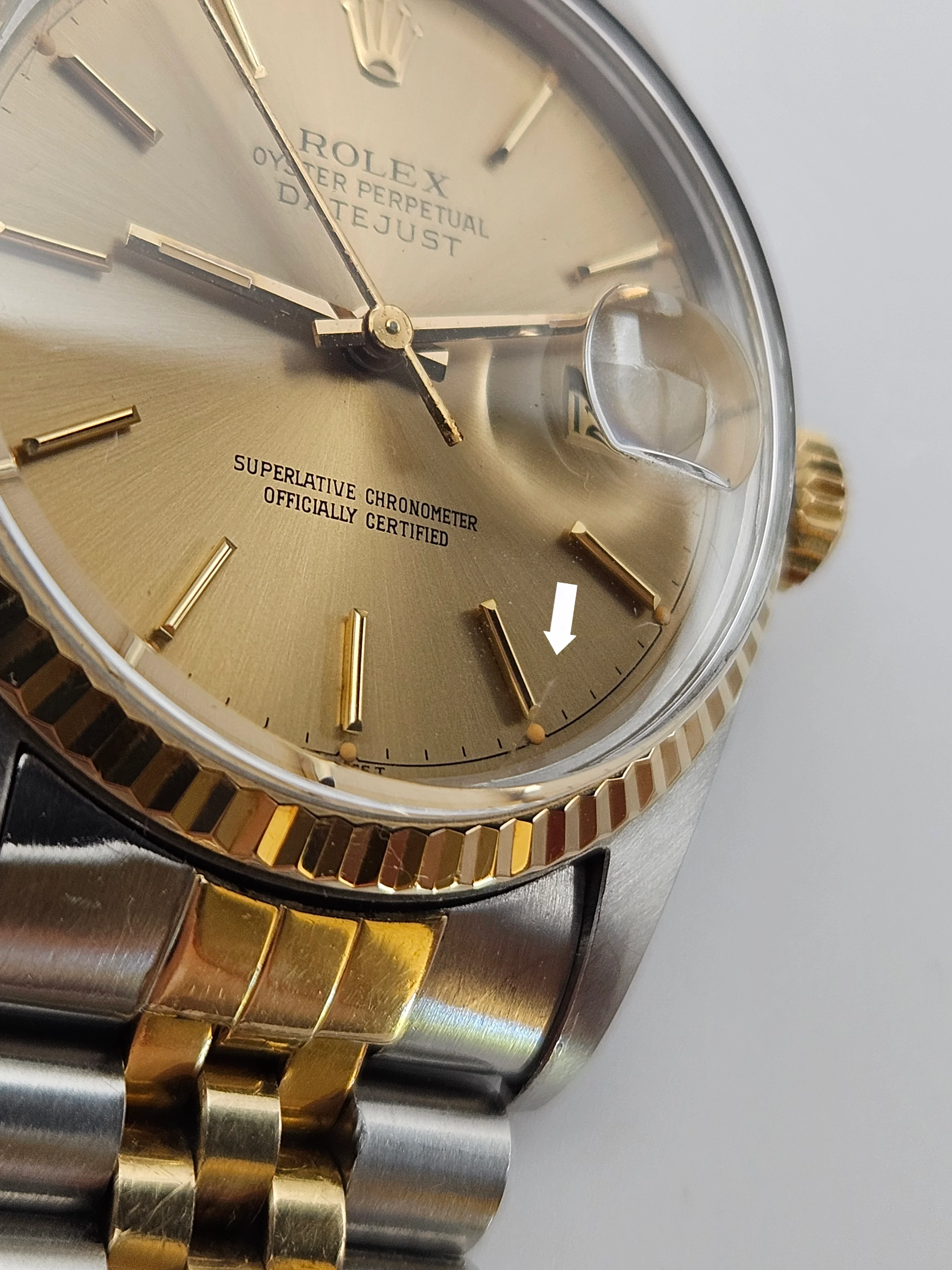 Mechanical Condition: Crown winds smooth. The date quickset function and and 12:00 date change over, are both in good working order.
