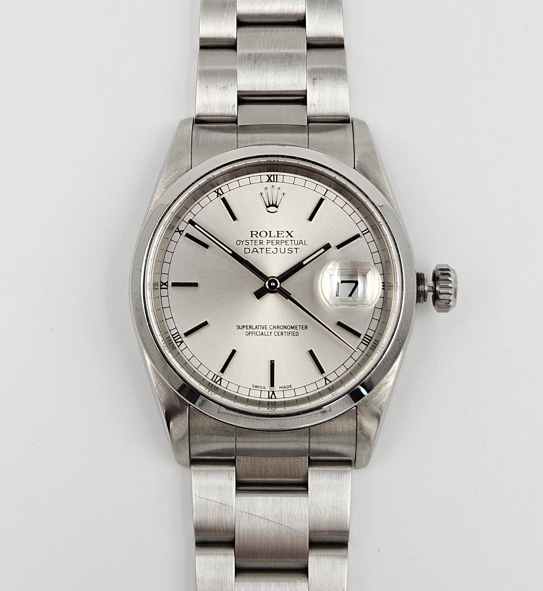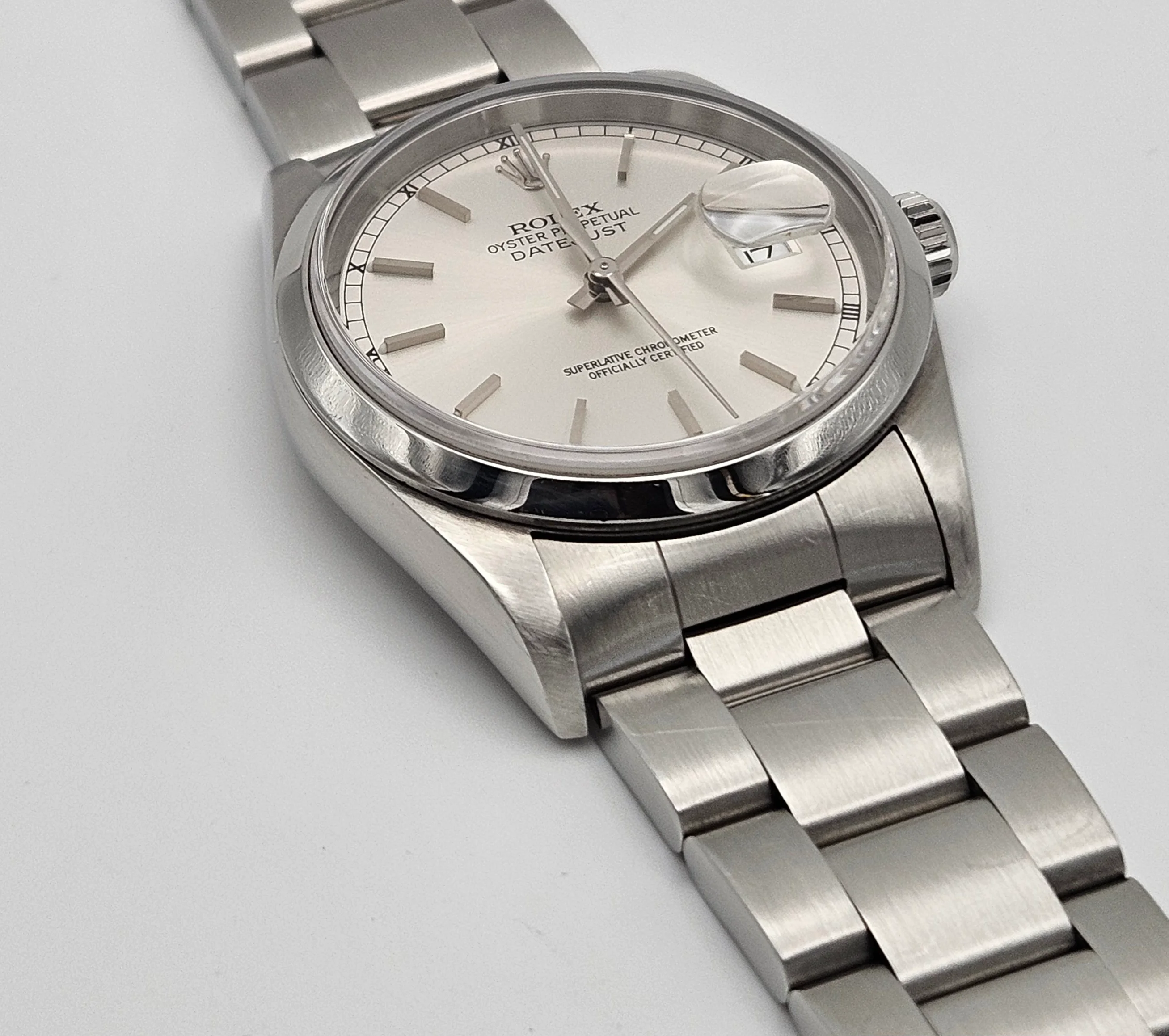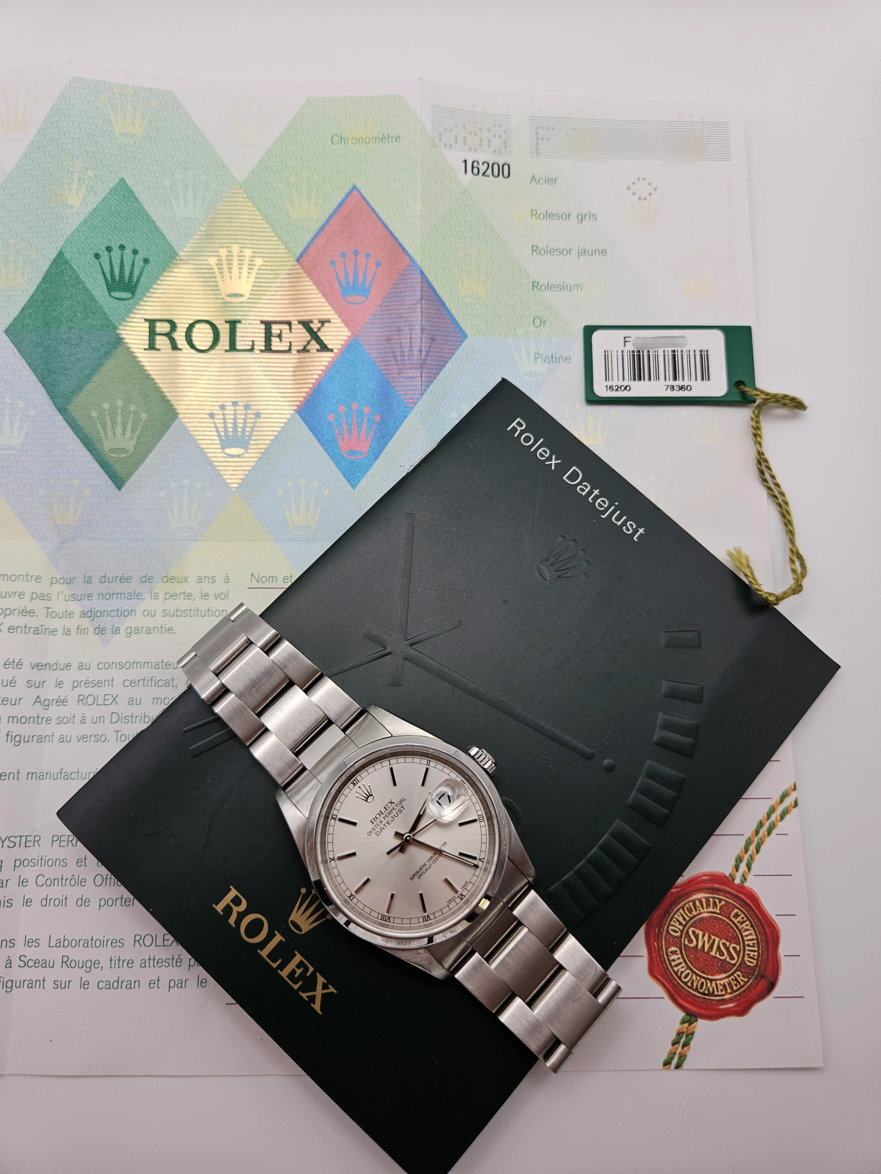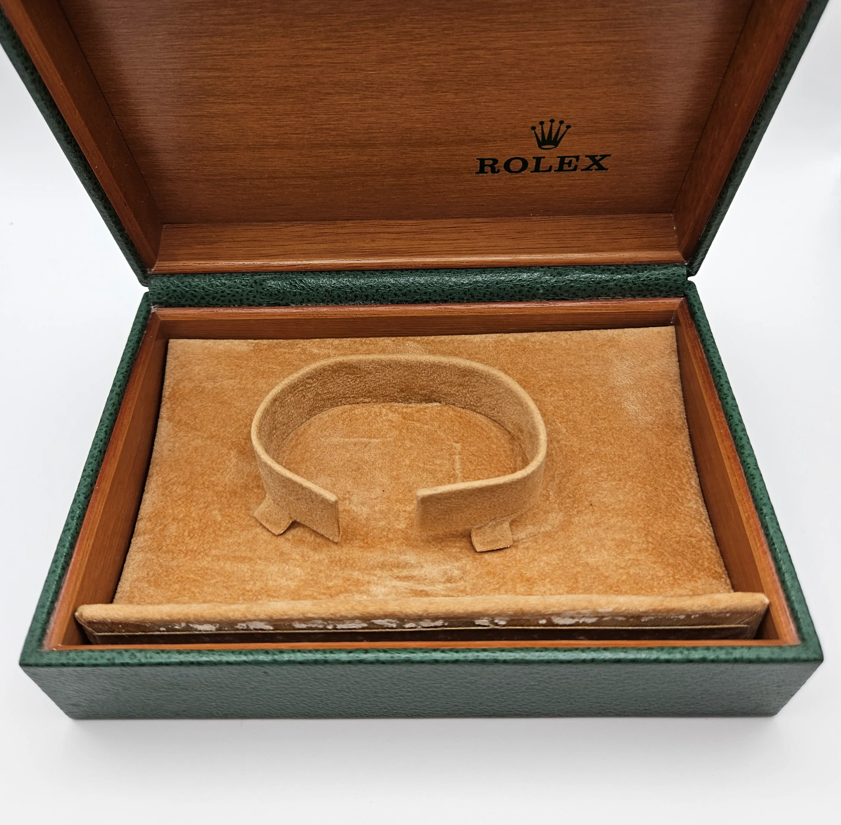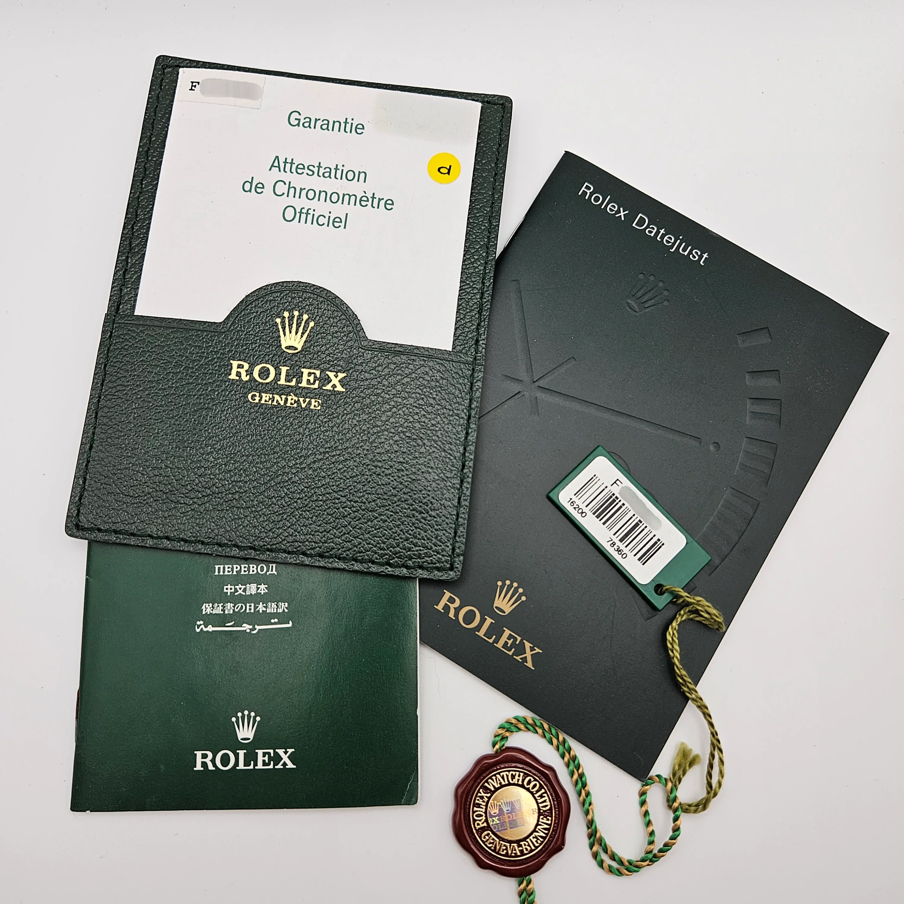 Box, Card, and Accessories: inner & outer boxes, punched papers (MAR 2004), serialized hang tag, red certified chronometer tag, warranty paper holder, Datejust booklet, and chronometer certification booklet. Please note the inlay cushion for the inner box does exhibit some curvature and does not sit flush with the bottom (not unusual for this style of box).