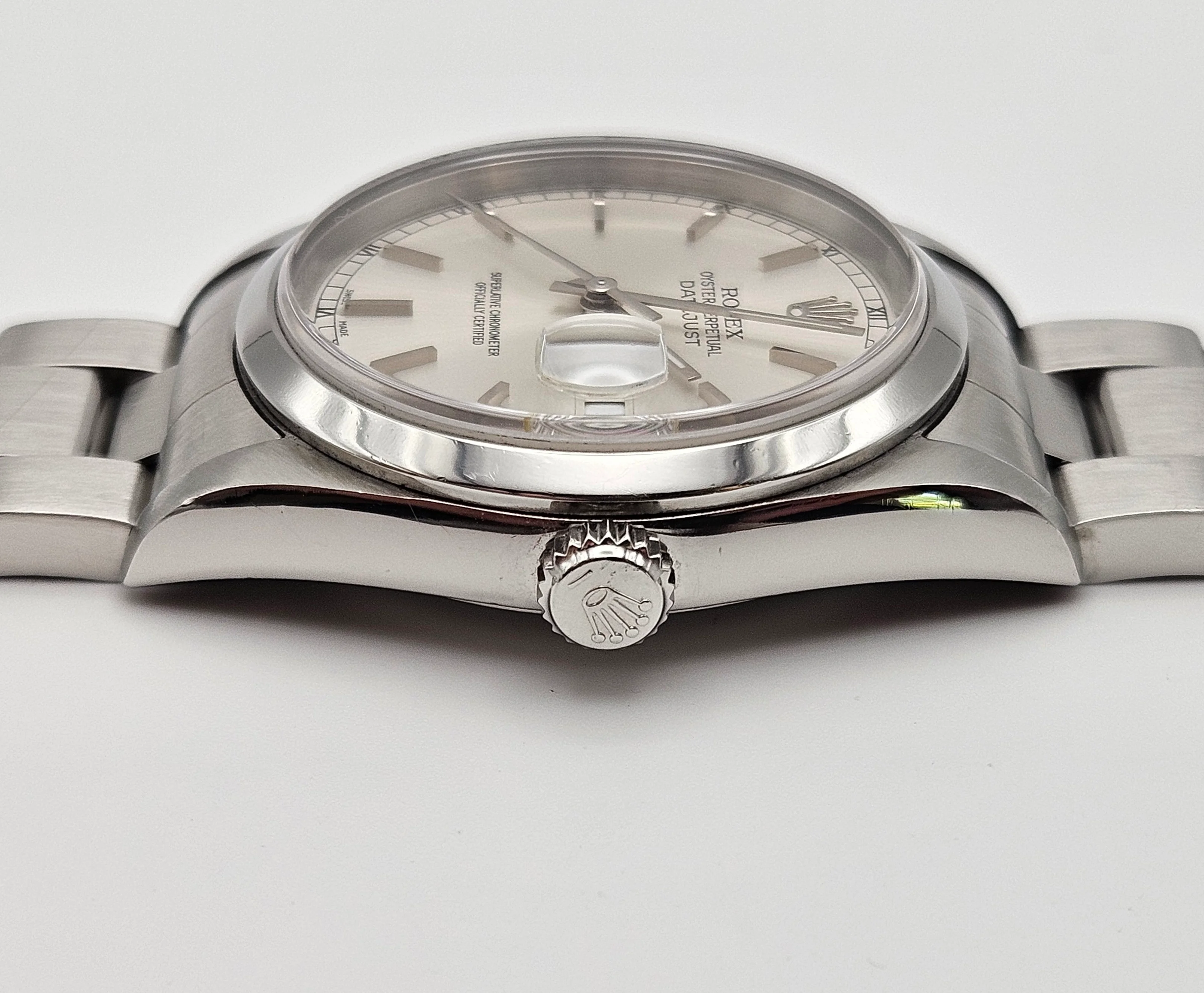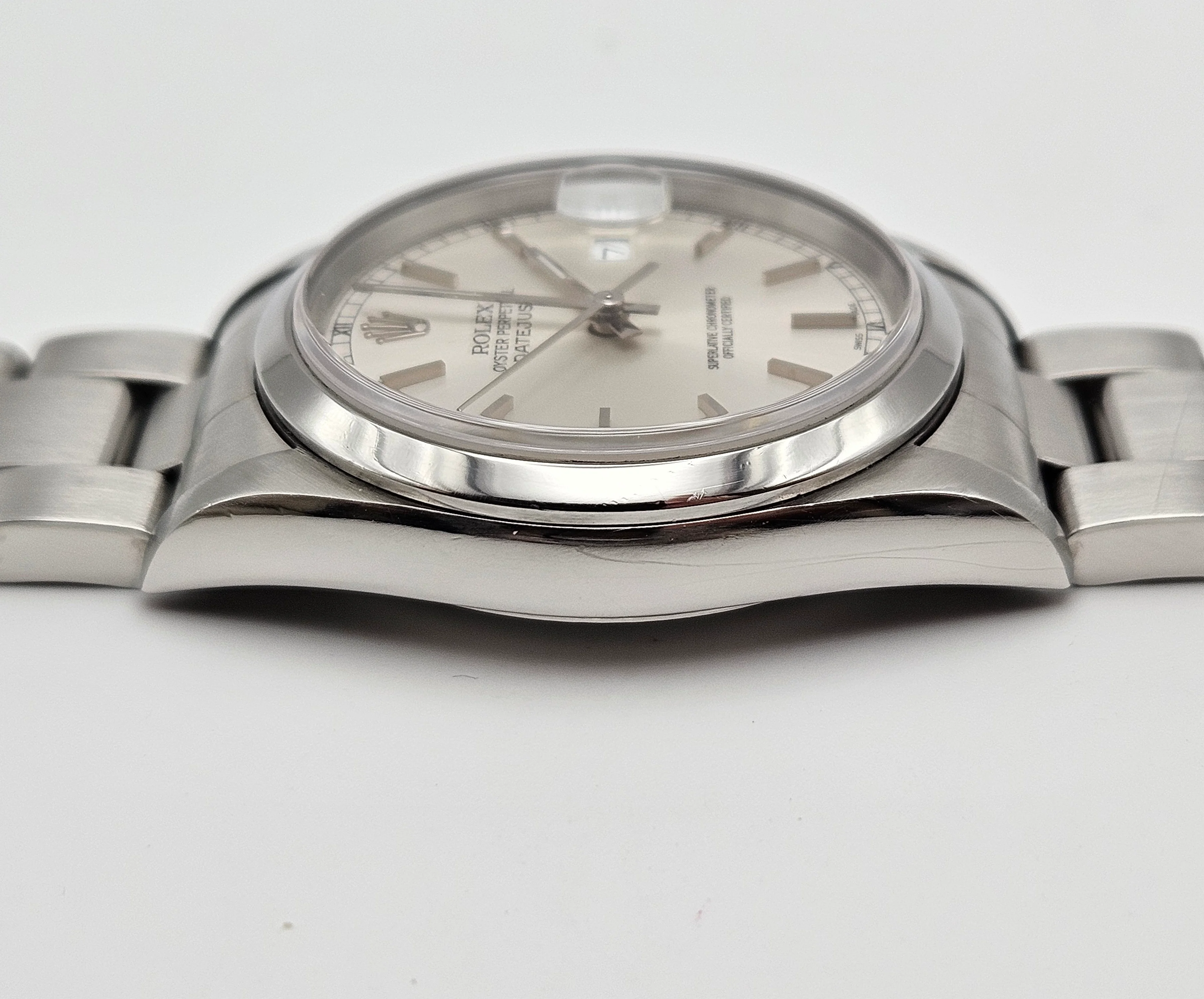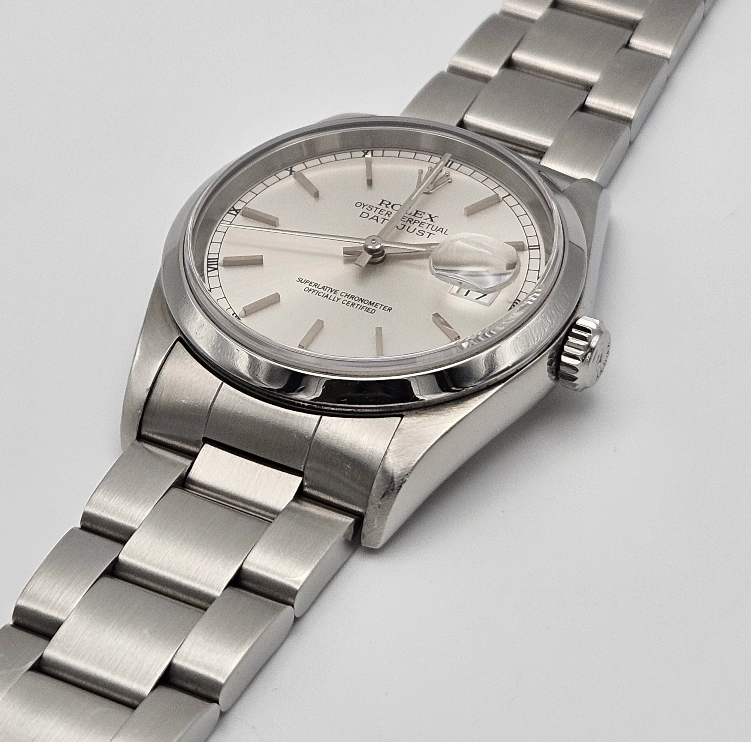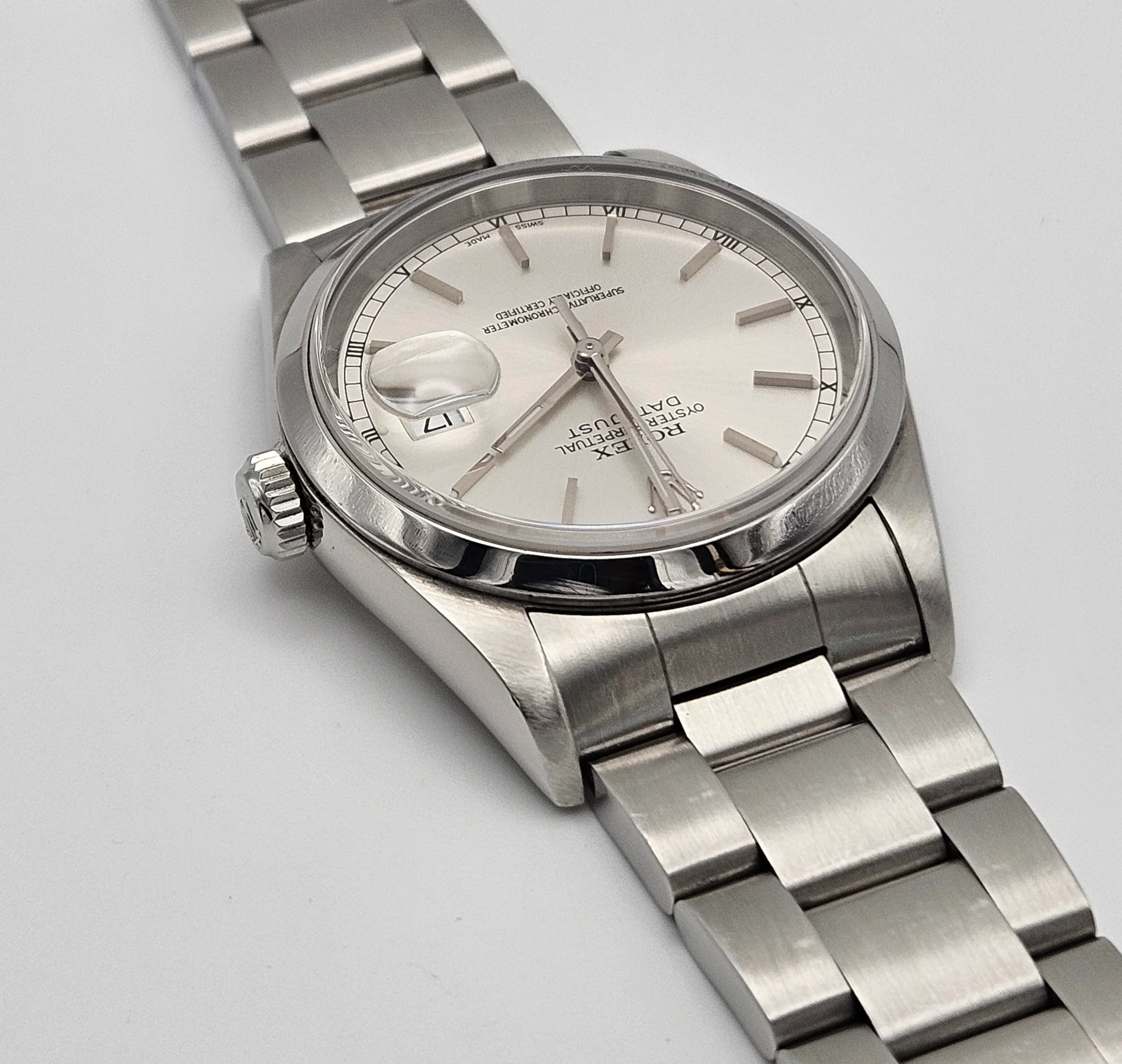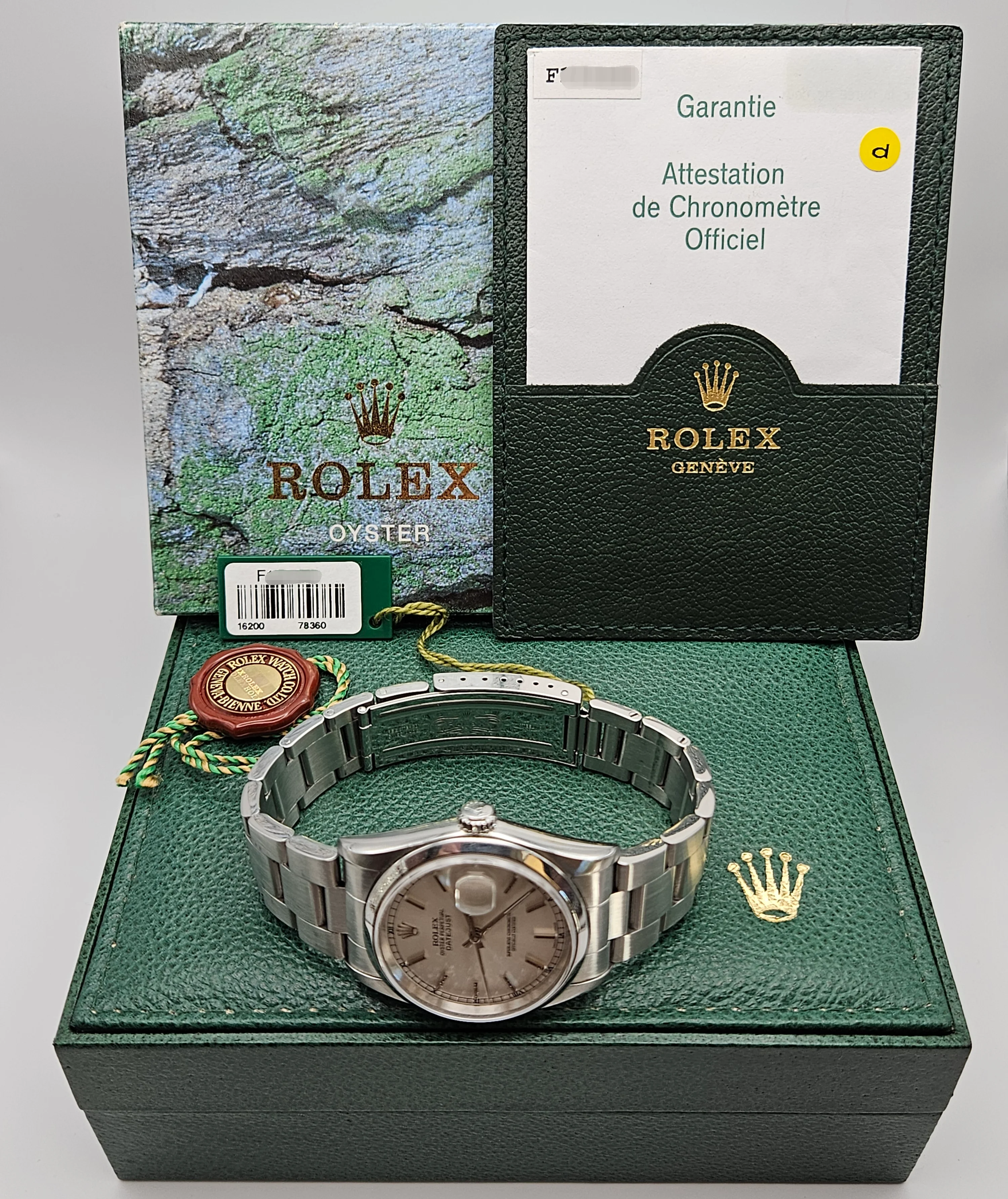 Box, Card, and Accessories: inner & outer boxes, punched papers (MAR 2004), serialized hang tag, red certified chronometer tag, warranty paper holder, Datejust booklet, and chronometer certification booklet. Please note the inlay cushion for the inner box does exhibit some curvature and does not sit flush with the bottom (not unusual for this style of box).